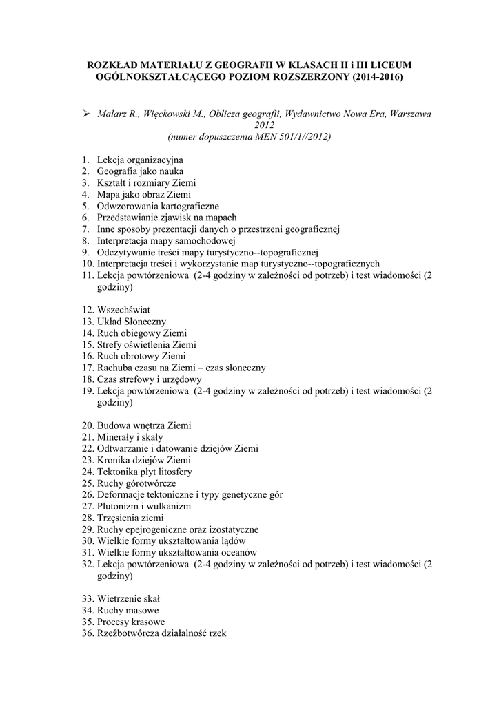 ROZKŁAD MATERIAŁU Z GEOGRAFII W KLASACH II i III LICEUM OGÓLNOKSZTAŁCĄCEGO POZIOM ROZSZERZONY (2014-2016) Malarz R., Więckowski M., Oblicza geografii, Wydawnictwo Nowa Era, Warszawa 2012 (numer dopuszczenia MEN 501/1//2012) 1. Lekcja organizacyjna 2. Geografia jako nauka 3. Kształt i rozmiary Ziemi 4. Mapa jako obraz Ziemi 5. Odwzorowania kartograficzne 6. Przedstawianie zjawisk na mapach 7. Inne sposoby prezentacji danych o przestrzeni geograficznej 8. Interpretacja mapy samochodowej 9. Odczytywanie treści mapy turystyczno--topograficznej 10. Interpretacja treści i wykorzystanie map turystyczno--topograficznych 11. Lekcja powtórzeniowa (2-4 godziny w zależności od potrzeb) i test wiadomości (2 godziny) 12. Wszechświat 13. Układ Słoneczny 14. Ruch obiegowy Ziemi 15. Strefy oświetlenia Ziemi 16. Ruch obrotowy Ziemi 17. Rachuba czasu na Ziemi – czas słoneczny 18. Czas strefowy i urzędowy 19. Lekcja powtórzeniowa (2-4 godziny w zależności od potrzeb) i test wiadomości (2 godziny) 20. Budowa wnętrza Ziemi 21. Minerały i skały 22. Odtwarzanie i datowanie dziejów Ziemi 23. Kronika dziejów Ziemi 24. Tektonika płyt litosfery 25. Ruchy górotwórcze 26. Deformacje tektoniczne i typy genetyczne gór 27. Plutonizm i wulkanizm 28. Trzęsienia ziemi 29. Ruchy epejrogeniczne oraz izostatyczne 30. Wielkie formy ukształtowania lądów 31. Wielkie formy ukształtowania oceanów 32. Lekcja powtórzeniowa (2-4 godziny w zależności od potrzeb) i test wiadomości (2 godziny) 33. Wietrzenie skał 34. Ruchy masowe 35. Procesy krasowe 36. Rzeźbotwórcza działalność rzek 37. Rzeźbotwórcza działalność lodowców górskich 38. Rzeźbotwórcza działalność lądolodów i wód polodowcowych 39. Rzeźbotwórcza działalność wiatru 40. Rzeźbotwórcza działalność morza 41. Typy wybrzeży morskich 42. Lekcja powtórzeniowa (2-4 godziny w zależności od potrzeb) i test wiadomości (2 godziny) 43. Skład i budowa atmosfery 44. Obieg ciepła 45. Czynniki kształtujące rozkład temperatury 46. Ruchy powietrza atmosferycznego 47. Globalna cyrkulacja atmosfery. Pasaty i monsuny 48. Rodzaje wiatrów lokalnych 49. Wilgotność powietrza i opady atmosferyczne 50. Masy powietrza i fronty atmosferyczne 51. Prognozowanie pogody 52. Klimaty kuli ziemskiej 53. Zmiany atmosfery i klimatu 54. Ekstremalne zjawiska atmosferyczne i ich skutki 55. Lekcja powtórzeniowa (2-4 godziny w zależności od potrzeb) i test wiadomości (2 godziny) 56. Cykl hydrologiczny 57. Oceany i morza 58. Dynamika oceanów – prądy morskie, falowanie 59. Dynamika oceanów – pływy morskie, sejsze, upwelling 60. Zróżnicowanie sieci rzecznej na Ziemi 61. Ustroje rzeczne 62. Jeziora 63. Lodowce górskie 64. Lądolody i wieloletnia zmarzlina 65. Wody podziemne 66. Lekcja powtórzeniowa (2-4 godziny w zależności od potrzeb) i test wiadomości (2 godziny) 67. Powstawanie gleb 68. Typy genetyczne gleb 69. Świat roślin 70. Świat zwierząt 71. Strefy krajobrazowe na Ziemi 72. Interakcje między poszczególnymi sferami Ziemi 73. Lekcja powtórzeniowa (2-4 godziny w zależności od potrzeb) i test wiadomości (2 godziny) Rachwał T. Oblicza geografii 2, Wydawnictwo Nowa Era, Warszawa 2012 (numer dopuszczenia MEN 501/2/2013) 1. Klasyfikacja państw świata 2. Zmiany na mapie politycznej świata 3. Mierniki poziomu rozwoju krajów 4. Liczba ludności świata i jej zmiany 5. Teoria rozwoju demograficznego 6. Zróżnicowanie demograficzne społeczeństw 7. Rozmieszczenie ludności na świecie 8. Przyczyny i konsekwencje migracji ludności 9. Zróżnicowanie rasowe i narodowościowe ludności 10. Zróżnicowanie religijne i kulturowe ludności 11. Struktura zawodowa ludności świata 12. Bezrobocie na świecie 13. Geograficzne uwarunkowania stanu zdrowia ludności świata 14. Osadnictwo wiejskie i miejskie 15. Urbanizacja na świecie 16. Lekcja powtórzeniowa (2-4 godziny w zależności od potrzeb) i test wiadomości (2 godziny) 17. Czynniki rozwoju rolnictwa 18. Użytkowanie ziemi na świecie 19. Rolnictwo uprzemysłowione i rolnictwo ekologiczne 20. Typy rolnictwa i główne regiony rolnicze na świecie 21. Produkcja roślinna na świecie 22. Produkcja zwierzęca na świecie 23. Rybactwo 24. Wyżywienie ludności świata 25. Gospodarka leśna na świecie 26. Lekcja powtórzeniowa (2-4 godziny w zależności od potrzeb) i test wiadomości (2 godziny) Zakończenie klasy II 27. Zmieniająca się rola przemysłu we współczesnym świecie 28. Czynniki lokalizacji przemysłu 29. Zasoby naturalne Ziemi. Podział i rola surowców mineralnych 30. Bilans energetyczny świata 31. Produkcja energii elektrycznej 32. Typy elektrowni 33. Obszary koncentracji przemysłu i procesy jego restrukturyzacji 34. Przemysł zaawansowanej technologii 35. Lekcja powtórzeniowa (2-4 godziny w zależności od potrzeb) i test wiadomości (2 godziny) 36. Znaczenie usług we współczesnym świecie 37. Podział i rola komunikacji 38. Transport lądowy na świecie 39. Żegluga i transport lotniczy na świecie 40. Rola i znaczenie łączności na świecie 41. Rozwój turystyki na świecie 42. Regiony turystyczne świata 43. Nowoczesne usługi 44. Lekcja powtórzeniowa (2-4 godziny w zależności od potrzeb) i test wiadomości (2 godziny) 45. Dysproporcje w rozwoju krajów świata 46. Procesy globalizacji na świecie 47. Współpraca międzynarodowa 48. Znaczenie handlu między-narodowego 49. Konflikty międzynarodowe 50. Rejony konfliktów międzynarodowych. Izolacjonizm 51. Lekcja powtórzeniowa (2-4 godziny w zależności od potrzeb) i test wiadomości (2 godziny) 52. Relacje człowiek – środowisko 53. Wpływ człowieka na geosfery. (4 lekcje) 54. Lekcja powtórzeniowa (2-4 godziny w zależności od potrzeb) i test wiadomości (2 godziny) Malarz R., Więckowski M., Oblicza geografii 3, Wydawnictwo Nowa Era, Warszawa 2014 (numer dopuszczenia MEN 501/3/2014) 1. Położenie i granice Polski 2. Dzieje geologiczne obszaru Polski 3. Zlodowacenia w