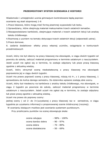 PRZEDMIOTOWY SYSTEM OCENIANIA Z HISTORII Wiadomości i umiejętności ucznia gimnazjum kontrolowane będą poprzez: ocenianie wg skali stopniowej 1-6 1.Prace klasowe, które mogą mieć formę pisemnej wypowiedzi lub testu. 2.Sprawdziany, które obejmują materiał maksymalnie trzech ostatnich tematów. 3.Niezapowiedziane kartkówki, obejmujące materiał z trzech ostatnich lekcji lub analizę tekstu źródłowego. 4.Rozmowę z uczniem na tematy dotyczące trzech ostatnich lekcji (odpowiedź ustna). 5.Prace domowe. 6. zadania dodatkowe- efekty pracy własnej uczniów, osiągnięcia w konkursach przedmiotowych Uczeń, który nie był obecny na pracy klasowej ma obowiązek, w ciągu dwóch tygodni od powrotu do szkoły, zaliczyć materiał programowy w terminie ustalonym z nauczycielem. Jeżeli uczeń nie zgłosi się w terminie, to zostaje odpytany lub pisze pracę klasową zgodnie z aktualną wiedzą . Uczeń, który otrzymał ocenę niedostateczną z pracy klasowej ma obowiązek poprawienia jej w ciągu dwóch tygodni. Uczeń ma prawo poprawić ocenę z pracy klasowej, niższą niż 4-, z 1 pracy klasowej, 1 sprawdzianu do końca danego semestru. Do dziennika wpisane zostają obie oceny. Uczeń, który był nieobecny na kartkówce z analizy tekstu źródłowego, ma obowiązek, w ciągu 2 tygodni po powrocie do szkoły, zaliczyć materiał programowy w terminie ustalonym z nauczycielem. Jeżeli uczeń nie zgłosi się w terminie, to zostaje odpytany lub pisze pracę zgodnie z aktualną wiedzą . Uczeń ma prawo do poprawy oceny: jednej oceny ( od 2- do 3+)uzyskanej z pracy klasowej raz w semestrze, w ciągu tygodnia po uzyskaniu informacji o proponowanej ocenie śródrocznej (rocznej). W ocenianiu bieżącym możliwe jest ocenianie systemem punktowym. Przy przeliczaniu punktów na ocenę obowiązuje skala: ocena celująca - 98% - 100% ocena bardzo dobra - 90 - 97% ocena dobra - 70 - 89% ocena dostateczna - 50 - 69% ocena dopuszczająca - 30 - 49% ocena niedostateczna – 0 - 29% Ponadto uczeń może otrzymać ocenę + lub – ( 3 + -ocena bardzo dobra, 3- - ocena niedostateczna) Opracowały: Ewa Kosznik, Dorota Winter - Rześniowiecka