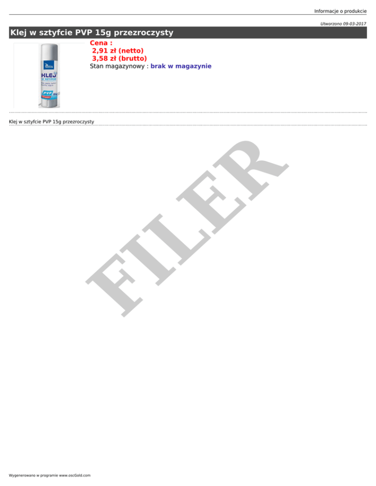 Informacje o produkcie Utworzono 09-03-2017 Klej w sztyfcie PVP 15g przezroczysty Cena : 2,91 zł (netto) 3,58 zł (brutto) Stan magazynowy : brak w magazynie FI LE R Klej w sztyfcie PVP 15g przezroczysty Wygenerowano w programie www.oscGold.com