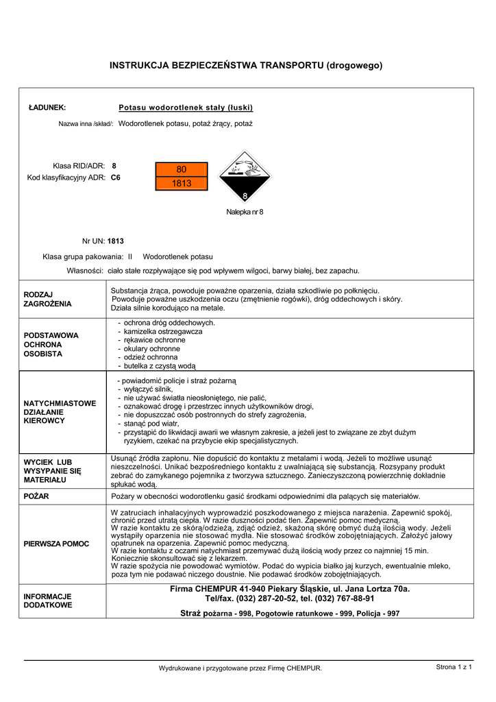 INSTRUKCJA BEZPIECZEŃSTWA TRANSPORTU (drogowego) ŁADUNEK: Potasu wodorotlenek stały (łuski) Nazwa inna /skład/: Wodorotlenek potasu, potaż żrący, potaż Klasa RID/ADR: 8 Kod klasyfikacyjny ADR: C6 80 1813 Nalepka nr 8 Nr UN: 1813 Klasa grupa pakowania: II Wodorotlenek potasu Własności: ciało stałe rozpływające się pod wpływem wilgoci, barwy białej, bez zapachu. RODZAJ ZAGROŻENIA PODSTAWOWA OCHRONA OSOBISTA NATYCHMIASTOWE DZIAŁANIE KIEROWCY Substancja żrąca, powoduje poważne oparzenia, działa szkodliwie po połknięciu. Powoduje poważne uszkodzenia oczu (zmętnienie rogówki), dróg oddechowych i skóry. Działa silnie korodująco na metale. - ochrona dróg oddechowych. kamizelka ostrzegawcza rękawice ochronne okulary ochronne odzież ochronna - butelka z czystą wodą - powiadomić policje i straż pożarną - wyłączyć silnik, - nie używać światła nieosłoniętego, nie palić, - oznakować drogę i przestrzec innych użytkowników drogi, - nie dopuszczać osób postronnych do strefy zagrożenia, - stanąć pod wiatr, - przystąpić do likwidacji awarii we własnym zakresie, a jeżeli jest to związane ze zbyt dużym ryzykiem, czekać na przybycie ekip specjalistycznych. WYCIEK LUB WYSYPANIE SIĘ MATERIAŁU Usunąć źródła zapłonu. Nie dopuścić do kontaktu z metalami i wodą. Jeżeli to możliwe usunąć nieszczelności. Unikać bezpośredniego kontaktu z uwalniającą się substancją. Rozsypany produkt zebrać do zamykanego pojemnika z tworzywa sztucznego. Zanieczyszczoną powierzchnię dokładnie spłukać wodą. POŻAR Pożary w obecności wodorotlenku gasić środkami odpowiednimi dla palących się materiałów. PIERWSZA POMOC W zatruciach inhalacyjnych wyprowadzić poszkodowanego z miejsca narażenia. Zapewnić spokój, chronić przed utratą ciepła. W razie duszności podać tlen. Zapewnić pomoc medyczną. W razie kontaktu ze skórą/odzieżą, zdjąć odzież, skażoną skórę obmyć dużą ilością wody. Jeżeli wystąpiły oparzenia nie stosować mydła. Nie stosować środków zobojętniających. Założyć jałowy opatrunek na oparzenia. Zapewnić pomoc medyczną. W razie kontaktu z oczami natychmiast przemywać dużą ilością wody przez co najmniej 15 min. Koniecznie skonsultować się z lekarzem. W razie spożycia nie powodować wymiotów. Podać do wypicia białko jaj kurzych, ewentualnie mleko, poza tym nie podawać niczego doustnie. Nie podawać środków zobojętniających. INFORMACJE DODATKOWE Firma CHEMPUR 41-940 Piekary Śląskie, ul. Jana Lortza 70a. Tel/fax. (032) 287-20-52, tel. (032) 767-88-91 Straż pożarna - 998, Pogotowie ratunkowe - 999, Policja - 997 Wydrukowane i przygotowane przez Firmę CHEMPUR. Strona 1 z 1