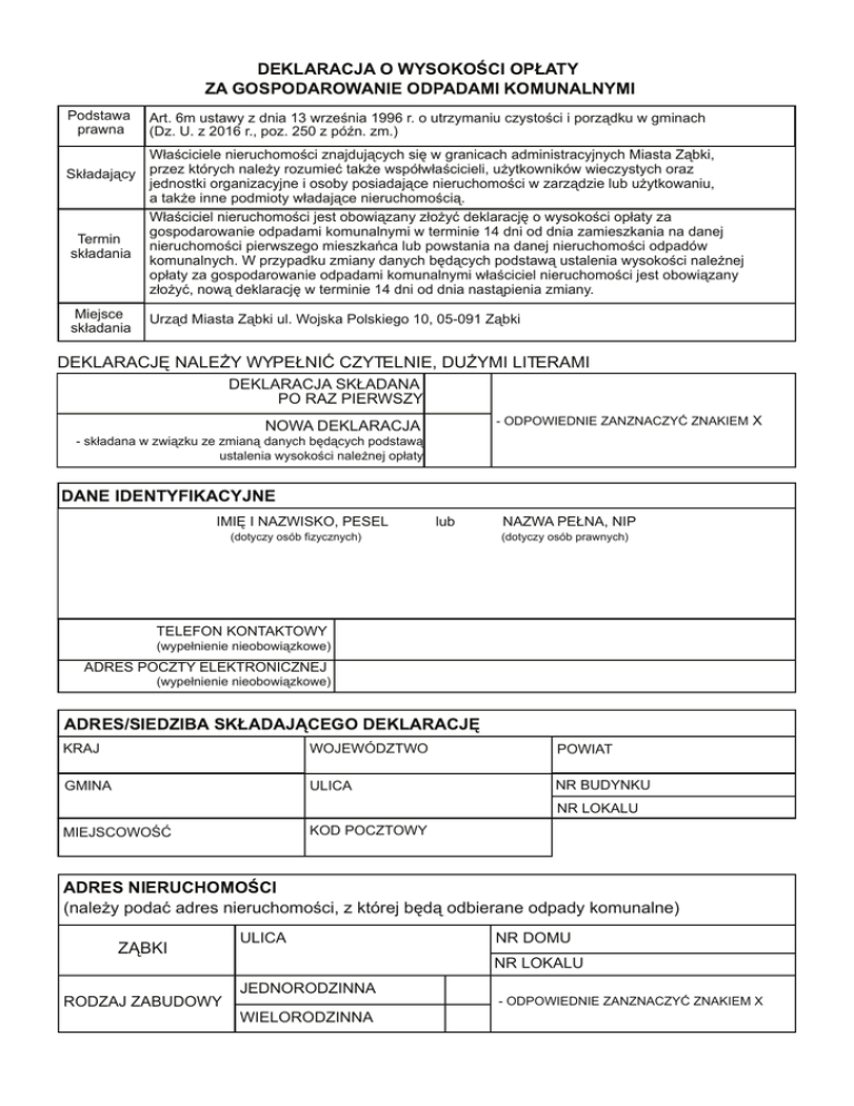 DEKLARACJA O WYSOKOŚCI OPŁATY ZA GOSPODAROWANIE ODPADAMI KOMUNALNYMI Podstawa prawna Art. 6m ustawy z dnia 13 września 1996 r. o utrzymaniu czystości i porządku w gminach (Dz. U. z 2016 r., poz. 250 z późn. zm.) Właściciele nieruchomości znajdujących się w granicach administracyjnych Miasta Ząbki, Składający przez których należy rozumieć także współwłaścicieli, użytkowników wieczystych oraz jednostki organizacyjne i osoby posiadające nieruchomości w zarządzie lub użytkowaniu, a także inne podmioty władające nieruchomością. Właściciel nieruchomości jest obowiązany złożyć deklarację o wysokości opłaty za gospodarowanie odpadami komunalnymi w terminie 14 dni od dnia zamieszkania na danej Termin nieruchomości pierwszego mieszkańca lub powstania na danej nieruchomości odpadów składania komunalnych. W przypadku zmiany danych będących podstawą ustalenia wysokości należnej opłaty za gospodarowanie odpadami komunalnymi właściciel nieruchomości jest obowiązany złożyć, nową deklarację w terminie 14 dni od dnia nastąpienia zmiany. Miejsce składania Urząd Miasta Ząbki ul. Wojska Polskiego 10, 05091 Ząbki DEKLARACJĘ NALEŻY WYPEŁNIĆ CZYTELNIE, DUŻYMI LITERAMI DEKLARACJA SKŁADANA PO RAZ PIERWSZY ODPOWIEDNIE ZANZNACZYĆ ZNAKIEM X NOWA DEKLARACJA składana w związku ze zmianą danych będących podstawą ustalenia wysokości należnej opłaty DANE IDENTYFIKACYJNE IMIĘ I NAZWISKO, PESEL lub (dotyczy osób fizycznych) NAZWA PEŁNA, NIP (dotyczy osób prawnych) TELEFON KONTAKTOWY (wypełnienie nieobowiązkowe) ADRES POCZTY ELEKTRONICZNEJ (wypełnienie nieobowiązkowe) ADRES/SIEDZIBA SKŁADAJĄCEGO DEKLARACJĘ KRAJ WOJEWÓDZTWO POWIAT GMINA ULICA NR BUDYNKU NR LOKALU KOD POCZTOWY MIEJSCOWOŚĆ ADRES NIERUCHOMOŚCI (należy podać adres nieruchomości, z której będą odbierane odpady komunalne) ZĄBKI RODZAJ ZABUDOWY ULICA NR DOMU NR LOKALU JEDNORODZINNA WIELORODZINNA ODPOWIEDNIE ZANZNACZYĆ ZNAKIEM X SPOSÓB ZBIERANIA I ODBIERANIA ODPADÓW (odpowiedni zaznaczyć znakiem X, należy wybrać jedną możliwość) odpady zbierane i odbierane w sposób selektywny odpady zbierane i odbierane w sposób nieselektywny LICZBA GOSPODARSTW DOMOWYCH, KTÓRYCH DOTYCZY DEKLARACJA - .................. WYSOKOŚĆ MIESIĘCZNEJ OPŁATY - ......................... zł (liczona jako iloczyn liczby gospodarstw domowych, których dotyczy deklaracja oraz stawki opłaty) DATA (miesiąc i rok) POWSTANIA OBOWIĄZKU PONOSZENIA OPŁATY ZA GOSPODAROWANIE ODPADAMI KOMUNALNYMI - ...................................... Pouczenie: Deklaracja stanowi podstawę do wystawienia tytułu wykonawczego, zgodnie z przepisami ustawy z dnia 17 czerwca 1966 r. o postępowaniu w administracji (Dz. U. z 2016 r. poz. 599z późn. zm.). Objaśnienia: Pod pojęciem gospodarstwo domowe rozumie się jedną osobę lub ich zespół razem zamieszkujących, wspólnie się utrzymujących. Opłatę za gospodarowanie odpadami komunalnymi w zmienionej wysokości uiszcza się za miesiąc, w którym nastąpiła zmiana. Uprawnienie do skorygowania deklaracji (złożenia nowej deklaracji) ulega zawieszeniu na czas trwania postępowania podatkowego lub kontroli podatkowej w zakresie objętym tym postępowaniem lub kontrolą (art. 81b § 1 pkt 1 ustawy z dnia 29 sierpnia 1997 r. Ordynacja podatkowa – Dz. U. z 2015 r. poz. 613, z późn. zm.). Zgodnie z art. 56 § 1 ustawy z dnia 10 września 1999 r. Kodeks karny skarbowy (Dz.U. z 2013 r. poz. 186 i 1228) podatnik, który składając organowi podatkowemu, innemu uprawnionemu organowi lub płatnikowi deklarację lub oświadczenie, podaje nieprawdę lub zataja prawdę albo nie dopełnia obowiązku zawiadomienia o zmianie objętych nimi danych, przez co naraża podatek na uszczuplenie podlega karze grzywny do 720 stawek dziennych albo karze pozbawienia wolności, albo obu tym karom łącznie. …................................................................................ (data i czytelny podpis składającego deklarację) Wyrażam zgodę na przesyłanie na podany przeze mnie w deklaracji numer telefonu oraz adres poczty informacji tekstowych (SMS) dotyczących gospodarki odpadami. …................................................................................ (data i czytelny podpis składającego deklarację)