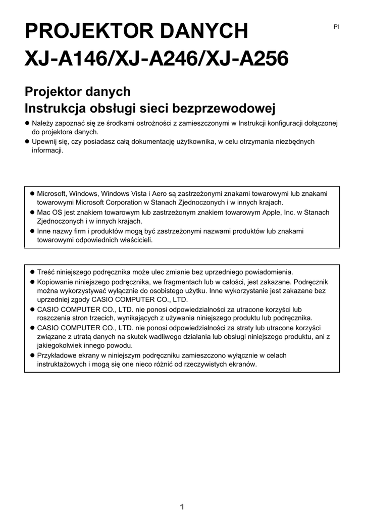 PROJEKTOR DANYCH XJ-A146/XJ-A246/XJ-A256 Pl Projektor danych Instrukcja obsługi sieci bezprzewodowej z Należy zapoznać się ze środkami ostrożności z zamieszczonymi w Instrukcji konfiguracji dołączonej do projektora danych. z Upewnij się, czy posiadasz całą dokumentację użytkownika, w celu otrzymania niezbędnych informacji. z Microsoft, Windows, Windows Vista i Aero są zastrzeżonymi znakami towarowymi lub znakami towarowymi Microsoft Corporation w Stanach Zjednoczonych i w innych krajach. z Mac OS jest znakiem towarowym lub zastrzeżonym znakiem towarowym Apple, Inc. w Stanach Zjednoczonych i w innych krajach. z Inne nazwy firm i produktów mogą być zastrzeżonymi nazwami produktów lub znakami towarowymi odpowiednich właścicieli. z Treść niniejszego podręcznika może ulec zmianie bez uprzedniego powiadomienia. z Kopiowanie niniejszego podręcznika, we fragmentach lub w całości, jest zakazane. Podręcznik można wykorzystywać wyłącznie do osobistego użytku. Inne wykorzystanie jest zakazane bez uprzedniej zgody CASIO COMPUTER CO., LTD. z CASIO COMPUTER CO., LTD. nie ponosi odpowiedzialności za utracone korzyści lub roszczenia stron trzecich, wynikających z używania niniejszego produktu lub podręcznika. z CASIO COMPUTER CO., LTD. nie ponosi odpowiedzialności za straty lub utracone korzyści związane z utratą danych na skutek wadliwego działania lub obsługi niniejszego produktu, ani z jakiegokolwiek innego powodu. z Przykładowe ekrany w niniejszym podręczniku zamieszczono wyłącznie w celach instruktażowych i mogą się one nieco różnić od rzeczywistych ekranów. 1 Spis treści O podręczniku... .............................................................. 5 Terminologia i konwencje .......................................................................5 Co można uzyskać dzięki bezprzewodowej łączności... ....................................................................... 6 Wymagania sprzętowe projektora ................................. 8 Instalowanie aplikacji Wireless Connection 3.............. 9 Minimalne wymagania sprzętowe...........................................................9 Instalowanie aplikacji Wireless Connection 3.......................................10 Instalowanie aplikacji Wireless Connection 3 na drugim i na kolejnym komputerze.....................................................................10 Nawiązywanie bezprzewodowego połączenia LAN pomiędzy projektorem a komputerem ........................ 11 Bezprzewodowe połączenie LAN i projekcja danych ...........................11 O aplikacji Bezprzewodowy projektor...................................................12 Aby wykonać bezprzewodową projekcję.................................................................... 12 Ekran czuwania aplikacji Bezprzewodowy projektor.................................................. 12 Wireless Connection 3..........................................................................13 Aby uruchomić Wireless Connection 3 ...................................................................... 13 Okna aplikacji Wireless Connection 3........................................................................ 13 Aby wyświetlić pomoc aplikacji Wireless Connection 3 ............................................. 14 Aby wyświetlić informacje o wersji aplikacji Wireless Connection 3 .......................... 14 Aby zamknąć aplikację Wireless Connection 3.......................................................... 14 Używanie domyślnego identyfikatora SSID do połączenia projektora z komputerem przez bezprzewodową sieć LAN..................14 Aby użyć domyślnego identyfikatora SSID do połączenia komputera z projektorem przez bezprzewodową sieć LAN ......................................................... 15 Nawiązywanie bezprzewodowego połączenia LAN z wielu komputerów .................. 17 2 Konfigurowanie ustawień bezpieczeństwa dla bezprzewodowego połączenia LAN ............................ 18 Ustawienia bezpieczeństwa .................................................................18 Konfigurowanie ustawień bezpieczeństwa ...........................................19 Aby zalogować się na stronę administracyjną projektora .......................................... 19 Aby wylogować się ze strony administracyjnej projektora ......................................... 20 Aby skonfigurować ustawienia bezpieczeństwa ........................................................ 21 Nawiązywanie bezprzewodowego połączenia LAN po skonfigurowaniu ustawień bezpieczeństwa.....................................23 Aby ustanowić bezprzewodowe połączenie LAN między projektorem a komputerem po skonfigurowaniu ustawień bezpieczeństwa .................................. 23 Nawiązywanie bezprzewodowego połączenia LAN z drugim i kolejnym komputerem po skonfigurowaniu ustawień bezpieczeństwa ..................................... 24 Nawiązywanie bezprzewodowego połączenia LAN, gdy ustawienia bezpieczeństwa są wyłączone ................................................................................... 24 Operacje dostępne przy bezprzewodowym połączeniu LAN ............................................................. 25 Operacje podczas projekcji ..................................................................25 Rozpoczynanie i zatrzymywanie projekcji z komputera podłączonego przez bezprzewodową sieć LAN.......................................................................................... 26 Wyświetlanie nazwy użytkownika na ekranie projekcyjnym....................................... 28 Inne operacje........................................................................................28 Ponowne nawiązywanie bezprzewodowego połączenia LAN.................................... 28 Informacje o projektorze .....................................................................................