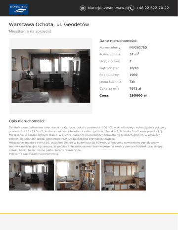 [email protected] +48 22 622-70-22 Warszawa Ochota, ul. Geodetów Mieszkanie na sprzedaż Dane nieruchomości: Numer oferty: INV262780 Powierzchnia: 37 m Liczba pokoi: 2 Piętro/Pięter 10/10 Rok budowy: 1969 Jasna kuchnia: Tak 2 2 Cena za m : 7973 zł Cena: 295000 zł Opis nieruchomości: Świetnie skomunikowane mieszkanie na Ochocie. Lokal o powierzchni 37m2, w skład którego wchodzą dwa pokoje o powierzchni 16 i 11,5 m2, kuchnia z oknem otwarta na salon o powierzchni 4 m2, łazienka 3 m2, oraz przedpokój. Mieszkanie w bardzo dobrym stanie, w kuchni i łazience na podłogach terakota na ścianach glazura, w pokojach parkiet, na ścianach gładź, okna nowe PCV. Do mieszkania przynależy piwnica. Mieszkanie znajduje się na 10, ostatnim piętrze w budynku z lat 60-tych. W budynku wymienione zostały piony wodno-kanalizacyjne i grzewcze. W pobliżu linie autobusowe i tramwajowe. W okolicy pełna infrastruktura: sklepy, apteki, banki, bazar, liczne parki i tereny rekreacyjne. Polecam i zapraszam na prezentację. [email protected] +48 22 622-70-22