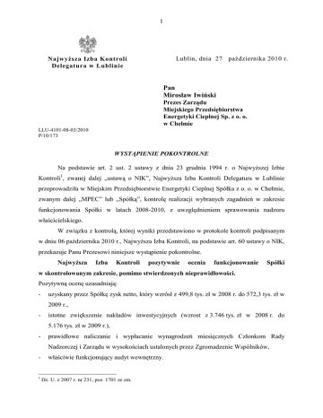 1 Lublin, dnia 27 października 2010 r. Najwyższa Izba Kontroli Delegatura w Lublinie Pan Mirosław Iwiński Prezes Zarządu Miejskiego Przedsiębiorstwa Energetyki Cieplnej Sp. z o. o. w Chełmie LLU-4101-08-03/2010 P/10/173 WYSTĄPIENIE POKONTROLNE Na podstawie art. 2 ust. 2 ustawy z dnia 23 grudnia 1994 r. o Najwyższej Izbie Kontroli1, zwanej dalej „ustawą o NIK”, Najwyższa Izba Kontroli Delegatura w Lublinie przeprowadziła w Miejskim Przedsiębiorstwie Energetyki Cieplnej Spółka z o. o. w Chełmie, zwanym dalej „MPEC” lub „Spółką”, kontrolę realizacji wybranych zagadnień w zakresie funkcjonowania Spółki w latach 2008-2010, z uwzględnieniem sprawowania nadzoru właścicielskiego. W związku z kontrolą, której wyniki przedstawiono w protokole kontroli podpisanym w dniu 06 października 2010 r., Najwyższa Izba Kontroli, na podstawie art. 60 ustawy o NIK, przekazuje Panu Prezesowi niniejsze wystąpienie pokontrolne. Najwyższa Izba Kontroli pozytywnie ocenia funkcjonowanie Spółki w skontrolowanym zakresie, pomimo stwierdzonych nieprawidłowości. Pozytywną ocenę uzasadniają: - uzyskany przez Spółkę zysk netto, który wzrósł z 499,8 tys. zł w 2008 r. do 572,3 tys. zł w 2009 r., - istotne zwiększenie nakładów inwestycyjnych (wzrost z 3.746 tys. zł w 2008 r. do 5.176 tys. zł w 2009 r.), - prawidłowe naliczanie i wypłacanie wynagrodzeń miesięcznych Członkom Rady Nadzorczej i Zarządu w wysokościach ustalonych przez Zgromadzenie Wspólników, - 1 właściwie funkcjonujący audyt wewnętrzny. Dz. U. z 2007 r. nr 231, poz. 1701 ze zm. 2 Stwierdzone nieprawidłowości polegały na: - naruszeniu wymogów ustalonych w art. 89 ust. 1 pkt 2 oraz art. 11 ust. 8 ustawy z dnia 29 stycznia 2004 r. Prawo zamówień publicznych2 (dalej „Pzp”) i § 1 pkt 2 lit. a rozporządzenia Prezesa Rady Ministrów z dnia 19 grudnia 2007 r. w sprawie kwot wartości zamówień oraz konkursów, od których jest uzależniony obowiązek przekazywania ogłoszeń Urzędowi Oficjalnych Publikacji Wspólnot Europejskich3 w odniesieniu do zamówień na dostawy węgla energetycznego przeznaczonego na sprzedaż, - prowadzenie działalności komercyjnej w zakresie sprzedaży węgla opałowego, która wykraczała poza sferę użyteczności publicznej, - niewystarczającym zabezpieczeniu interesów Spółki w umowach na dostawę miału węglowego dla działalności podstawowej, a także nieustalaniu wiążącej dla rozliczeń wartości opałowej miału w przypadku rozbieżności wyników badań stron, - nieuzasadnionym ekonomicznie oraz wykraczającym poza działalność w sferze użyteczności publicznej poręczeniu kredytów Spółki Chełmskie Linie Autobusowe Sp. z o. o., - zaniechaniach w toku niektórych postępowań windykacyjnych. 1. Spółka powstała w wyniku przekształcenia przedsiębiorstwa komunalnego pod nazwą Miejskie Przedsiębiorstwo Energetyki Cieplnej w jednoosobową spółkę z ograniczoną odpowiedzialnością Miasta Chełm. Kapitał zakładowy Spółki na dzień 25.06.2010 r. wynosił 18.623 tys. zł i dzielił się na 37.246 udziałów po 0,5 tys. zł. Wszystkie udziały objęło Miasto Chełm. Najwyższa Izba Kontroli pozytywnie ocenia realizację przez MPEC powierzonych zadań, wykonywanych zgodnie z przedmiotem działalności określonym w umowie Spółki, obejmujących bieżące i nieprzerwane zaopatrzenie Miasta Chełm w energię cieplną. Uwagi dotyczą przedmiotu działalności Spółki określonego w § 7 ust. 2 pkt 25 i 26 umowy Spółki tj. „sprzedaż detaliczna pozostałych nowych wyrobów prowadzona w wyspecjalizowanych sklepach, pozostała sprzedaż detaliczna prowadzona poza siecią sklepową, straganami i targowiskami”, w ramach którego utworzono w 2009 r. punkt sprzedaży. W punkcie tym była prowadzona działalność komercyjna polegająca na handlu węglem opałowym. W ocenie NIK tego rodzaju działalność wykraczała poza zakres zadań 2 3 Dz. U. z 2007 r. Nr 223, poz. 1655 ze zm. Dz. U. nr 241 poz. 1762, 3 o charakterze użyteczności publicznej, wskazanych w art. 9 ust. 4 ustawy z dnia 8 marca 1990 r. o samorządzie gminnym4, nie spełniała również przesłanek określających możliwość prowadzenia przez spółki komunalne działalności poza sferą użyteczności publicznej wynikających z art. 9 ust. 2 ustawy o samorządzie gminnym. Zarząd Spółki uzasadnił rozszerzenie zakresu działalności możliwością pozyskania dodatkowych dochodów oraz posiadaniem gotowej do wykorzystania infrastruktury i wyposażenia. Uruchomienie Punktu Sprzedaży poprzedzono uzyskaniem zgody Rady Nadzorczej i Zgromadzenia Wspólników, a także wprowadzeniem odpowiednich zmian w umowie Spółki i Regulaminie Organizacyjnym MPEC. W 2009 r. Spółka osiągnęła zysk z handlu węglem w wysokości 40 tys. zł, natomiast w I półroczu 2010 r. 49 tys. zł. 2. W ocenie NIK, sytuacja ekonomiczno – finansowa w kontrolowanym okresie pozostawała stabilna i nie stwarzała zagrożenia w kontynuacji działalności Spółki. Pomimo osiągnięcia w latach 2008-2009 zysku netto w kwotach odpowiednio 499,8 tys. zł i 572,4 tys. zł, podstawowa działalność Spółki generowała straty, które wyniosły za te lata 290 tys. zł i 253 tys. zł. Głównymi przyczynami ujemnego wyniku finansowego na tej działalności był wzrost kosztów energii elektrycznej, materiałów, remontów zleconych i wykonywanych systemem własnym oraz niższa od przewidywanej ilość sprzedanych jednostek ciepła. Do osiągnięcia w 2009 r. straty przyczyniło się również wprowadzenie przez Prezesa Zarządu czteroprocentowego upustu cenowego w stosunku do stawek określonych w decyzji Prezesa Urzędu Regulacji Energetyki zmieniającej IX taryfę dla ciepła. Skutkowało to zmniejszeniem przychodów Spółki w wysokości około 193 tys. zł. W kontrolowanym okresie zmniejszeniu z 1.123,1 tys. zł do 1.031,6 tys. zł uległa wysokość należności wymagalnych, przeterminow