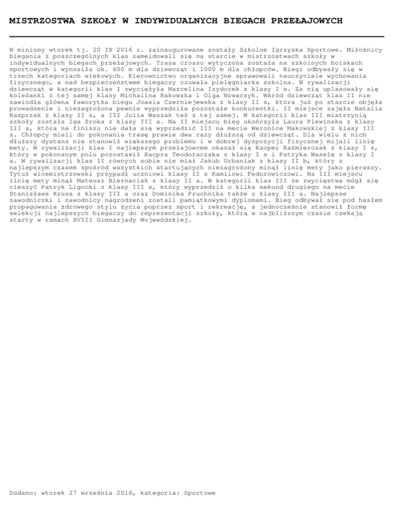 MISTRZOSTWA SZKOŁY W INDYWIDUALNYCH BIEGACH PRZEŁAJOWYCH W miniony wtorek tj. 20 IX 2016 r. zainaugurowane zostały Szkolne Igrzyska Sportowe. Miłośnicy biegania z poszczególnych klas zameldowali się na starcie w mistrzostwach szkoły w indywidualnych biegach przełajowych. Trasa crossu wytyczona została na szkolnych boiskach sportowych i wynosiła ok. 600 m dla dziewcząt i 1000 m dla chłopców. Biegi odbywały się w trzech kategoriach wiekowych. Kierownictwo organizacyjne sprawowali nauczyciele wychowania fizycznego, a nad bezpieczeństwem biegaczy czuwała pielęgniarka szkolna. W rywalizacji dziewcząt w kategorii klas I zwyciężyła Marcelina Izydorek z klasy I s. Za nią uplasowały się koleżanki z tej samej klasy Michalina Rakowska i Olga Nowaczyk. Wśród dziewcząt klas II nie zawiodła główna faworytka biegu Joasia Czerniejewska z klasy II s, która już po starcie objęła prowadzenie i niezagrożona pewnie wyprzedziła pozostałe konkurentki. II miejsce zajęła Natalia Kasprzak z klasy II s, a III Julia Waszak też z tej samej. W kategorii klas III mistrzynią szkoły została Iga Sroka z klasy III a. Na II miejscu bieg ukończyła Laura Plewinska z klasy III s, która na finiszu nie dała się wyprzedzić III na mecie Weronice Makowskiej z klasy III s. Chłopcy mieli do pokonania trasę prawie dwa razy dłuższą od dziewcząt. Dla wielu z nich dłuższy dystans nie stanowił większego problemu i w dobrej dyspozycji fizycznej mijali linię mety. W rywalizacji klas I najlepszym przełajowcem okazał się Kacper Kaźmierczak z klasy I s, który w pokonanym polu pozostawił Kacpra Teodoraczaka z klasy I s i Patryka Waselę z klasy I a. W rywalizacji klas II równych sobie nie miał Jakub Urbaniak z klasy II b, który z najlepszym czasem spośród wszystkich startujących niezagrożony minął linię mety jako pierwszy. Tytuł wicemistrzowski przypadł uczniowi klasy II s Kamilowi Fedorowiczowi. Na III miejscu linię mety minął Mateusz Biernaciak z klasy II a. W kategorii klas III ze zwycięstwa mógł się cieszyć Patryk Ligocki z klasy III s, który wyprzedził o kilka sekund drugiego na mecie Stanisława Krusa z klasy III a oraz Dominika Pruchnika także z klasy III a. Najlepsze zawodniczki i zawodnicy nagrodzeni zostali pamiątkowymi dyplomami. Bieg odbywał się pod hasłem propagowania zdrowego stylu życia poprzez sport i rekreację, a jednocześnie stanowił formę selekcji najlepszych biegaczy do reprezentacji szkoły, którą w najbliższym czasie czekają starty w ramach XVIII Gimnazjady Wojewódzkiej. Dodano: wtorek 27 września 2016, kategoria: Sportowe