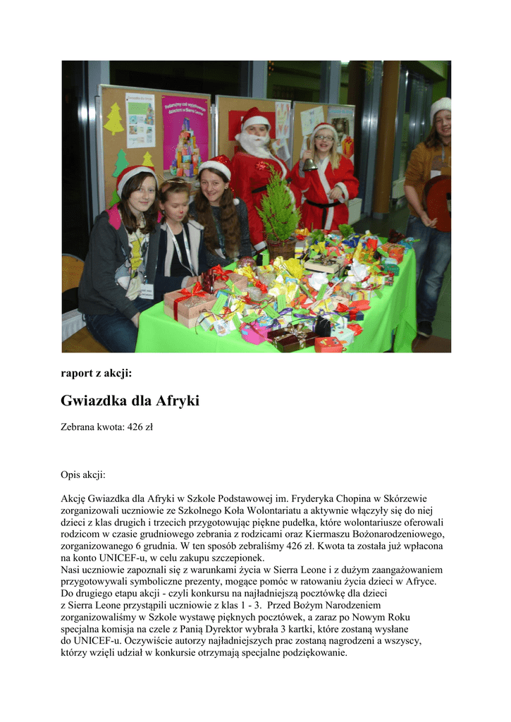 raport z akcji: Gwiazdka dla Afryki Zebrana kwota: 426 zł Opis akcji: Akcję Gwiazdka dla Afryki w Szkole Podstawowej im. Fryderyka Chopina w Skórzewie zorganizowali uczniowie ze Szkolnego Koła Wolontariatu a aktywnie włączyły się do niej dzieci z klas drugich i trzecich przygotowując piękne pudełka, które wolontariusze oferowali rodzicom w czasie grudniowego zebrania z rodzicami oraz Kiermaszu Bożonarodzeniowego, zorganizowanego 6 grudnia. W ten sposób zebraliśmy 426 zł. Kwota ta została już wpłacona na konto UNICEF-u, w celu zakupu szczepionek. Nasi uczniowie zapoznali się z warunkami życia w Sierra Leone i z dużym zaangażowaniem przygotowywali symboliczne prezenty, mogące pomóc w ratowaniu życia dzieci w Afryce. Do drugiego etapu akcji - czyli konkursu na najładniejszą pocztówkę dla dzieci z Sierra Leone przystąpili uczniowie z klas 1 - 3. Przed Bożym Narodzeniem zorganizowaliśmy w Szkole wystawę pięknych pocztówek, a zaraz po Nowym Roku specjalna komisja na czele z Panią Dyrektor wybrała 3 kartki, które zostaną wysłane do UNICEF-u. Oczywiście autorzy najładniejszych prac zostaną nagrodzeni a wszyscy, którzy wzięli udział w konkursie otrzymają specjalne podziękowanie.