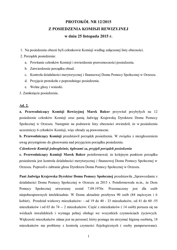 PROTOKÓŁ NR 12/2015 Z POSIEDZENIA KOMISJI REWIZYJNEJ w dniu 25 listopada 2015 r. 1. Na posiedzeniu obecni byli członkowie Komisji według załączonej listy obecności. 2. Porządek posiedzenia: a. Powitanie członków Komisji i stwierdzenie prawomocności posiedzenia. b. Zatwierdzenie porządku obrad. c. Kontrola działalności merytorycznej i finansowej Domu Pomocy Społecznej w Orzeszu. d. Przyjęcie protokołu z poprzedniego posiedzenia. e. Wolne głosy i wnioski. 3. Zamknięcie posiedzenia. Ad. 2. a. Przewodniczący Komisji Rewizyjnej Marek Balcer przywitał przybyłych na 12 posiedzenie członków Komisji oraz panią Jadwigę Krajewską Dyrektora Domu Pomocy Społecznej w Orzeszu. Następnie na podstawie listy obecności stwierdził, że w posiedzeniu uczestniczy 6 członków Komisji, więc obrady są prawomocne. b. Przewodniczący Komisji przedstawił porządek posiedzenia. W związku z niezgłoszeniem uwag przystąpiono do głosowania nad przyjęciem porządku posiedzenia. Członkowie Komisji jednogłośnie, 6głosami za, przyjęli porządek posiedzenia c. Przewodniczący Komisji Marek Balcer poinformował, że kolejnym punktem porządku posiedzenia jest kontrola działalności merytorycznej i finansowej Domu Pomocy Społecznej w Orzeszu. Poprosił o zabranie głosu Dyrektora Domu Pomocy Społecznej w Orzeszu. Pani Jadwiga Krajewska Dyrektor Domu Pomocy Społecznej przedstawiła „Sprawozdanie z działalności Domu Pomocy Społecznej w Orzeszu za 2015 r. Poinformowała m.in., że Dom Pomocy Społecznej utworzony został 7.09.1976r. Przeznaczony jest dla osób niepełnosprawnych intelektualnie. W Domu aktualnie przebywa 90 osób (84 mężczyzn i 6 kobiet). Przedział wiekowy mieszkańców: - od 19 do 40 - 33 mieszkańców, od 41 do 60 -55 mieszkańców i od 65 do 74 -- 2 mieszkańców. Część z mieszkańców ( 14 osób) porusza się na wózkach inwalidzkich i wymaga pełnej obsługi we wszystkich czynnościach życiowych. Większość mieszkańców zdana jest na personel, który pomaga im utrzymać higienę osobistą, 18 mieszkańców ma problemy z kontrolą czynności fizjologicznych ( osoby pampersowane). 1 Ogółem w Domu zatrudnione są 73 osoby, z czego w Dziale Terapeutyczno – Opiekuńczym 59 osób, które sprawują bezpośrednią opiekę nad mieszkańcami. Odpłatność za pobyt w Domu Pomocy Społecznej ponosi: 78 osób - na starych zasadach, 12 osób - na nowych zasadach. Koszt utrzymania 1 podopiecznego to 4.188 zł. miesięcznie, zgodnie ze starymi zasadami dotacja na 1 podopiecznego wynosi 1.917 zł., pozostałą kwota dopłacana jest z budżetu powiatu, z kolei według nowych zasad podopieczny ponosi część odpłatności w wysokości 70% jego dochodów, resztę brakującej kwoty pokrywa rodzina a w dalszej kolejności gmina, której pensjonariusz jest mieszkańcem. Mieszkańcy posiadający orzeczenia o niepełnosprawności w stopniu znacznym to 80 osób, a umiarkowanym - 10 osób. Mieszkańcy są także w różnym stopniu upośledzeni i tak: głębokim - 10 osób, znacznym - 58 osób, umiarkowanym - 21 osób oraz w stopniu lekkim 1 osoba. Ponadto u większości podopiecznych występują choroby współistniejące typu: upośledzenie narządu ruchu, cukrzyca, niedowidzenie, choroba niedokrwienna serca, epilepsja, osteoporoza, niewydolność nerek, zaćma, udar mózgu, nadżerka przełyku, ropień płuca, głuchota, nieżyt żołądkowo-jelitowy czy mózgowe porażenie dziecięce. Wśród mieszkańców DPS znajduje się 76 osób ubezwłasnowolnionych całkowicie i 1 osoba częściowo oraz 1 osoba posiadająca kuratora, a w 30 przypadkach opiekunami prawnymi są pracownicy orzeskiego Domu. Mieszkańcy objęci są całodobową opieką pielęgniarską, sprawowaną przez wykwalifikowane pielęgniarki. W zakres ich obowiązków wchodzi czuwanie nad stanem zdrowia podopiecznych, realizowanie zaleceń lekarskich, dbanie o higienę i profilaktykę zdrowotną mieszkańców. Konsultacje psychiatryczne odbywają się dwa razy w miesiącu. W 2015 r. odbyło się 568 konsultacji lekarskich, z czego w 9 przypadkach wymagana była hospitalizacja, a pogotowie ratunkowe wzywano 5 razy. Dom współpracuje z poradnią ogólną i dodatkowo z 25 poradniami specjalistycznymi. Szczegółowa informacja stanowi załącznik do protokołu. Radny Tadeusz Kopiec zapytał o liczbę osób oczekujących na miejsce w orzeskim Domu. Pani Jadwiga Krajewska poinformowała, że w kolejce oczekuje obecnie 12 osób. Dodała, że osoby z powiatu mikołowskiego są przyjmowane w pierwszej kolejności. Podkreśliła, że orzeski Dom jest jednym z niewielu, do którego jest kolejka. Radny Tadeusz Kopiec zapytał o wynagrodzenia pracowników DPS. Pani Jadwiga Krajewska poinformowała, że od 8 lat pracownicy DPS corocznie otrzymują podwyżki w wysokości ok. 100 zł.. Wprowadzony został także system nagród. Dzięki temu 2 pensje są na dobrym poziomie i nie ma problemu z pozyskaniem nowych pracowników. Podkreśliła, że praca w tego typu placówce jest trudna i specyficzna. Radny Eryk Muszer zaproponował by w planie kontroli Komisji zaplanować wizytę w Domu Pomocy Społecznej w trakcie obecnej kadencji. Następnie Pani Dyrektor przedstawiła Sprawozdanie finansowe za III kwartały 2015 r. Ogółem plan na 2015 r. wynosi 4.732.384 zł, za III kwartały został wykonany w wysokości 3.635.228,42 zł. co stanowi 76,82% planu. Poinformowała m.in., że § 4010 wynagrodzenie osobowe pracowników to największa grupa wydatków - kwota zaplanowana to 2.814.417 zł., została wykonana w wysokości 2.279.163,19 zł. co stanowi 80, 98% planu, § 4210 zakup materiałów i wyposażenia – zaplanowano kwotę 156.208, z czego wykorzystano kwotę 101.814,83 zł. co stanowi 65,18% planu, w ramach tych środków zakupiono m.in. środki czystości za kwotę 25.1444 zł., paliwo za 10.664 czy artykuły gospodarcze za kwotę 10.999 zł., § 4260 zakup energii – zaplanowano kwotę 210.000 zł., z czego wykorzyst
