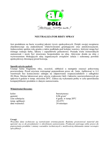 NEUTRALIZATOR RDZY SPRAY Jest produktem na bazie wysokiej jakości żywic epoksydowych. Dzięki swojej recepturze charakteryzuje się znakomitymi właściwościami gruntującymi oraz antykorozyjnymi. Jednocześnie spełnia rolę gruntu a także podkładu pod kolejne warstwy, którymi mogą być różnego rodzaju farby, lakiery i szpachlówki poliestrowe. Posiada wiele różnorodnych zastosowań i może być stosowany bezpośrednio na rdzę. Aktywnie działa na rdzę z wytworzeniem blokujących rdzę organicznych związków żelaza i ochronnej powłoki epoksydowej chroniącej przed korozją. Sposób użycia pędzel: Usunąć luźne fragmenty rdzy, oczyścić, odtłuścić a następnie osuszyć pokrywaną powierzchnię. Przed użyciem wstrząsnąć pojemnikiem przez ok. 2min. Aplikować w 2-3 warstwach bez konieczności odstępu na odparowanie rozpuszczalników z odległości 20-30cm. Można lakierować przy użyciu większości farb i lakierów nawierzchniowych po upływie 6 godzin w temp. otoczenia 20°C. Zaleca się wykonanie próby w celu sprawdzenia kompatybilności produktu w danym zastosowaniu. Właściwości fizyczne: kolor: gęstość: czas schnięcia: temp. aplikacji: data ważności: bursztynowy 0,96 g/cm3 6 godz. w temp 20oC 10-25oC 24 miesiące Uwagi: Wszystkie dane techniczne są wartościami orientacyjnymi. Radzimy przetestować materiał aby upewnić się co do przydatności w określonym zastosowaniu. Producent zastrzega sobie prawo do poprawiania produktu i zmiany warunków technicznych z możliwością dokonania zmian wewnątrz specyfikacji.