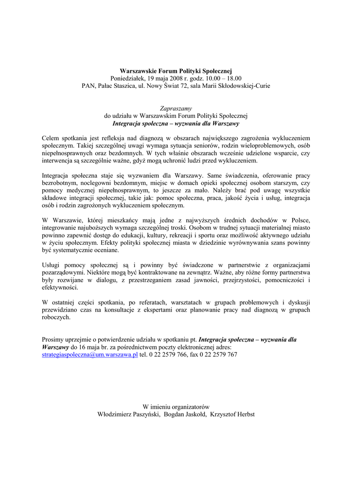 Warszawskie Forum Polityki Społecznej Poniedziałek, 19 maja 2008
