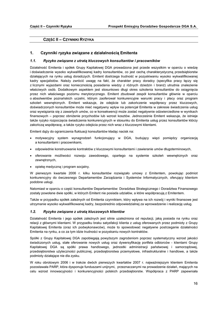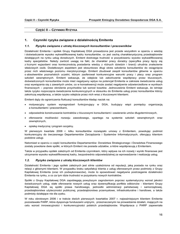 Część II – Czynniki Ryzyka Prospekt Emisyjny Doradztwo Gospodarcze DGA S.A. CZĘŚĆ II – CZYNNIKI RYZYKA 1. Czynniki ryzyka związane z działalnością Emitenta 1.1. Ryzyko związane z utratą kluczowych konsultantów i pracowników Działalność Emitenta i spółek Grupy Kapitałowej DGA prowadzona jest przede wszystkim w oparciu o wiedzę i doświadczenie wysoko wykwalifikowanej kadry konsultantów, co jest cechą charakterystyczną przedsiębiorstw działających na rynku usług doradczych. Emitent dostrzega trudność w pozyskiwaniu wysoko wykwalifikowanej kadry specjalistów. NaleŜy zwrócić uwagę na fakt, Ŝe charakter pracy doradcy (specyfika pracy łączy się z licznymi wyjazdami oraz koniecznością posiadania wiedzy z róŜnych dziedzin i branŜ) utrudnia znalezienie właściwych osób. Dodatkowym aspektem jest stosunkowo długi okres szkolenia konsultantów do osiągnięcia przez nich właściwego poziomu merytorycznego. Emitent zbudował zespół konsultantów głównie w oparciu o absolwentów poznańskich uczelni, którym zaoferował konkurencyjne warunki pracy i płacy oraz program szkoleń wewnętrznych. Emitent wskazuje, Ŝe odejście lub zakończenie współpracy przez kluczowych, doświadczonych konsultantów moŜe mieć negatywny wpływ na potencjał Emitenta w zakresie świadczenia usług oraz wywiązania się z zawartych umów, co w konsekwencji moŜe zostać negatywnie odzwierciedlone w wynikach finansowych – poprzez obniŜenie przychodów lub wzrost kosztów. Jednocześnie Emitent wskazuje, Ŝe istnieje takŜe ryzyko rozpoczęcia świadczenia konkurencyjnych w stosunku do Emitenta usług przez konsultantów którzy zakończą współpracę, a takŜe ryzyko odejścia przez nich wraz z kluczowymi klientami. Emitent dąŜy do ograniczenia fluktuacji konsultantów kładąc nacisk na: • motywacyjny system wynagrodzeń a konsultantami i pracownikami, • odpowiednie konstruowanie kontraktów z kluczowymi konsultantami i zawieranie umów długoterminowych, • oferowanie moŜliwości zewnętrznych, • opiekę medyczną i program socjalny. rozwoju funkcjonujący zawodowego, w DGA, opartego na budujący systemie więzi pomiędzy szkoleń organizacją wewnętrznych oraz W pierwszym kwartale 2006 r. kilku konsultantów rozwiązało umowy z Emitentem, powołując podmiot konkurencyjny do ówczesnego Departamentów Zarządzania i Systemów Informatycznych, oferujący klientom podobne usługi. Natomiast w oparciu o część konsultantów Departamentów: Doradztwa Strategicznego i Doradztwa Finansowego zostały powołane dwie spółki, w których Emitent nie posiada udziałów, a które współpracują z Emitentem. TakŜe w przypadku spółek zaleŜnych od Emitenta czynnikiem, który wpływa na ich rozwój i wyniki finansowe jest utrzymanie wysoko wykwalifikowanej kadry, bezpośrednio odpowiedzialnej za wprowadzenie i realizację usług. 1.2. Ryzyko związane z utratą kluczowych klientów Działalność Emitenta i jego spółek zaleŜnych jest silnie uzaleŜniona od reputacji, jaką posiada na rynku oraz relacji z głównymi klientami. W przypadku braku satysfakcji klienta z usług oferowanych przez podmioty z Grupy Kapitałowej Emitenta (oraz ich podwykonawców), moŜe to spowodować negatywne postrzeganie działalności Emitenta na rynku, a co za tym idzie trudności w pozyskaniu nowych kontraktów. Spółki z Grupy Kapitałowej DGA zapobiegają powyŜszym zagroŜeniom poprzez systematyczny wzrost jakości świadczonych usług, stałe oferowanie nowych usług oraz dywersyfikację portfela odbiorców - klientami Grupy Kapitałowej DGA są spółki prawa handlowego, jednostki administracji państwowej i samorządowej, przedsiębiorstwa uŜyteczności publicznej, przedsiębiorstwa przemysłowe, infrastrukturalne i handlowe, a takŜe podmioty działające nie dla zysku. W roku obrotowym 2006 i w trakcie dwóch pierwszych kwartałów 2007 r. najwaŜniejszym klientem Emitenta pozostawała PARP, która dysponuje funduszami unijnymi, przeznaczanymi na prowadzenie działań, mających na celu wzrost innowacyjności i konkurencyjności polskich przedsiębiorstw. Współpraca z PARP zapewniała 16 Część II – Czynniki Ryzyka Prospekt Emisyjny Doradztwo Gospodarcze DGA S.A. w okresie 1 stycznia 2006 – 30 czerwca 2007 r. ok. 38% przychodów ze sprzedaŜy. Emitent, zarówno samodzielnie, jak i w ramach konsorcjów, zawarł z PARP szereg umów na realizację szerokiego zakresu projektów. W celu minimalizacji ryzyka utraty kluczowego klienta, jakim jest PARP, Emitent wdroŜył stosowne procedury obiegu dokumentacji i monitorowania realizacji projektów (celem zminimalizowania ryzyka naruszenia ustaleń regulujących sferę projektów finansowanych przy udziale funduszy unijnych). W ramach procedur ISO, Emitent bada poziom zadowolenia klientów i dostosowuje przebieg projektów do sugestii przez nich zgłaszanych. Emitent wprowadził takŜe zasadę informowania klientów o istotnych wydarzeniach, jakie mają miejsce w Grupie Kapitałowej DGA, a mogą mieć wpływ na relację z klientami. 1.3. Ryzyko zmienności generowanych wyników w poszczególnych kwartałach Przychody kwartalne spółek Grupy Kapitałowej Emitenta oraz generowane zyski są zmienne w poszczególnych kwartałach. Jest to związane z takimi czynnikami jak m.in.: sezonowość (w tym liczba świąt i dni wolnych od pracy w kolejnych miesiącach oraz sezon wakacyjny), decyzje biznesowe klientów, zdolność konsultantów do zamykania projektów w okresach kwartalnych, wdraŜanie nowych produktów i usług, zmiany kursu waluty, a przede wszystkim wysoki poziom potencjalnych przychodów (wynagrodzenie za sukces) oraz przeciągające się procedury zawierania umów (protesty przegranych). Emitent wskazuje na wyraźny efekt sezonowości w przypadku spółki PBS DGA, w której od wielu lat półroczny rozkład przychodów jest następujący: 30-40% wartości rocznych przychodów generowanych jest w pierwszy