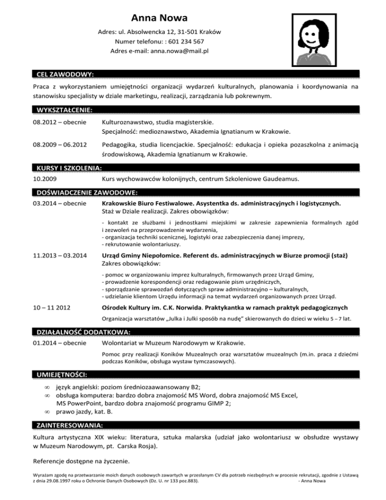Anna Nowa Adres: ul. Absolwencka 12, 31-501 Kraków Numer telefonu: : 601 234 567 Adres e-mail: [email protected] CEL ZAWODOWY: Praca z wykorzystaniem umiejętności organizacji wydarzeń kulturalnych, planowania i koordynowania na stanowisku specjalisty w dziale marketingu, realizacji, zarządzania lub pokrewnym. WYKSZTAŁCENIE: 08.2012 – obecnie Kulturoznawstwo, studia magisterskie. Specjalność: medioznawstwo, Akademia Ignatianum w Krakowie. 08.2009 – 06.2012 Pedagogika, studia licencjackie. Specjalność: edukacja i opieka pozaszkolna z animacją środowiskową, Akademia Ignatianum w Krakowie. KURSY I SZKOLENIA: 10.2009 Kurs wychowawców kolonijnych, centrum Szkoleniowe Gaudeamus. DOŚWIADCZENIE ZAWODOWE: 03.2014 – obecnie Krakowskie Biuro Festiwalowe. Asystentka ds. administracyjnych i logistycznych. Staż w Dziale realizacji. Zakres obowiązków: - kontakt ze służbami i jednostkami miejskimi w zakresie zapewnienia formalnych zgód i zezwoleń na przeprowadzenie wydarzenia, - organizacja techniki scenicznej, logistyki oraz zabezpieczenia danej imprezy, - rekrutowanie wolontariuszy. 11.2013 – 03.2014 Urząd Gminy Niepołomice. Referent ds. administracyjnych w Biurze promocji (staż) Zakres obowiązków: - pomoc w organizowaniu imprez kulturalnych, firmowanych przez Urząd Gminy, - prowadzenie korespondencji oraz redagowanie pism urzędniczych, - sporządzanie sprawozdań dotyczących spraw administracyjno – kulturalnych, - udzielanie klientom Urzędu informacji na temat wydarzeń organizowanych przez Urząd. 10 – 11 2012 Ośrodek Kultury im. C.K. Norwida. Praktykantka w ramach praktyk pedagogicznych Organizacja warsztatów „Julka i Julki sposób na nudę” skierowanych do dzieci w wieku 5 – 7 lat. DZIAŁALNOŚĆ DODATKOWA: 01.2014 – obecnie Wolontariat w Muzeum Narodowym w Krakowie. Pomoc przy realizacji Koników Muzealnych oraz warsztatów muzealnych (m.in. praca z dziećmi podczas Koników, obsługa wystaw tymczasowych). UMIEJĘTNOŚCI: • • • język angielski: poziom średniozaawansowany B2; obsługa komputera: bardzo dobra znajomość MS Word, dobra znajomość MS Excel, MS PowerPoint, bardzo dobra znajomość programu GIMP 2; prawo jazdy, kat. B. • ZAINTERESOWANIA: Kultura artystyczna XIX wieku: literatura, sztuka malarska (udział jako wolontariusz w obsłudze wystawy w Muzeum Narodowym, pt. Carska Rosja). Referencje dostępne na życzenie. Wyrażam zgodę na przetwarzanie moich danych osobowych zawartych w przesłanym CV dla potrzeb niezbędnych w procesie rekrutacji, zgodnie z Ustawą z dnia 29.08.1997 roku o Ochronie Danych Osobowych (Dz. U. nr 133 poz.883). - Anna Nowa