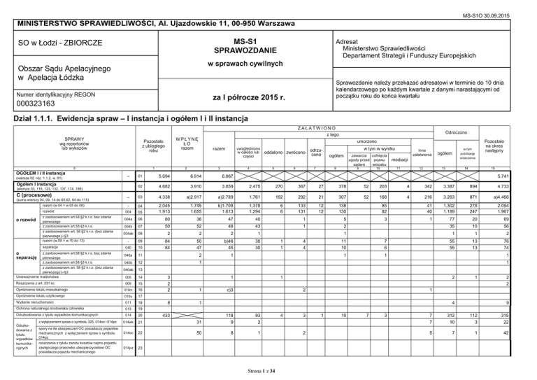 MS-S1O 30.09.2015 MINISTERSTWO SPRAWIEDLIWOŚCI, Al. Ujazdowskie 11, 00-950 Warszawa MS-S1 SPRAWOZDANIE SO w Łodzi - ZBIORCZE Adresat Ministerstwo Sprawiedliwości Departament Strategii i Funduszy Europejskich w sprawach cywilnych Obszar Sądu Apelacyjnego w Apelacja Łódzka Numer identyfikacyjny REGON Sprawozdanie należy przekazać adresatowi w terminie do 10 dnia kalendarzowego po każdym kwartale z danymi narastającymi od początku roku do końca kwartału za I półrocze 2015 r. 000323163 Dział 1.1.1. Ewidencja spraw – I instancja i ogółem I i II instancja ZAŁATW IONO z tego SPRAWY wg repertoriów lub wykazów Pozostało z ubiegłego roku 0 OGÓŁEM I i II instancja (wiersze 02 +dz. 1.1.2. w. 01) 1 4 5 6 7 ogółem 8 zawarcia cofnięcia ugody przed pozwu sądem wniosku 9 10 Inne załatwienia w tym publikację orzeczenia ogółem mediacji 11 12 13 14 Pozostało na okres następny 15 6.914 6.867 5.741 02 4.682 3.910 3.859 2.475 270 367 27 378 52 203 4 342 3.387 894 4.733 – 03 4.338 a)2.917 a)2.789 1.761 192 292 21 307 52 168 4 216 3.263 871 a)4.466 6 6 133 131 12 12 138 130 85 82 41 40 1.302 1.189 278 247 2.094 1.967 3 1 - 04 05 2.045 1.913 1.745 1.655 b)1.708 1.613 1.378 1.294 z zastosowaniem art.58 §2 k.r.o. bez zdania pierwszego z zastosowaniem art.58 §3 k.r.o. 004a 06 80 36 47 40 1 5 77 20 69 004b 07 50 52 46 43 1 2 35 10 56 004ab 08 2 2 2 1 1 1 1 2 - 09 84 84 50 47 b)46 45 30 30 55 55 13 13 76 74 1 separacja z zastosowaniem art.58 §2 k.r.o. bez zdania pierwszego z zastosowaniem art.58 §3 k.r.o. z zastosowaniem art. 58 §2 k.r.o. (bez zdania pierwszego) i §3 Unieważnienie małżeństwa 040 10 040a 11 2 040b 12 1 040ab 13 005 14 009 15 Opróżnienie lokalu mieszkalnego 010m 16 Opróżnienie lokalu użytkowego 010u 17 Wydanie nieruchomości 011 18 Ochrona naturalnego środowiska człowieka 013 19 Roszczenia z art. 231 kc Odszkodowania z tytułu wypadków komunikacyjnych Odszkodowania z tytułu wypadków komunikacyjnych 3 w tym w wyniku 004 z zastosowaniem art. 58 §2 k.r.o. (bez zdania pierwszego) i §3 razem (w.09 = w.10 do 13) o separację 2 oddalono zwrócono odrzucono rozwód razem (w.04 = w.05 do 08) o rozwód umorzono uwzględniono w całości lub części razem 5.694 (wiersze 03, 116, 123, 132, 137, 174, 188) (suma wierszy 04, 09, 14 do 60,62, 64 do 115) Odroczono 01 – Ogółem I instancja C (procesowe) W PŁYNĘ ŁO razem 3 2 2 1 8 1 4 4 11 10 7 6 1 1 1 1 1 433 1 1 1 c)3 2 2 1 1 4 014 20 118 93 z wyłączeniem spraw o symbolu 325, 014oc i 014pz 014wk 21 31 9 2 spory na tle ubezpieczeń OC posiadaczy pojazdów mechanicznych z wyłączeniem spraw o symbolu 014pz 014oc 22 50 8 1 roszczenia z tytułu zwrotu kosztów najmu pojazdu zastępczego przeciwko ubezpieczycielowi OC posiadacza pojazdu mechanicznego 014pz 23 Strona 1 z 34 4 3 2 2 2 1 10 7 3 9 7 312 112 315 7 10 3 22 5 7 1 42 MS-S1O 30.09.2015 Dział 1.1.1. Ewidencja spraw – I instancja i ogółem I i II instancja (c.d.) ZAŁATW IONO SPRAWY wg repertoriów lub wykazów Pozostało z ubiegłego roku 0 1 Roszczenia związane z rękojmią i gwarancją 018 24 Roszczenia z tytułu umów kontraktacji 019 25 Zwolnienie zajętego przedmiotu od egzekucji (art. 841 i 842 kpc) 020 Pozbawienie tytułu wykonawczego wykonalności (art. 840 kpc) Odszkodowania z tytułu odpowiedzialności Skarbu Państwa za szkody wyrządzone przez funkcjonariuszy podległych Ministrowi Edukacji Narodowej Odszkodowania za szkody wyrządzone przez służbę zdrowia Sprawy przeciwko Odszkodowania z tytułu odpowiedzialności Skarbu Państwa za szkody wyrządzone przez funkcjonariuszy W PŁYNĘŁO razem 2 umorzono razem uwzględniono w całości lub części 3 4 oddalono zwrócono ogółem 5 6 7 9 3 26 11 12 10 4 021 27 50 35 31 6 9 4 11 14 1 8 9 1 160 1 3 1 11 11 2 22 10 112 26 114 8 16 8 29 1 6 1 59 5 1 niepublicznym (prywatnym i spółdzielczym) zakładom służby zdrowia (bez względu na ich formę organizacyjną) 027b 31 19 5 2 1 1 zakładów karnych 028 32 113 67 66 1 25 24 6 innych 029 33 30 23 24 1 8 5 2 innych resortów z wyjątkiem spraw o symbolu 026 1 1 030 34 60 2 3 031 35 82 53 56 10 10 17 Ochrona praw autorskich 033 36 47 46 43 18 3 9 034 37 2 1 1 19 14 17 40 1 41 2 Spory na tle waloryzacji (art. 3581 kc) 043 42 1 Roszczenia z umowy leasingu 072 43 1 1 2 akcjami 044a 44 1 1 1 innymi papierami wartościowymi 044 45 2 045 46 37 33 086 47 1 1 071 48 Roszczenia z umowy spółki cywilnej 046 49 1 Roszczenia z umów ubezpieczenia, z wyłączeniem spraw o symbolu 014wk, 014oc, 014pz 047 50 20 O ustalenie istnienia lub nieistnienia stosunku prawnego lub prawa (art. 189 kpc) Roszczenia z art. 1891 kpc O ustalenie , czy podwyżka jest niezasadna albo zasadna w innej wysokości [art.8a ust. 5 ustawy z dnia 21 czerwca 2001r. o ochronie praw lokatorów, mieszkaniowym zasobie gminy i o zmianie Kodeksu cywilnego (Dz. U. z 2014 r. poz. 150)] 1 13 30 7 042 5 131 30 Roszczenia wynikające z prawa prasowego 8 7 027a 39 1 2 Skarbowi Państwa lub jednostkom samorządu terytorialnego, w związku ze szkodą zaistniałą w niesamodzielnym publicznym zakładzie służby zdrowia -w tym także przed 1.I.1999r. 041 12 2 35 074 15 1 54 34 O ustalenie istnienia lub nieistnienia małżeństwa 14 12 16 161 2 13 42 29 38 12 w tym publikację orzeczenia 8 027 035 11 ogółem 3 28 O wydanie orzeczenia zastępującego uchwałę o podziale spółdzielni (art. 17 pkt 41kpc) 10 mediacji Inne załatwienia 3 026 Roszczenia z ustawy z dnia 30 czerwca 2000 r. - Prawo własności przemysłowej (Dz. U. z 2003 r. Nr 119, poz. 1117, z późn. zm.) Uchylenie uchwał organu spółdzielni, z wyłączeniem uchwał dotyczących spółdzielczego stosunku pracy zawarcia cofnięcia ugody przed pozwu sądem wniosku 5 Ochrona dóbr osobistych Spory na tle obrotu w tym w wyniku odrzucono samodzielnemu (posiadającemu osobowość prawną) publicznemu zakładowi opieki zdrowotnej podległych Ministrowi Sprawiedliwości Pozostało na okres następny Odroczono z tego 4 1 1 3 1 2 1 6 8 