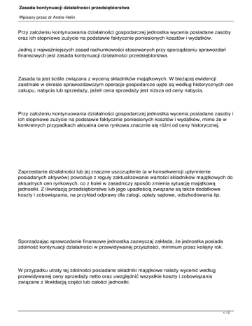 Zasada kontynuacji działalności przedsiębiorstwa Wpisany przez dr Andre Helin Przy założeniu kontynuowania działalności gospodarczej jednostka wycenia posiadane zasoby oraz ich stopniowe zużycie na podstawie faktycznie poniesionych kosztów i wydatków. Jedną z najważniejszych zasad rachunkowości stosowanych przy sporządzaniu sprawozdań finansowych jest zasada kontynuacji działalności przedsiębiorstwa. Zasada ta jest ściśle związana z wyceną składników majątkowych. W bieżącej ewidencji zaistniałe w okresie sprawozdawczym operacje gospodarcze ujęte są według historycznych cen zakupu, nabycia lub sprzedaży, jeżeli cena sprzedaży jest niższa od ceny nabycia. Przy założeniu kontynuowania działalności gospodarczej jednostka wycenia posiadane zasoby i ich stopniowe zużycie na podstawie faktycznie poniesionych kosztów i wydatków, mimo że w konkretnych przypadkach aktualna cena rynkowa znacznie się różni od ceny historycznej. Zaprzestanie działalności lub jej znaczne uszczuplenie (a w konsekwencji upłynnienie posiadanych aktywów) powoduje z reguły zaktualizowanie wartości składników majątkowych do aktualnych cen rynkowych, co z kolei w zasadniczy sposób zmienia sytuację majątkową jednostki. Z likwidacją przedsiębiorstwa lub jego upadłością związane są także dodatkowe koszty i zobowiązania, na przykład odprawy dla załogi, opłaty sądowe, odszkodowania itp. Sporządzając sprawozdanie finansowe jednostka zazwyczaj zakłada, że jednostka posiada zdolność kontynuacji działalności w przewidywanej przyszłości, minimum przez kolejny rok. W przypadku utraty tej zdolności posiadane składniki majątkowe należy wycenić według przewidywanej ceny sprzedaży netto oraz uwzględnić wszystkie koszty i zobowiązania związane z likwidacją części lub całości jednostki. 1/2 Zasada kontynuacji działalności przedsiębiorstwa Wpisany przez dr Andre Helin W trakcie badania sprawozdania finansowego biegły rewident powinien ocenić czy jednostka nadal spełnia kryteria sporządzania sprawozdania finansowego na podstawie założenia kontynuacji dotychczasowej działalności. Wśród zjawisk wskazujących na zagrożenie kontynuacji działalności można wymienić: - poniesione straty przewyższające kapitał podstawowy, brak płynności (ograniczone możliwości spłaty zobowiązań), utratę rynku zbytu, przestarzałą technologię. 2/2