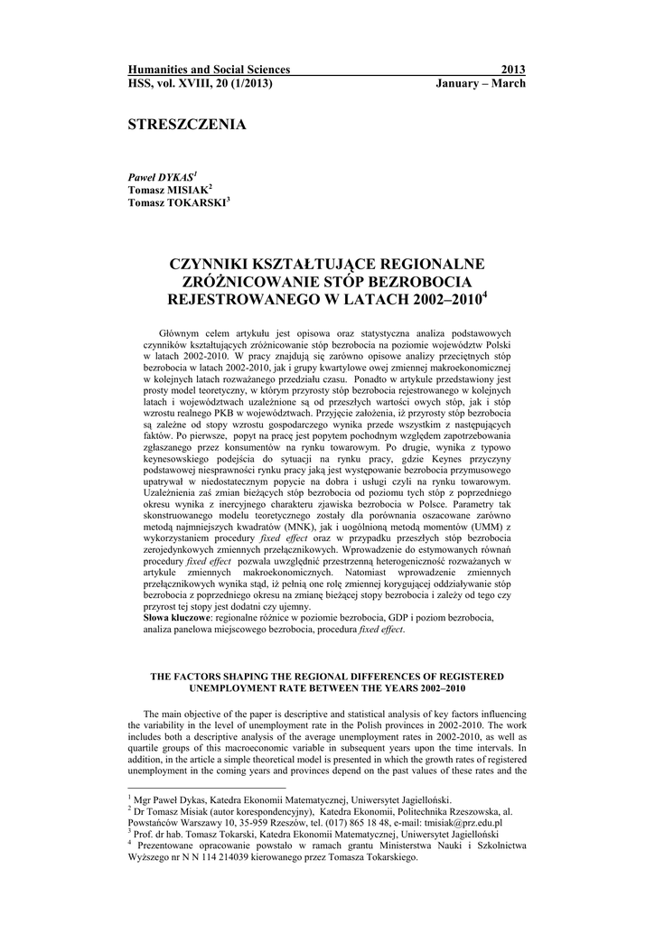 Humanities and Social Sciences HSS, vol. XVIII, 20 (1/2013) 2013 January – March STRESZCZENIA Paweł DYKAS1 Tomasz MISIAK2 Tomasz TOKARSKI3 CZYNNIKI KSZTAŁTUJĄCE REGIONALNE ZRÓŻNICOWANIE STÓP BEZROBOCIA REJESTROWANEGO W LATACH 2002–20104 Głównym celem artykułu jest opisowa oraz statystyczna analiza podstawowych czynników kształtujących zróżnicowanie stóp bezrobocia na poziomie województw Polski w latach 2002-2010. W pracy znajdują się zarówno opisowe analizy przeciętnych stóp bezrobocia w latach 2002-2010, jak i grupy kwartylowe owej zmiennej makroekonomicznej w kolejnych latach rozważanego przedziału czasu. Ponadto w artykule przedstawiony jest prosty model teoretyczny, w którym przyrosty stóp bezrobocia rejestrowanego w kolejnych latach i województwach uzależnione są od przeszłych wartości owych stóp, jak i stóp wzrostu realnego PKB w województwach. Przyjęcie założenia, iż przyrosty stóp bezrobocia są zależne od stopy wzrostu gospodarczego wynika przede wszystkim z następujących faktów. Po pierwsze, popyt na pracę jest popytem pochodnym względem zapotrzebowania zgłaszanego przez konsumentów na rynku towarowym. Po drugie, wynika z typowo keynesowskiego podejścia do sytuacji na rynku pracy, gdzie Keynes przyczyny podstawowej niesprawności rynku pracy jaką jest występowanie bezrobocia przymusowego upatrywał w niedostatecznym popycie na dobra i usługi czyli na rynku towarowym. Uzależnienia zaś zmian bieżących stóp bezrobocia od poziomu tych stóp z poprzedniego okresu wynika z inercyjnego charakteru zjawiska bezrobocia w Polsce. Parametry tak skonstruowanego modelu teoretycznego zostały dla porównania oszacowane zarówno metodą najmniejszych kwadratów (MNK), jak i uogólnioną metodą momentów (UMM) z wykorzystaniem procedury fixed effect oraz w przypadku przeszłych stóp bezrobocia zerojedynkowych zmiennych przełącznikowych. Wprowadzenie do estymowanych równań procedury fixed effect pozwala uwzględnić przestrzenną heterogeniczność rozważanych w artykule zmiennych makroekonomicznych. Natomiast wprowadzenie zmiennych przełącznikowych wynika stąd, iż pełnią one rolę zmiennej korygującej oddziaływanie stóp bezrobocia z poprzedniego okresu na zmianę bieżącej stopy bezrobocia i zależy od tego czy przyrost tej stopy jest dodatni czy ujemny. Słowa kluczowe: regionalne różnice w poziomie bezrobocia, GDP i poziom bezrobocia, analiza panelowa miejscowego bezrobocia, procedura fixed effect. THE FACTORS SHAPING THE REGIONAL DIFFERENCES OF REGISTERED UNEMPLOYMENT RATE BETWEEN THE YEARS 2002–2010 The main objective of the paper is descriptive and statistical analysis of key factors influencing the variability in the level of unemployment rate in the Polish provinces in 2002-2010. The work includes both a descriptive analysis of the average unemployment rates in 2002-2010, as well as quartile groups of this macroeconomic variable in subsequent years upon the time intervals. In addition, in the article a simple theoretical model is presented in which the growth rates of registered unemployment in the coming years and provinces depend on the past values of these rates and the 1 Mgr Paweł Dykas, Katedra Ekonomii Matematycznej, Uniwersytet Jagielloński. Dr Tomasz Misiak (autor korespondencyjny), Katedra Ekonomii, Politechnika Rzeszowska, al. Powstańców Warszawy 10, 35-959 Rzeszów, tel. (017) 865 18 48, e-mail: [email protected] 3 Prof. dr hab. Tomasz Tokarski, Katedra Ekonomii Matematycznej, Uniwersytet Jagielloński 4 Prezentowane opracowanie powstało w ramach grantu Ministerstwa Nauki i Szkolnictwa Wyższego nr N N 114 214039 kierowanego przez Tomasza Tokarskiego. 2 real growth of GDP in the provinces. Assuming that the increases in the unemployment rates depend on the rate of economic growth results mainly from the following facts. Firstly, the demand for labor is a derived demand requested by the consumer in the commodity market. Secondly, it is the result of the typical Keynesian approach to the situation on the labor market, where Keynes as the reasons of unemployment saw in insufficient demand for goods and services, i.e. on the commodity market. Thus the dependence of the current unemployment rates on the level of these rates from the previous period results from the inertial nature of unemployment in Poland. Parameters of such a constructed theoretical model were estimated both by the ordinary least squares method (OLS) and the generalized method of moments (GMM) applying the fixed effect procedure and effect and dummy variables which act as switches in case of the past unemployment rate. Introduction of the fixed effect procedure to the estimated equations allows to take into account the spatial heterogeneity of the macroeconomic variables considered in the article. However, the introduction of the dummy variables stems from the fact that they are as a corrective variable of the impact of unemployment rates from the previous period on the change of the current unemployment rate and this depends on whether the rate of growth is positive or negative. Keywords: regional differences in unemployment rate, GDP and the unemployment rate, the panel analysis of regional unemployment, fixed effect procedure. DOI:10.7862/rz.2013.hss.1 --------------------------------------------------------------------------------------Julia Anna GROCHOCKA5 POLITYKA SPOŁECZNA W PROGRAMACH PRAWA I SPRAWIEDLIWOŚCI (2005–2007) Polityka społeczna to specyficzny instrument stosowany przez rządy w celu regulowania i uzupełnienia instytucji rynku pracy oraz struktur społecznych. Ponadto polityka społeczna jest definiowana jako usługi społeczne, takie jak zdrowie, zatrudnienie, edukacja i bezpieczeństwo (zabezpieczenie) społeczne. Musimy pamiętać, że polityka społeczna dotyczy również redystrybucji, sprawiedliwości społecznej oraz ochrony przed niedostosowaniem społecznym. Rząd w Polsce powinien wykorzystywać 