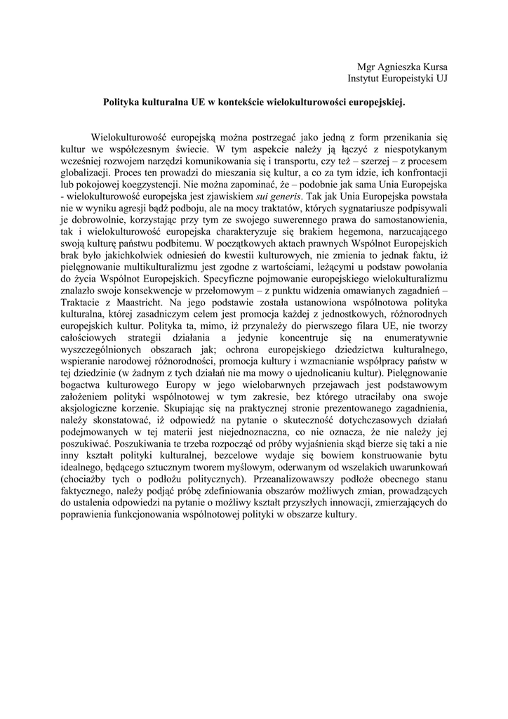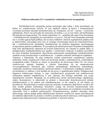 Mgr Agnieszka Kursa Instytut Europeistyki UJ Polityka kulturalna UE w kontekście wielokulturowości europejskiej. Wielokulturowość europejską można postrzegać jako jedną z form przenikania się kultur we współczesnym świecie. W tym aspekcie należy ją łączyć z niespotykanym wcześniej rozwojem narzędzi komunikowania się i transportu, czy też – szerzej – z procesem globalizacji. Proces ten prowadzi do mieszania się kultur, a co za tym idzie, ich konfrontacji lub pokojowej koegzystencji. Nie można zapominać, że – podobnie jak sama Unia Europejska - wielokulturowość europejska jest zjawiskiem sui generis. Tak jak Unia Europejska powstała nie w wyniku agresji bądź podboju, ale na mocy traktatów, których sygnatariusze podpisywali je dobrowolnie, korzystając przy tym ze swojego suwerennego prawa do samostanowienia, tak i wielokulturowość europejska charakteryzuje się brakiem hegemona, narzucającego swoją kulturę państwu podbitemu. W początkowych aktach prawnych Wspólnot Europejskich brak było jakichkolwiek odniesień do kwestii kulturowych, nie zmienia to jednak faktu, iż pielęgnowanie multikulturalizmu jest zgodne z wartościami, leżącymi u podstaw powołania do życia Wspólnot Europejskich. Specyficzne pojmowanie europejskiego wielokulturalizmu znalazło swoje konsekwencje w przełomowym – z punktu widzenia omawianych zagadnień – Traktacie z Maastricht. Na jego podstawie została ustanowiona wspólnotowa polityka kulturalna, której zasadniczym celem jest promocja każdej z jednostkowych, różnorodnych europejskich kultur. Polityka ta, mimo, iż przynależy do pierwszego filara UE, nie tworzy całościowych strategii działania a jedynie koncentruje się na enumeratywnie wyszczególnionych obszarach jak; ochrona europejskiego dziedzictwa kulturalnego, wspieranie narodowej różnorodności, promocja kultury i wzmacnianie współpracy państw w tej dziedzinie (w żadnym z tych działań nie ma mowy o ujednolicaniu kultur). Pielęgnowanie bogactwa kulturowego Europy w jego wielobarwnych przejawach jest podstawowym założeniem polityki wspólnotowej w tym zakresie, bez którego utraciłaby ona swoje aksjologiczne korzenie. Skupiając się na praktycznej stronie prezentowanego zagadnienia, należy skonstatować, iż odpowiedź na pytanie o skuteczność dotychczasowych działań podejmowanych w tej materii jest niejednoznaczna, co nie oznacza, że nie należy jej poszukiwać. Poszukiwania te trzeba rozpocząć od próby wyjaśnienia skąd bierze się taki a nie inny kształt polityki kulturalnej, bezcelowe wydaje się bowiem konstruowanie bytu idealnego, będącego sztucznym tworem myślowym, oderwanym od wszelakich uwarunkowań (chociażby tych o podłożu politycznych). Przeanalizowawszy podłoże obecnego stanu faktycznego, należy podjąć próbę zdefiniowania obszarów możliwych zmian, prowadzących do ustalenia odpowiedzi na pytanie o możliwy kształt przyszłych innowacji, zmierzających do poprawienia funkcjonowania wspólnotowej polityki w obszarze kultury. Bibliografia: 1. B. Bernaś, Unia Europejska na przełomie tysiącleci, Wrocław 2002. 2. Czy klęska wielokulturowości? (red). nauk. Hanna Mamzer, Poznań 2008. 3. Europa. Szansa dla Kultury – finansowanie przedsięwzięć kulturalnych, oprac. Punkt Kontaktowy do Spraw Kultury, Ministerstwo Kultury, Warszawa 2004. 4. Dylematy wielokulturowości, (red). Wojciech Kalaga, Kraków 2004. 5. Integracja Europejska, (red.) M. Kuniński, Kraków 2000. 6. K. Krzysztofek, Kultura a modernizacja społeczna, Warszawa 1993. 7. Kultura ma znaczenie, (red.) L. E. Harrison, S. P. Huntington, przeł. S. Dymczyk, Poznań 2003. 8. Międzynarodowe stosunki kulturalne. Teksty źródłowe, opr. Ł. Leszczenko, Wrocław 2004. 9. Międzynarodowe stosunki kulturalne. Wybór dokumentów i literatury, opr. Cz. Lewandowski, Wrocław 2001. 10. K. Waluch, Finansowanie kultury w programach i funduszach Unii Europejskiej, Płock 2004. 11. K. Waluch, Polityka kulturalna Unii Europejskiej, Płock 2004. 12. Pogranicza i multikulturalizm, (red). K. Krzysztofek, A. Sadowski, Białystok 2004. 13. Tożsamość europejska – wielokulturowość – globalizacja, (red). J. Beksiński, Włocławek 2007. 14. Wielokulturowość – międzykulturowość - transkulturowość w perspektywie europejskiej i pozaeuropejskiej, (red). A. Barska, M. Korzeniowski, Opole 2007. 15. Wzory wielokulturowości we współczesnym świecie, (red). K. Golemo, T. Paleczny, E. Wiącek, Kraków 2006.