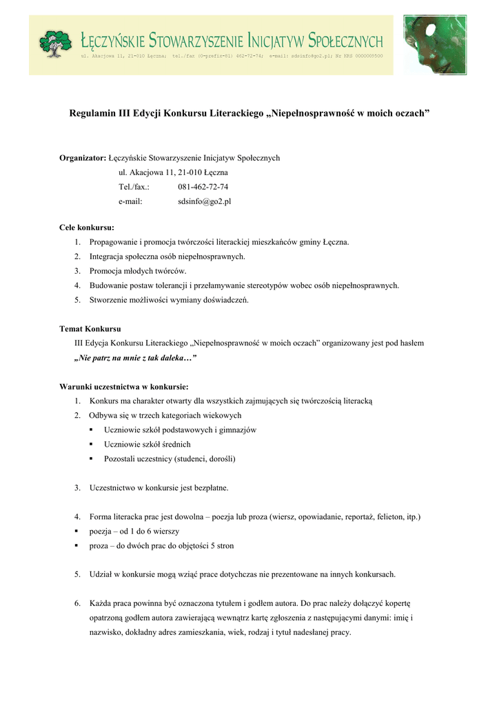 Regulamin III Edycji Konkursu Literackiego „Niepełnosprawność w moich oczach” Organizator: Łęczyńskie Stowarzyszenie Inicjatyw Społecznych ul. Akacjowa 11, 21-010 Łęczna Tel./fax.: 081-462-72-74 e-mail: [email protected] Cele konkursu: 1. Propagowanie i promocja twórczości literackiej mieszkańców gminy Łęczna. 2. Integracja społeczna osób niepełnosprawnych. 3. Promocja młodych twórców. 4. Budowanie postaw tolerancji i przełamywanie stereotypów wobec osób niepełnosprawnych. 5. Stworzenie moŜliwości wymiany doświadczeń. Temat Konkursu III Edycja Konkursu Literackiego „Niepełnosprawność w moich oczach” organizowany jest pod hasłem „Nie patrz na mnie z tak daleka…” Warunki uczestnictwa w konkursie: 1. Konkurs ma charakter otwarty dla wszystkich zajmujących się twórczością literacką 2. Odbywa się w trzech kategoriach wiekowych Uczniowie szkół podstawowych i gimnazjów Uczniowie szkół średnich Pozostali uczestnicy (studenci, dorośli) 3. Uczestnictwo w konkursie jest bezpłatne. 4. Forma literacka prac jest dowolna – poezja lub proza (wiersz, opowiadanie, reportaŜ, felieton, itp.) poezja – od 1 do 6 wierszy proza – do dwóch prac do objętości 5 stron 5. Udział w konkursie mogą wziąć prace dotychczas nie prezentowane na innych konkursach. 6. KaŜda praca powinna być oznaczona tytułem i godłem autora. Do prac naleŜy dołączyć kopertę opatrzoną godłem autora zawierającą wewnątrz kartę zgłoszenia z następującymi danymi: imię i nazwisko, dokładny adres zamieszkania, wiek, rodzaj i tytuł nadesłanej pracy. 7. Ostateczny termin nadsyłania prac mija z dniem 06.06.2007r. Prace moŜna składać osobiście lub nadsyłać za pośrednictwem poczty na wskazany adres: Łęczyńskie Stowarzyszenie Inicjatyw Społecznych, ul. Akacjowa 11, 21-010 Łęczna Prace moŜna składać takŜe w bibliotekach współpracujących przy organizacji Konkursu: - Powiatowa Biblioteka Publiczna w Łęcznej ul. Jana Pawła II 95, - Miejsko–Gminna Biblioteka Publiczna ul. BoŜniczna 21 oraz w jej filiach. 8. Uczestnicy nadsyłają prace na własny koszt. Na kopertach prosimy umieszczać napis „Konkurs literacki” 9. Komisja konkursowa złoŜona z niezaleŜnych przedstawicieli świata kultury oceni nadesłane prace – przyzna nagrody i wyróŜnienia. Komisja będzie uwzględniała zgodność tematyki utworu z hasłem przewodnim tegorocznego Konkursu: „Nie patrz na mnie z tak daleka…”. 10. Decyzje jury są ostateczne. Obrady Komisji Konkursowej odbędą się w dniach 12-13.06.2007. 11. Rozstrzygnięcie konkursu nastąpi 28 czerwca 2007 podczas gali konkursu „Niepełnosprawność w moich oczach”, na której laureaci otrzymają nagrody, a ich prace zostaną zaprezentowane. 12. Prace nagrodzone i wyróŜnione zostaną opublikowane w tomiku poezji i prozy (katalogu pokonkursowym), organizator zastrzega sobie prawo publikacji nagrodzonych prac bez wypłacenia dodatkowych honorariów. 13. Prace nie spełniające warunków konkursu zawartych w regulaminie zostaną odrzucone. Wszystkich dodatkowych informacji dotyczących konkursu udziela p. Ewa Kaźmierczak Tel.: 081-462-72-74 Serdecznie zapraszamy do udziału w konkursie!