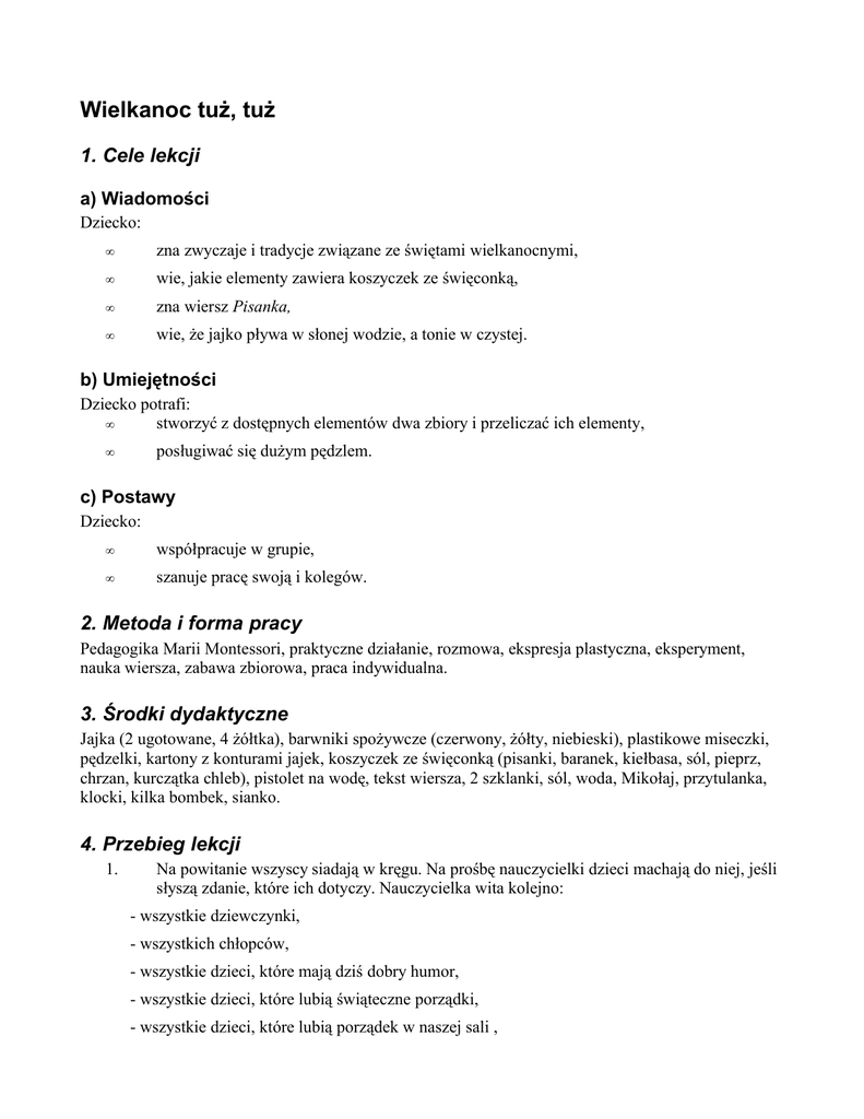 Wielkanoc tuż, tuż 1. Cele lekcji a) Wiadomości Dziecko: • zna zwyczaje i tradycje związane ze świętami wielkanocnymi, • wie, jakie elementy zawiera koszyczek ze święconką, • zna wiersz Pisanka, • wie, że jajko pływa w słonej wodzie, a tonie w czystej. b) Umiejętności Dziecko potrafi: • stworzyć z dostępnych elementów dwa zbiory i przeliczać ich elementy, posługiwać się dużym pędzlem. • c) Postawy Dziecko: • współpracuje w grupie, • szanuje pracę swoją i kolegów. 2. Metoda i forma pracy Pedagogika Marii Montessori, praktyczne działanie, rozmowa, ekspresja plastyczna, eksperyment, nauka wiersza, zabawa zbiorowa, praca indywidualna. 3. Środki dydaktyczne Jajka (2 ugotowane, 4 żółtka), barwniki spożywcze (czerwony, żółty, niebieski), plastikowe miseczki, pędzelki, kartony z konturami jajek, koszyczek ze święconką (pisanki, baranek, kiełbasa, sól, pieprz, chrzan, kurczątka chleb), pistolet na wodę, tekst wiersza, 2 szklanki, sól, woda, Mikołaj, przytulanka, klocki, kilka bombek, sianko. 4. Przebieg lekcji 1. Na powitanie wszyscy siadają w kręgu. Na prośbę nauczycielki dzieci machają do niej, jeśli słyszą zdanie, które ich dotyczy. Nauczycielka wita kolejno: - wszystkie dziewczynki, - wszystkich chłopców, - wszystkie dzieci, które mają dziś dobry humor, - wszystkie dzieci, które lubią świąteczne porządki, - wszystkie dzieci, które lubią porządek w naszej sali , - wszystkie dzieci, które lubią czekoladowe jajka – niespodzianki, - wszystkie dzieci, które lubią święta wielkanocne. 2. Z uwagi na zbliżającą się Wielkanoc prowadząca proponuje przeprowadzić świąteczne porządki. Dzieci pod kierunkiem i przy pomocy nauczycielki sprzątają w sali (układają zabawki, książki, zamiatają podłogę i dywan w sali, podlewają kwiaty). 3. Po zakończeniu pracy nauczycielka rozmawia z dziećmi na temat zwyczajów i tradycji związanych ze zbliżającymi się świętami wielkanocnymi. Przynosi przygotowany koszyczek ze święconką i wraz z dziećmi analizuje jego zawartość ze szczególnym zwróceniem uwagi na wielkanocne pisanki. 4. Kolejne ćwiczenie to nauka wiersza A. Łady-Grodzickiej Pisanka (Łada-Grodzicka 2005, str. 47). Nauczycielka dwukrotnie recytuje tekst utworu. Następnie dzieci powtarzają za nią kolejne wersy tekstu, a potem wszyscy wspólnie mówią cały wiersz. 5. Prowadząca proponuje malowanie pisanek wielkanocnych farbą jajeczną na kartonie. Nauczycielka przygotowuje w czterech miseczkach farby z żółtek jaj wymieszanych z odrobiną barwnika spożywczego (czerwonego, niebieskiego, żółtego oraz wszystkich trzech jednocześnie). Dzieci, nanosząc za pomocą pędzelków farbę, wypełniają narysowane kontury pisanki dowolnymi wzorkami. Następnie pozostawiają prace do wyschnięcia, a potem wspólnie omawiają każdą pracę. 6. Gdy prace schną, nauczycielka przeprowadza eksperyment fizyczny „Czy jajko potrafi pływać?”. W tym celu obiera ze skorupek dwa ugotowane na twardo jajka, a następnie wlewa do dwóch jednakowych szklanek wodę. Do jednej szklanki dosypuje niewielką ilość soli. Ostrożnie wkłada po jednym jajku do każdej ze szklanek. Dzieci widzą, że jajko w naczyniu ze słoną wodą pływa, natomiast w szklance z czystą wodą tonie. Każde dziecko po kolei próbuje swoich sił w przeprowadzeniu doświadczenia i próbuje ocalić od zatonięcia jajko wrzucone do czystej wody. 7. Ćwiczeniem kończącym zajęcia jest tworzenie zbioru pisanek i zbioru wszystkich pozostałych przedmiotów, które kojarzą się ze świętami wielkanocnymi. Spośród przygotowanych przez nauczycielkę rekwizytów dzieci wybierają pisanki i układają je do żółtej szarfy, a pozostałe przedmioty związane z Wielkanocą (kurczątko, baranek, koszyczek, pistolet na wodę) do zielonej szarfy. Przedmioty niezwiązane z Wielkanocą (Mikołaj, bombki, sianko, klocki, przytulanka) pozostają poza szarfami. Zadaniem starszych dzieci jest przeliczanie elementów obu zbiorów. 5. Bibliografia 1. Kohl M.A., Sztuka dla przedszkolaka. Bawimy się sztuką., K. E. Liber, Warszawa 2005. 2. Łada – Grodzicka A., ABC trzylatka. Rozkład materiału, Wydawnictwa Szkolne i Pedagogiczne, Warszawa 2005. 3. Łada – Grodzicka A. i in., ABC…Program wychowania przedszkolnego XXI wieku, Wydawnictwa Szkolne i Pedagogiczne, Warszawa 2000. 4. Steenberg U., Pedagogika Marii Montessori w przedszkolu, Jedność, Kielce 2004. 5. http:// www.gwo.pl. 6. Załączniki brak 7. Czas trwania lekcji 45 minut 8. Uwagi do scenariusza Zajęcia zostały przeprowadzone w grupie pięciorga dzieci, niejednorodnej wiekowo (2,5 – 5 lat, grupa Montessori).