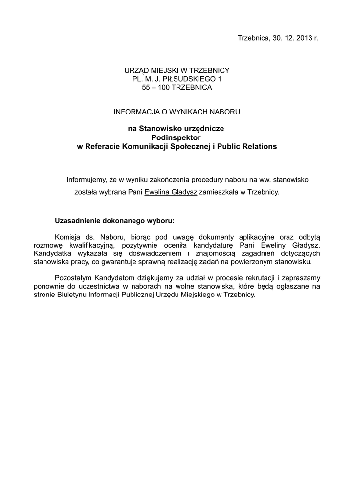 Trzebnica, 30. 12. 2013 r. URZĄD MIEJSKI W TRZEBNICY PL. M. J. PIŁSUDSKIEGO 1 55 – 100 TRZEBNICA INFORMACJA O WYNIKACH NABORU na Stanowisko urzędnicze Podinspektor w Referacie Komunikacji Społecznej i Public Relations Informujemy, że w wyniku zakończenia procedury naboru na ww. stanowisko została wybrana Pani Ewelina Gładysz zamieszkała w Trzebnicy. Uzasadnienie dokonanego wyboru: Komisja ds. Naboru, biorąc pod uwagę dokumenty aplikacyjne oraz odbytą rozmowę kwalifikacyjną, pozytywnie oceniła kandydaturę Pani Eweliny Gładysz. Kandydatka wykazała się doświadczeniem i znajomością zagadnień dotyczących stanowiska pracy, co gwarantuje sprawną realizację zadań na powierzonym stanowisku. Pozostałym Kandydatom dziękujemy za udział w procesie rekrutacji i zapraszamy ponownie do uczestnictwa w naborach na wolne stanowiska, które będą ogłaszane na stronie Biuletynu Informacji Publicznej Urzędu Miejskiego w Trzebnicy.