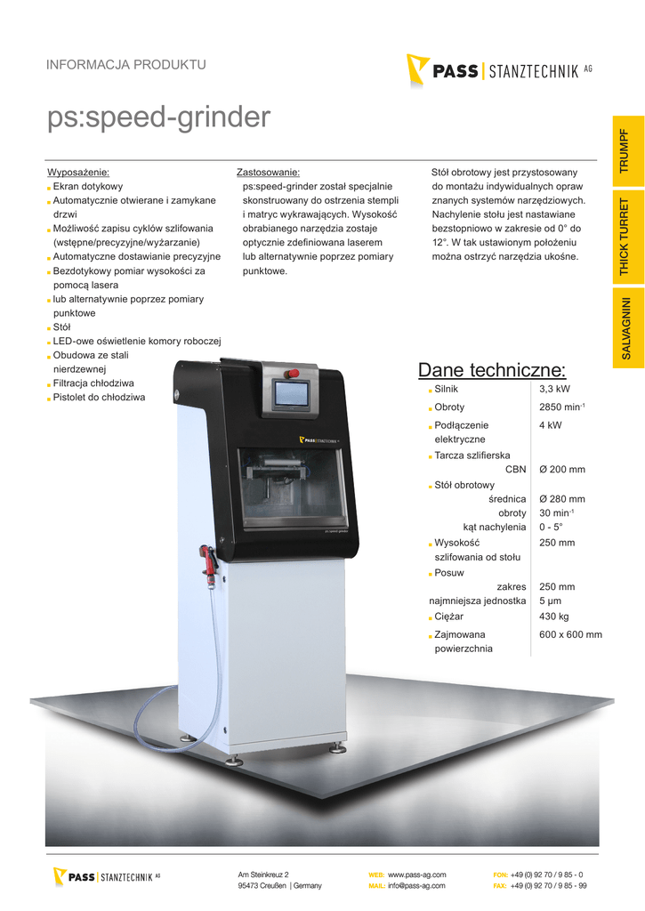 Zastosowanie: ps:speed-grinder został specjalnie skonstruowany do ostrzenia stempli i matryc wykrawających. Wysokość obrabianego narzędzia zostaje optycznie zdefiniowana laserem lub alternatywnie poprzez pomiary punktowe. Stół obrotowy jest przystosowany do montażu indywidualnych opraw znanych systemów narzędziowych. Nachylenie stołu jest nastawiane bezstopniowo w zakresie od 0° do 12°. W tak ustawionym położeniu można ostrzyć narzędzia ukośne. Dane techniczne: Charakterystyka: Silnik 3,3 kW Obroty 2850 min-1 Podłączenie elektryczne 4 kW Tarcza szlifierska CBN Ø 200 mm Stół obrotowy średnica obroty kąt nachylenia Ø 280 mm 30 min-1 0 - 5° Wysokość szlifowania od stołu 250 mm Posuw zakres najmniejsza jednostka Am Steinkreuz 2 95473 Creußen | Germany 250 mm 5 µm Ciężar 430 kg Zajmowana powierzchnia 600 x 600 mm WEB:www.pass-ag.com FON:+49 (0) 92 70 / 9 85 - 0 MAIL:[email protected] FAX: +49 (0) 92 70 / 9 85 - 99 THICK TURRET Wyposażenie: Ekran dotykowy Automatycznie otwierane i zamykane drzwi Możliwość zapisu cyklów szlifowania (wstępne/precyzyjne/wyżarzanie) Automatyczne dostawianie precyzyjne Bezdotykowy pomiar wysokości za pomocą lasera lub alternatywnie poprzez pomiary punktowe Stół LED-owe oświetlenie komory roboczej Obudowa ze stali nierdzewnej Filtracja chłodziwa Pistolet do chłodziwa SALVAGNINI ps:speed-grinder TRUMPF INFORMACJA PRODUKTU