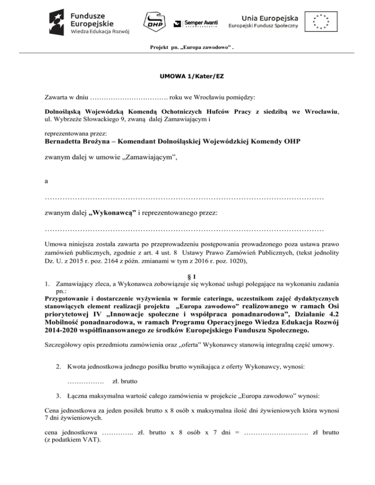 Projekt pn. „Europa zawodowo” . UMOWA 1/Kater/EZ Zawarta w dniu ……………………………. roku we Wrocławiu pomiędzy: Dolnośląską Wojewódzką Komendą Ochotniczych Hufców Pracy z siedzibą we Wrocławiu, ul. Wybrzeże Słowackiego 9, zwaną dalej Zamawiającym i reprezentowana przez: Bernadetta Brożyna – Komendant Dolnośląskiej Wojewódzkiej Komendy OHP zwanym dalej w umowie „Zamawiającym”, a ………………………………………………………………………………………………… zwanym dalej „Wykonawcą” i reprezentowanego przez: ………………………………………………………………………………………………… Umowa niniejsza została zawarta po przeprowadzeniu postępowania prowadzonego poza ustawa prawo zamówień publicznych, zgodnie z art. 4 ust. 8 Ustawy Prawo Zamówień Publicznych, (tekst jednolity Dz. U. z 2015 r. poz. 2164 z późn. zmianami w tym z 2016 r. poz. 1020), §1 1. Zamawiający zleca, a Wykonawca zobowiązuje się wykonać usługi polegające na wykonaniu zadania pn.: Przygotowanie i dostarczenie wyżywienia w formie cateringu, uczestnikom zajęć dydaktycznych stanowiących element realizacji projektu „Europa zawodowo” realizowanego w ramach Osi priorytetowej IV „Innowacje społeczne i współpraca ponadnarodowa”, Działanie 4.2 Mobilność ponadnarodowa, w ramach Programu Operacyjnego Wiedza Edukacja Rozwój 2014-2020 współfinansowanego ze środków Europejskiego Funduszu Społecznego. Szczegółowy opis przedmiotu zamówienia oraz „oferta” Wykonawcy stanowią integralną część umowy. 2. Kwota jednostkowa jednego posiłku brutto wynikająca z oferty Wykonawcy, wynosi: ……………. zł. brutto 3. Łączna maksymalna wartość całego zamówienia w projekcie „Europa zawodowo” wynosi: Cena jednostkowa za jeden posiłek brutto x 8 osób x maksymalna ilość dni żywieniowych która wynosi 7 dni żywieniowych. cena jednostkowa ………….. zł. brutto x 8 osób x 7 dni = ………………………. zł brutto (z podatkiem VAT). Projekt pn. „Europa zawodowo” . 5. Ostateczna wysokość wynagrodzenia zostanie określona na podstawie faktycznej liczby osób korzystających z usługi oraz stawki na jedną osobę wskazaną w ust. 2-3 6. Wydatki w ramach projektu będą ponoszone zgodnie z projektem Krajowych Wytycznych dotyczących kwalifikowalności wydatków ze środków Inicjatywy na rzecz zatrudnienia osób młodych i Europejskiego Funduszu Społecznego w ramach Programu Operacyjnego Wiedza Edukacja Rozwój. 7. Płatność zostanie uiszczona na podstawie faktury/rachunku wystawionego przez Wykonawcę, po otrzymaniu przez Zamawiającego środków finansowych z jednostki nadrzędnej Komendy Głównej Ochotniczych Hufców Pracy w Warszawie przeznaczonych na finansowanie projektu "Eiropa zawodowo". 8. Środki na uregulowanie zobowiązań finansowych są zabezpieczone z Rezerwy celowej budżetu środków europejskich i budżetu Państwa. W związku z możliwymi opóźnieniami w przekazywaniu funduszy z rezerwy celowej środków europejskich i rezerwy celowej budżetu państwa, płatność może zostać dokonana w terminie późniejszym, nie dłuższym jednak niż 30 dni od daty przekazania środków do dyspozycji Zamawiającego. 9. Wykonawca winien wystawiać faktury/rachunki według wskazań Zamawiającego, po zakończeniu każdego zadania realizowanego w ramach projektu. Suma rachunków/faktur nie może przekroczyć kwoty określonej w ust. 3. 10. Podstawą do wystawienia faktury będzie dołączenie rozliczenia zrealizowanego zamówienia zawierające: podpisane imienne pokwitowanie odbioru posiłków w każdym dniu żywieniowym danego miesiąca lub innego okresu rozliczeniowego miesięczne/tygodniowe menu wydawanych posiłków rozpisane na poszczególne dni żywieniowe 11. Wydawanie posiłków odbywać się będzie w dniu zajęć wg harmonogramu zajęć projektu, Koordynator terenowy projektu w imieniu Zamawiającego każdorazowo określi datę, kiedy uczestnicy będą korzystać z wyżywienia. §2 1. Przedmiotem zamówienia jest wykonanie usługi przygotowania, dowozu i podania ciepłych posiłków wraz z zapewnionym serwisem cateringowym polegającym na zabraniu naczyń i sztućców po spożytym posiłku. Wykonawca zobowiązuje się przygotować posiłki i dostarczyć je własnym transportem do miejsca wskazanego przez Zamawiającego, w którym będą odbywały się zajęcia. 2. Wykonawca zobowiązuje się dostarczyć posiłki za pomocą odpowiednich urządzeń zapewniających utrzymanie ich właściwej jakości i temperatury. 3. Wykonawca zobowiązuje się do wykonania umowy z najwyższą starannością i zachowaniem wymogów sanitarnych. Jednocześnie oświadcza, iż osoby zatrudnione przy przygotowywaniu i dostarczaniu posiłków posiadają aktualne karty zdrowia. 4. Przygotowywanie posiłków odbywać się musi wyłącznie na bazie pełnowartościowych produktów wysokiej jakości oraz półproduktów, posiadających stosowne atesty, świadectwa, protokoły badań, itp. oraz zgodnie z określonymi normami żywienia. Jakość posiłków (w tym produktów używanych do ich sporządzenia) i procedury Wykonawcy powinny być zgodne z ustawą z dnia 25 sierpnia 2006 r. o bezpieczeństwie żywności i żywienia. §3 Termin realizacji zadania: od dnia podpisania umowy do 16.09.2016 r. Projekt pn. „Europa zawodowo” . §4 1. Zamawiający ma prawo w każdym okresie realizacji zamówienia zwrócić się do Wykonawcy, który oświadczył, że zatrudnia lub zatrudnił osobę niepełnosprawną na minimum 1/4 etatu na podstawie umowy o pracę do realizacji zamówienia w zakresie przygotowywania posiłków dla zrealizowania przedmiotu zamówienia, o przedstawienie dokumentacji zatrudnienia tej osoby, natomiast Wykonawca ma obowiązek dostarczyć ją w ciągu 5 dni roboczych Zamawiającemu. Wykonawca wyraża zgodę na wgląd przez Zamawiającego w dane osobowe prac