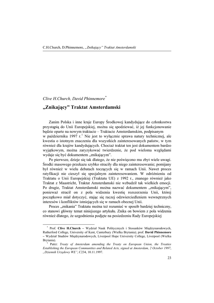 C.H.Church, D.Phinnemore, „Znikający” Traktat Amsterdamski Clive H.Church, David Phinnemore * „Znikający” Traktat Amsterdamski Zanim Polska i inne kraje Europy Środkowej kandydujące do członkostwa przystąpią do Unii Europejskiej, można się spodziewać, iż jej funkcjonowanie będzie oparte na nowym traktacie – Traktacie Amsterdamskim, podpisanym w październiku 1997 r. 1 Nie jest to wyłącznie sprawa natury technicznej, ale kwestia o istotnym znaczeniu dla wszystkich zainteresowanych państw, w tym również dla krajów kandydujących. Chociaż traktat ten jest dokumentem bardzo wyjątkowym, można zaryzykować twierdzenie, że pod wieloma względami wydaje się być dokumentem „znikającym”. Po pierwsze, dzieje się tak dlatego, że nie poświęcono mu zbyt wiele uwagi. Środki masowego przekazu szybko straciły dla niego zainteresowanie; pomijany był również w wielu debatach toczących się w ramach Unii. Nawet proces ratyfikacji nie cieszył się specjalnym zainteresowaniem. W odróżnieniu od Traktatu o Unii Europejskiej (Traktatu UE) z 1992 r., znanego również jako Traktat z Maastricht, Traktat Amsterdamski nie wzbudził tak wielkich emocji. Po drugie, Traktat Amsterdamski można nazwać dokumentem „znikającym”, ponieważ stracił on z pola widzenia kwestię rozszerzenia Unii, której początkowo miał dotyczyć, stając się raczej odzwierciedleniem wewnętrznych interesów i konfliktów istniejących się w ramach obecnej Unii. Proces „znikania” Traktatu można też rozumieć w sposób bardziej techniczny, co stanowi główny temat niniejszego artykułu. Znika on bowiem z pola widzenia również dlatego, że uzgodnienia podjęte na posiedzeniu Rady Europejskiej * Prof. Clive H.Church – Wydział Nauk Politycznych i Stosunków Międzynarodowych, Rutherford College, University of Kent, Canterbury (Wielka Brytania); prof. David Phinnemore – Wydział Studiów Międzynarodowych, Liverpool Hope University College, Liverpool (Wielka Brytania). 1 Patrz: Treaty of Amsterdam amending the Treaty on European Union, the Treaties Establishing the European Communities and Related Acts, signed at Amsterdam, 2 October 1997, „Dziennik Urzędowy WE”, C234, 10.11.1997. 23 Studia Europejskie, 2/1998 w Amsterdamie w czerwcu 1997 r. nie znalazły odzwierciedlenia w tekście podpisanym w październiku. W czerwcu szefowie państw i rządów uzgodnili szereg poprawek do traktatów założycielskich Wspólnot Europejskich i sposobu ich funkcjonowania, które zostały uporządkowane w pakiety tematyczne nie posiadające formy typowo traktatowej. Ich ministrowie natomiast podpisali później skrócony dokument, zawierający wyłącznie zmiany do owych traktatów. Dokument ten został uporządkowany pod względem chronologii i stylu w formie typowo traktatowej. Dotychczas nie wszyscy jeszcze zorientowali się, że zaszła tego rodzaju zmiana. Proces „znikania” Traktatu poszedł jednak jeszcze dalej. Poprzez eliminację zbędnych przepisów oraz konsolidację i zmianę numeracji pozostałych artykułów Traktat Amsterdamski dokonał uproszczenia dwóch najważniejszych traktatów, mianowicie Traktatu o utworzeniu Wspólnoty Europejskiej (Traktatu WE) oraz Traktatu UE. W październiku wraz z oficjalnym Traktatem Amsterdamskim zostały opublikowane ich znowelizowane wersje. Mimo że przy publikacji zaznaczono, iż stanowią tylko „materiał poglądowy”, przyćmiły one niejako nowy Traktat. Traktat Amsterdamski zapowiedział również wydanie nowych, skodyfikowanych wersji traktatów założycielskich. Choć nie będą one niosły skutków prawnych, to z pewnością spowodują odsunięcie na dalszy plan rzeczywistych zmian wprowadzonych w Amsterdamie. Sprawi to, że proces „znikania” posunie się jeszcze dalej. Celem niniejszego artykułu jest próba uchwycenia Traktatu Amsterdamskiego przed jego całkowitym „zniknięciem”, co mogłoby w jakiś sposób pomóc zainteresowanym państwom stowarzyszonym w przygotowaniu do członkostwa w UE. Artykuł próbuje zrealizować ten cel na pięć różnych sposobów. Po pierwsze, stara się wyjaśnić, jak doszło do powstania Traktatu, a zwłaszcza jego przepisów o uproszczeniu, konsolidacji oraz kodyfikacji. Po drugie, opisuje rzeczywiste zmiany uzgodnione w czerwcu w Amsterdamie, które są ogólnie lepiej znane opinii publicznej. Po trzecie, opisuje i analizuje wyniki technicznego opracowania drugiej wersji Traktatu, która została podpisana 3 października 1997 r. Po czwarte, analizuje zmiany związane z procesami uproszczenia i konsolidacji, które uruchomił Traktat Amsterdamski. Na zakończenie, spogląda w przyszłość oraz rozpatruje możliwości kodyfikacji wszystkich traktatów założycielskich. Omawiając powyższe zagadnienia, próbujemy wykazać, że jeżeli Traktat Amsterdamski ma jakieś szczególne znaczenie, to wynika ono z jego postanowień dotyczących uproszczenia. Prawdopodobnie te właśnie postanowienia wraz ze spowodowanymi przez nie procesami konsolidacji i kodyfikacji będą należeć do najtrwalszych i najbardziej praktycznych osiągnięć Amsterdamu. Na razie jednak trudno jest jednoznacznie ocenić jego rezultaty. Z jednej strony, uproszczenie i konsolidacja uczynią traktaty założycielskie aktami o charakterze 24 C.H.Church, D.Phinnemore, „Znikający” Traktat Amsterdamski bardziej konstytucyjnym pod względem formalnym, dzięki czemu mogą się stać bardziej zrozumiałe dla polskich odbiorców. Z drugiej strony, pomnażanie wersji, zmiana numeracji oraz załączanie wielkiej liczby protokołów mogą prowadzić do wielu nieporozumień. Trudno jest obecnie przewidzieć, czy te problemy zostaną rozwiązane przez kolejne nowelizacje traktatów, które nastąpią zapewne na początku następnego stulecia. 1. Konferencja Międzyrządowa i negocjacje wstępne Proces nowelizacji Traktatu opierał się na artykule N Traktatu UE. Zawiera on listę zagadnień, którymi miała się 