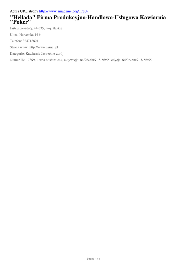 Adres URL strony http://www.smacznie.org/17809 "Hellada" Firma Produkcyjno-Handlowo-Usługowa Kawiarnia "Poker" Jastrzębie-zdrój, 44-335, woj. śląskie Ulica: Harcerska 14 b Telefon: 324718021 Strona www: http://www.jasnet.pl Kategorie: Kawiarnie Jastrzębie-zdrój Numer ID: 17809, liczba odsłon: 244, aktywacja: 04/06/2010 18:56:55, edycja: 04/06/2010 18:56:55 Strona 1 / 1