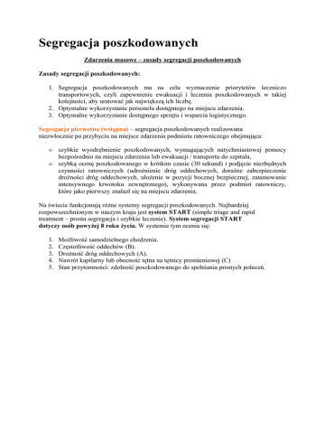 Segregacja poszkodowanych Zdarzenia masowe – zasady segregacji poszkodowanych Zasady segregacji poszkodowanych: 1. Segregacja poszkodowanych ma na celu wyznaczenie priorytetów leczniczo transportowych, czyli zapewnienie ewakuacji i leczenia poszkodowanych w takiej kolejności, aby uratować jak największą ich liczbę. 2. Optymalne wykorzystanie personelu dostępnego na miejscu zdarzenia. 3. Optymalne wykorzystanie dostępnego sprzętu i wsparcia logistycznego. Segregacja pierwotna (wstępna) – segregacja poszkodowanych realizowana niezwłocznie po przybyciu na miejsce zdarzenia podmiotu ratowniczego obejmująca: • • szybkie wyodrębnienie poszkodowanych, wymagających natychmiastowej pomocy bezpośrednio na miejscu zdarzenia lub ewakuacji / transportu do szpitala, szybką ocenę poszkodowanego w krótkim czasie (30 sekund) i podjęcie niezbędnych czynności ratowniczych (udrożnienie dróg oddechowych, doraźne zabezpieczenie drożności dróg oddechowych, ułożenie w pozycji bocznej bezpiecznej, zatamowanie intensywnego krwotoku zewnętrznego), wykonywana przez podmiot ratowniczy, które jako pierwszy znalazł się na miejscu zdarzenia. Na świecie funkcjonują różne systemy segregacji poszkodowanych. Najbardziej rozpowszechnionym w naszym kraju jest system START (simple triage and rapid treatment – prosta segregacja i szybkie leczenie). System segregacji START dotyczy osób powyżej 8 roku życia. W systemie tym ocenia się: 1. 2. 3. 4. 5. Możliwość samodzielnego chodzenia. Częstotliwość oddechów (B). Drożność dróg oddechowych (A). Nawrót kapilarny lub obecność tętna na tętnicy promieniowej (C) Stan przytomności: zdolność poszkodowanego do spełniania prostych poleceń. System JumpSTART dotyczy dzieci do 8 roku życia. Składa się podobnie jak system START z czterech etapów, kolejno oceniających zdolność do chodzenia, oddech, nawrót kapilarny i stan świadomości. Uwaga ! • • • dzieci poniżej 1 roku życia, które zostały wstępnie zakwalifikowane według schematu JumpSTART do grupy zielonej, jeżeli mają obrażenia ciała, muszą być przekwalifikowane do grupy żółtej. u małego dziecka bardzo trudno jest ocenić zdolność do samodzielnego chodzenia. Zbyt młody wiek lub trzymanie dziecka na ręku przez osobę dorosłą znacznie utrudnia ocenę tego elementu. u dzieci najbardziej miarodajnym miejscem oceny nawrotu kapilarnego jest skóra na mostku lub czole. Przy ocenie stanu świadomości JumpSTART wykorzystuje się skalę AVPU oceny świadomości, gdzie: • • • • A – przytomny, V – reaguje na głos, P – reaguje na ból, U – bez reakcji, nieprzytomny. Segregacja wtórna: • • • • • • jest realizowana po wdrożeniu medycznych czynności ratunkowych w pierwszej kolejności wobec osób poszkodowanych o najwyższym priorytecie, opiera się na pełnym badaniu poszkodowanego i dokonaniu oceny szansy przeżycia, dokonywana jest przez najbardziej doświadczony personel dostępny w danej chwili, zdolny do oceny poziomu wymaganej pomocy medycznej, ma zapewnić udzielenie jak najlepszej pomocy maksymalnej liczbie poszkodowanych, ma na celu ustalenie kolejności transportu poszkodowanych do ośrodków leczniczych, pozwala na wybór optymalnej drogi transportu (lądowa, powietrzna, wodna) zależnie od stanu poszkodowanego i dostępnych środków transportu. Uwaga ! Ważne jest, aby nie doprowadzić do niekontrolowanej ewakuacji (nie przenieść katastrofy z miejsca zdarzenia do szpitala).