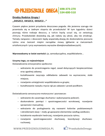 DrodzyRodziceGrupyI ,,DESZCZ,DESZCZ,DESZCZ…” Czasem piękno jesieni przysłania deszczowa pogoda. Ale jesienna szaruga nie przeniosła się w żadnym stopniu do przedszkola! W tym tygodniu dzieci poznają różne rodzaje deszczu, a także będą uczyć się, co zwiastują chmury. Przedszkolaki dowiedzą się, jak należy się ubrać, aby nie zmoknąć. Tematy związane z deszczem będąwspaniałąokazjądodoskonaleniapoczucia rytmu oraz ćwiczeń mięśni narządów mowy (głównie w ćwiczeniach ortofonicznychiprzywymawianiuwyrazówdźwiękonaśladowczych). Wprowadzamywświatwartości:ja,samodyscyplina,współdziałanie... Uczymytego,conajważniejsze Doświadczeniaemocjonalno-społeczne: - wdrażanie do przestrzegania reguł, zasad dotyczących bezpieczeństwa orazzgodnejzabawy; - kształtowanie zwyczaju odkładania zabawek na wyznaczone, stałe miejsce; - rozwijanieumiejętnościwspółdziałaniawgrupie; - kształtowanienawykumyciarąkpozabawieiprzedposiłkiem. Doświadczeniasensoryczno-motoryczneipoznawcze: - wdrażaniedouważnegosłuchaniaiwykonywaniapoleceń; - doskonalenie pamięci i spostrzegawczości wzrokowej, rozwijanie sprawnościmanualnej; - wdrażanie do posługiwania się nazwami kolorów podstawowych iokreśleniamiduży–mały;grupowanieelementówwedługwielkości; - kształceniewyobraźnitwórczej,rozwijaniepoczuciarytmu; - rozwijanie spostrzegawczości słuchowej, koordynacji słuchoworuchowej; - wzbogaceniesłownikaowyrazyokreślającewiatrideszcz; - rozwijanieorientacjiwschemaciewłasnegociała; - dostrzeganieikontynuowanieregularnościirytmów; - doskonalenie umiejętności liczenia, porównywanie liczebności przez dobieranieelementówwpary,rozumienieokreśleń:mniej,więcej; - kształtowanieumiejętnościilustrowaniatreściprostegoopowiadania; - ćwiczeniamięśninarządówmowynazgłoskach:fiu,szu,kra,kap; - opowiadanie historyjki obrazkowej i używanie określeń: na początku, potem,nakoniec. Jakwspieraćdziecko? Jesieniąnadworzebywaszaroimokro.Takapogodamożebyćpretekstemdo tworzeniadeszczowychprac–potrzebnesątylko:dużakartka,farby(najlepiej akwarele), pędzle i kubek z wodą. Podczas takiej artystycznej pracy można utrwalać z dzieckiem określenia opisujące deszcz, a przy okazji ćwiczyć jego koordynacjęwzrokowo-ruchową,motorykęmałąorazkreatywność. Wartoporozmawiaćo...ubraniunadeszczowedni W mokre jesienne dni niezbędne jest odpowiednie ubranie, które ochroni przeddeszczem.Wartoporozmawiaćzdzieckiemotym,jakistrójjestnajlepszy naniepogodę.Kalosze,płaszczprzeciwdeszczowylubkurtkai parasolkaokażą się idealne. Przedszkolaki, zajęte zabawą, czasami zapominają, że nie każde buty nadają się do brodzenia w kałuży. Dobrze jest uświadamiać dzieciom różnicewobuwiuorazzaletykaloszypodczassłoty. Wartopoczytać... Z.Stanecka,Basiaiprzedszkole,EgmontPolska DrodzyRodzicegrupyII „JESTCORAZCHŁODNIEJ” Pogodazmieniasięzdnianadzień.Drzewapogubiłyliście.Dnisącorazkrótsze, anadworzejestzimnoimokro.Wtymtygodniudziecidowiedząsię,jakważny jest dobór odpowiedniego stroju do zmieniających się warunków atmosferycznych. Utrwalą kolejność zakładania poszczególnych części garderoby, dzięki którym będzie im ciepło nawet w bardzo chłodne dni. Wyposażonewtęwiedzęodważnieczekająnazimę. Wprowadzamywświatwartości:ja,samodyscyplina,pomaganieinnym... Uczymytego,conajważniejsze Doświadczeniaemocjonalno-społeczne: - wdrażaniedoprzestrzeganiaregułzabawyorazzasadbezpieczeństwa; - kształtowanienawykumyciarąkpozabawieiprzedposiłkiem; - wdrażaniedoporozumiewaniasięumiarkowanymgłosem; - zachęcaniedopomaganiasobienawzajemwcodziennychsytuacjach. Doświadczeniasensoryczno-motoryczneipoznawcze: - rozwijanieorientacjiwschemaciewłasnegociała; - wdrażanie do uważnego słuchania, obserwowania i wykonywania poleceń; - rozwijaniesprawnościmanualnejikoordynacjiwzrokowo-ruchowej; - rozwijanie wyobraźni muzycznej i poczucia rytmu, kształcenie umiejętności wyrażania emocji poprzez ruch i muzykę (elementy muzykoterapii); - wdrażaniedopodejmowaniasamodzielnychdecyzji; - kształtowanie umiejętności określania cech wielkościowych: długi, dłuższy, najdłuższy, krótki, krótszy, najkrótszy (szalik), kontynuowania itworzenia prostych rytmów (regularności), dostrzeganie stałego następstwadniinocy; - rozwijanieumiejętnościwycinaniaikomponowaniaelementów; - doskonaleniepamięciispostrzegawczościwzrokowej; - wdrażaniedoubieraniasięstosowniedopogody; - rozwijanielogicznegomyślenia; - usprawnianie ruchomych narządów artykulacyjnych – wzmacnianie irozciąganie mięśni warg, języka, policzków, ćwiczenia oddechowe – oddychanie prawidłowym torem, poszerzanie wydolności oddechowej, kontrolowanieiwydłużaniefazywydechu; - wzbogacenie słownika o określenia: spiżarnia, zapasów bez liku, cebula wwiankach,tęgimróz; - kształtowaniezwinnościiogólnejsprawności. Jakwspieraćdziecko? Przedszkolaki w tym tygodniu rozwiną i utrwalą wiedzę o tym, jak ważne jest ciepłe ubranie w chłodne dni. Wiedza bez ćwiczeń praktycznych pozostaje jednaktylkoteorią.Wartoprzedwyjściemzdzieckiemnazewnątrzzachęcićje do tego, aby samo spróbowało wybrać stosowne do pogody ubranie oraz je założyło. Bycie wsparciem w tych czynnościach (bez wyręczania) uczy przedszkolakasamodzielności. Wartoporozmawiaćo...zapasachnazimę Zwierzęta przygotowują się do zimy, gromadząc jedzenie. Ludzie robią podobnie.Wartoporozmawiaćzdzieckiemozapasach,którerobisięwdomu rodzinnym. Być może będzie to okazja do degustacji i odkrycia nowych smaków,amożeprzyokazjipowstanąwspólniewykonaneetykietynasłoiki? Wartopoczytać... A.Królak,Zdziałki,zlasuitakietam,DwieSiostry DrodzyRodziceGrupyIII ,,WIEJEIPADA” Minionytydzieńdałnamokazjędouczeniasięrozumieniaistotyróżnorodnych zjawisk atmosferycznych charakterystycznych dla pór roku, rozumienia, żeprawa natury należy szanować, że trzeba umieć sobie znimi 