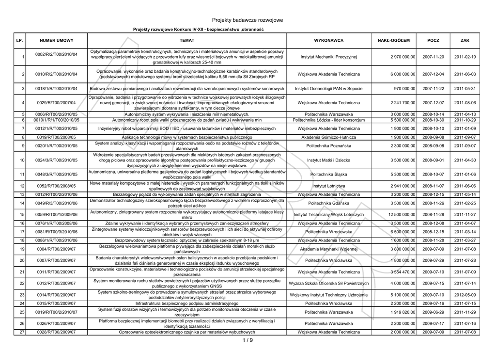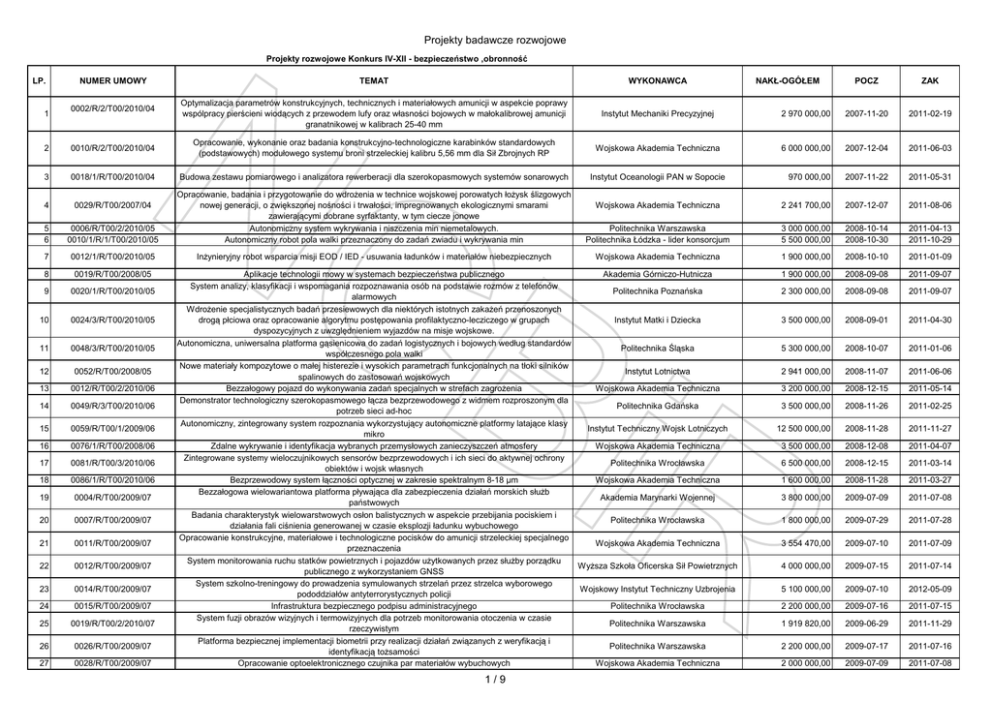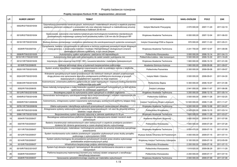 Projekty badawcze rozwojowe Projekty rozwojowe Konkurs IV-XII - bezpieczeństwo ,obronność LP. 1 NUMER UMOWY 0002/R/2/T00/2010/04 2 0010/R/2/T00/2010/04 3 0018/1/R/T00/2010/04 TEMAT WYKONAWCA Optymalizacja parametrów konstrukcyjnych, technicznych i materiałowych amunicji w aspekcie poprawy wspólpracy pierścieni wiodących z przewodem lufy oraz własności bojowych w małokalibrowej amunicji granatnikowej w kalibrach 25-40 mm Instytut Mechaniki Precyzyjnej Opracowanie, wykonanie oraz badania konstrukcyjno-technologiczne karabinków standardowych (podstawowych) modułowego systemu broni strzeleckiej kalibru 5,56 mm dla Sił Zbrojnych RP Wojskowa Akademia Techniczna Budowa zestawu pomiarowego i analizatora rewerberacji dla szerokopasmowych systemów sonarowych Instytut Oceanologii PAN w Sopocie 4 0029/R/T00/2007/04 5 6 0006/R/T00/2/2010/05 0010/1/R/1/T00/2010/05 Opracowanie, badania i przygotowanie do wdrożenia w technice wojskowej porowatych łożysk ślizgowych nowej generacji, o zwiększonej nośności i trwałości, impregnowanych ekologicznymi smarami zawierającymi dobrane syrfaktanty, w tym ciecze jonowe Autonomiczny system wykrywania i niszczenia min niemetalowych. Autonomiczny robot pola walki przeznaczony do zadań zwiadu i wykrywania min Inżynieryjny robot wsparcia misji EOD / IED - usuwania ładunków i materiałów niebezpiecznych 7 0012/1/R/T00/2010/05 8 0019/R/T00/2008/05 9 0020/1/R/T00/2010/05 10 0024/3/R/T00/2010/05 11 0048/3/R/T00/2010/05 12 0052/R/T00/2008/05 13 0012/R/T00/2/2010/06 14 0049/R/3/T00/2010/06 15 0059/R/T00/1/2009/06 16 0076/1/R/T00/2008/06 17 0081/R/T00/3/2010/06 18 0086/1/R/T00/2010/06 19 0004/R/T00/2009/07 20 0007/R/T00/2009/07 21 0011/R/T00/2009/07 22 0012/R/T00/2009/07 23 0014/R/T00/2009/07 24 0015/R/T00/2009/07 25 0019/R/T00/2/2010/07 26 0026/R/T00/2009/07 27 0028/R/T00/2009/07 POCZ ZAK 2 970 000,00 2007-11-20 2011-02-19 6 000 000,00 2007-12-04 2011-06-03 970 000,00 2007-11-22 2011-05-31 Wojskowa Akademia Techniczna 2 241 700,00 2007-12-07 2011-08-06 Politechnika Warszawska Politechnika Łódzka - lider konsorcjum 3 000 000,00 5 500 000,00 2008-10-14 2008-10-30 2011-04-13 2011-10-29 Wojskowa Akademia Techniczna Aplikacje technologii mowy w systemach bezpieczeństwa publicznego Akademia Górniczo-Hutnicza System analizy, klasyfikacji i wspomagania rozpoznawania osób na podstawie rozmów z telefonów Politechnika Poznańska alarmowych Wdrożenie specjalistycznych badań przesiewowych dla niektórych istotnych zakażeń przenoszonych drogą płciowa oraz opracowanie algorytmu postępowania profilaktyczno-lecziczego w grupach Instytut Matki i Dziecka dyspozycyjnych z uwzględnieniem wyjazdów na misje wojskowe. Autonomiczna, uniwersalna platforma gąsienicowa do zadań logistycznych i bojowych według standardów Politechnika Śląska współczesnego pola walki Nowe materiały kompozytowe o małej histerezie i wysokich parametrach funkcjonalnych na tłoki silników Instytut Lotnictwa spalinowych do zastosowań wojskowych Bezzałogowy pojazd do wykonywania zadań specjalnych w strefach zagrożenia Wojskowa Akademia Techniczna Demonstrator technologiczny szerokopasmowego łącza bezprzewodowego z widmem rozproszonym dla Politechnika Gdańska potrzeb sieci ad-hoc Autonomiczny, zintegrowany system rozpoznania wykorzystujący autonomiczne platformy latające klasy Instytut Techniczny Wojsk Lotniczych mikro Zdalne wykrywanie i identyfikacja wybranych przemysłowych zanieczyszczeń atmosfery Wojskowa Akademia Techniczna Zintegrowane systemy wieloczujnikowych sensorów bezprzewodowych i ich sieci do aktywnej ochrony Politechnika Wrocławska obiektów i wojsk własnych Bezprzewodowy system łączności optycznej w zakresie spektralnym 8-18 µm Wojskowa Akademia Techniczna Bezzałogowa wielowariantowa platforma pływająca dla zabezpieczenia działań morskich służb Akademia Marynarki Wojennej państwowych Badania charakterystyk wielowarstwowych osłon balistycznych w aspekcie przebijania pociskiem i Politechnika Wrocławska działania fali ciśnienia generowanej w czasie eksplozji ładunku wybuchowego Opracowanie konstrukcyjne, materiałowe i technologiczne pocisków do amunicji strzeleckiej specjalnego Wojskowa Akademia Techniczna przeznaczenia System monitorowania ruchu statków powietrznych i pojazdów użytkowanych przez służby porządku Wyższa Szkoła Oficerska Sił Powietrznych publicznego z wykorzystaniem GNSS System szkolno-treningowy do prowadzenia symulowanych strzelań przez strzelca wyborowego Wojskowy Instytut Techniczny Uzbrojenia pododdziałów antyterrorystycznych policji Infrastruktura bezpiecznego podpisu administracyjnego Politechnika Wrocławska System fuzji obrazów wizyjnych i termowizyjnych dla potrzeb monitorowania otoczenia w czasie Politechnika Warszawska rzeczywistym Platforma bezpiecznej implementacji biometrii przy realizacji działań związanych z weryfikacją i Politechnika Warszawska identyfikacją tożsamości Opracowanie optoelektronicznego czujnika par materiałów wybuchowych Wojskowa Akademia Techniczna 1/9 NAKŁ-OGÓŁEM 1 900 000,00 2008-10-10 2011-01-09 1 900 000,00 2008-09-08 2011-09-07 2 300 000,00 2008-09-08 2011-09-07 3 500 000,00 2008-09-01 2011-04-30 5 300 000,00 2008-10-07 2011-01-06 2 941 000,00 2008-11-07 2011-06-06 3 200 000,00 2008-12-15 2011-05-14 3 500 000,00 2008-11-26 2011-02-25 12 500 000,00 2008-11-28 2011-11-27 3 500 000,00 2008-12-08 2011-04-07 6 500 000,00 2008-12-15 2011-03-14 1 600 000,00 2008-11-28 2011-03-27 3 800 000,00 2009-07-09 2011-07-08 1 800 000,00 2009-07-29 2011-07-28 3 554 470,00 2009-07-10 2011-07-09 4 000 000,00 2009-07-15 2011-07-14 5 100 000,00 2009-07-10 2012-05-09 2 200 000,00 2009-07-16 2011-07-15 1 919 820,00 2009-06-29 2011-11-29 2 200 000,00 2009-07-17 2011-07-16 2 000 000,00 2009-07-09 2011-07-08 Projekty badawcze rozwojowe 29 0030/R/T00/2009/07 Przenośne urządzenie do wykrywania śladowych ilości substancji chemicznych za pomocą zjawiska Ramana Model zarządzania