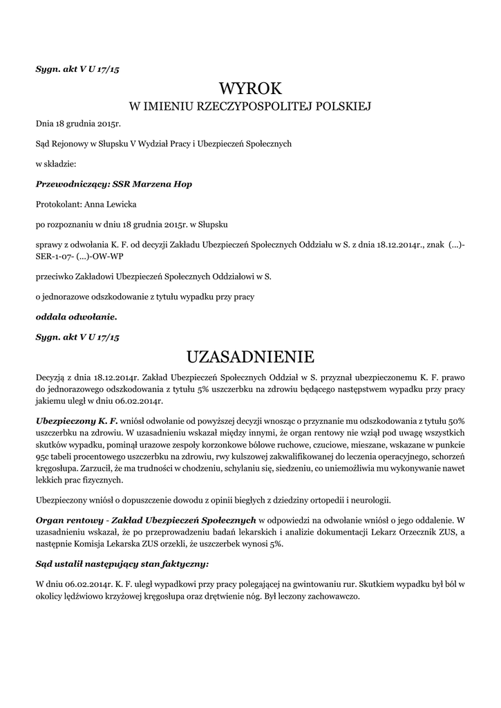 Sygn. akt V U 17/15 WYROK W IMIENIU RZECZYPOSPOLITEJ POLSKIEJ Dnia 18 grudnia 2015r. Sąd Rejonowy w Słupsku V Wydział Pracy i Ubezpieczeń Społecznych w składzie: Przewodniczący: SSR Marzena Hop Protokolant: Anna Lewicka po rozpoznaniu w dniu 18 grudnia 2015r. w Słupsku sprawy z odwołania K. F. od decyzji Zakładu Ubezpieczeń Społecznych Oddziału w S. z dnia 18.12.2014r., znak (...)SER-1-07- (...)-OW-WP przeciwko Zakładowi Ubezpieczeń Społecznych Oddziałowi w S. o jednorazowe odszkodowanie z tytułu wypadku przy pracy oddala odwołanie. Sygn. akt V U 17/15 UZASADNIENIE Decyzją z dnia 18.12.2014r. Zakład Ubezpieczeń Społecznych Oddział w S. przyznał ubezpieczonemu K. F. prawo do jednorazowego odszkodowania z tytułu 5% uszczerbku na zdrowiu będącego następstwem wypadku przy pracy jakiemu uległ w dniu 06.02.2014r. Ubezpieczony K. F. wniósł odwołanie od powyższej decyzji wnosząc o przyznanie mu odszkodowania z tytułu 50% uszczerbku na zdrowiu. W uzasadnieniu wskazał między innymi, że organ rentowy nie wziął pod uwagę wszystkich skutków wypadku, pominął urazowe zespoły korzonkowe bólowe ruchowe, czuciowe, mieszane, wskazane w punkcie 95c tabeli procentowego uszczerbku na zdrowiu, rwy kulszowej zakwalifikowanej do leczenia operacyjnego, schorzeń kręgosłupa. Zarzucił, że ma trudności w chodzeniu, schylaniu się, siedzeniu, co uniemożliwia mu wykonywanie nawet lekkich prac fizycznych. Ubezpieczony wniósł o dopuszczenie dowodu z opinii biegłych z dziedziny ortopedii i neurologii. Organ rentowy - Zakład Ubezpieczeń Społecznych w odpowiedzi na odwołanie wniósł o jego oddalenie. W uzasadnieniu wskazał, że po przeprowadzeniu badań lekarskich i analizie dokumentacji Lekarz Orzecznik ZUS, a następnie Komisja Lekarska ZUS orzekli, że uszczerbek wynosi 5%. Sąd ustalił następujący stan faktyczny: W dniu 06.02.2014r. K. F. uległ wypadkowi przy pracy polegającej na gwintowaniu rur. Skutkiem wypadku był ból w okolicy lędźwiowo krzyżowej kręgosłupa oraz drętwienie nóg. Był leczony zachowawczo. Po przeprowadzeniu badań lekarskich, Komisja Lekarska ZUS stwierdziła, że doznany uraz w postaci przewlekłego zespołu pourazowego bólowego kręgosłupa L/S prawostronny na tle dyskopatii L5/S1 spowodował uszczerbek na zdrowiu K. F. wynoszący 5 % - na podstawie punktu 94c tabeli procentowego uszczerbku na zdrowiu. Decyzją z dnia 18.12.2014r. Zakład Ubezpieczeń Społecznych Oddział w S. przyznał K. F. odszkodowanie za 5% długotrwałego uszczerbku na zdrowiu w związku z wypadkiem przy pracy z dnia 06.02.2014r. Bezsporne U K. F. w wyniku wypadku nie wystąpiły zmiany pourazowe kręgosłupa, co potwierdza badanie (...) z dnia 10.03.2014r. Występuje u niego miernego stopnia przepuklina centralna dysku L% S1. Tego rodzaju przepukliny są powszechne u ludzi w czwartej dekadzie życia i nie ma podstaw do wiązania tego obrazu z wypadkiem przy pracy, któremu uległ. U K. F. dominują objawy podmiotowe pod postacią bólu i drętwień. Podmiotowo nie stwierdzono u niego objawów troficznych ani innych korzeniowych o istotnym znaczeniu. K. F. oczekuje na operację kręgosłupa. Z neurologicznego punktu widzenia nie ma bezpośredniego związku przyczynowo skutkowego między doznanym wypadkiem, a stanem zdrowia K. F.. dowód: dokumentacja lekarska w aktach ZUS oraz w aktach sprawy – k.18, opinia biegłego sądowego specjalisty z dziedziny neurochirurgii i neurotraumatologii dr med. P. Z. – k. 11. W badaniu ortopedycznym stwierdzono, że obwody kończyn są równe, siła symetryczna, prawostronny objaw L. 80*, a siła mięśniowa symetryczna. Z ortopedycznego punktu widzenia uszczerbek na zdrowiu spowodowany wypadkiem przy pracy wynosi 5%. Uszczerbek ten wynika z objawów korzonkowych, bólowych z niewielką komponentą ubytkową i najpełniej opisany jest w punkcie 94 c tabeli procentowego uszczerbku na zdrowiu. dowód: dokumentacja lekarska w aktach ZUS oraz w aktach sprawy – k.18, opinia biegłego sądowego specjalisty ortopedii i traumatologii narządu ruchu lekarza M. K. – k.38-39. Sąd zważył, co następuje: Odwołanie K. F. nie jest zasadne i nie zasługuje na uwzględnienie. Zgodnie z art. 11 ust. 1 ustawy z dnia 30 października 2002r. o ubezpieczeniu społecznym z tytułu wypadków przy pracy i chorób zawodowych (Dz.U. 2009r. Nr 167, poz. 1322) – zwanej dalej „Ustawą wypadkową” – ubezpieczonemu, który wskutek wypadku przy pracy lub choroby zawodowej doznał stałego lub długotrwałego uszczerbku na zdrowiu, przysługuje jednorazowe odszkodowanie. Za długotrwały uszczerbek na zdrowiu uważa się takie naruszenie sprawności organizmu, które powoduje upośledzenie czynności organizmu na okres przekraczający 6 miesięcy, mogące ulec poprawie (ust. 3). Natomiast w myśl art. 12 ust. 1 Ustawy wypadkowej jednorazowe odszkodowanie przysługuje w wysokości 20 % przeciętnego wynagrodzenia za każdy procent stałego lub długotrwałego uszczerbku na zdrowiu. Okoliczność iż zdarzanie z dnia 6 lutego 2014r. było wypadkiem przy pracy była między stronami bezsporna. Nadto okoliczność tę potwierdza dokumentacja powypadkowa złożona w aktach ZUS. W niniejszej sprawie między stronami spornym było w jakiej wysokości uszczerbku na zdrowiu doznał ubezpieczony w wyniku wypadku. Dla rozpoznania niniejszej sprawy niezbędne było posiadanie wiadomości specjalnych, dlatego też Sąd stosownie do schorzeń ubezpieczonego dopuścił dowód z opinii biegłych sądowych z dziedziny neurochirurgii oraz ortopedii i traumatologii narządu ruchu. Biegły ortopeda stwierdził uszczerbek na zdrowiu ubezpieczonego w wysokości 5% w postaci objawów korzonkowych, bólowych z niewielką komponenta ubytkową ( pkt 94c tabeli uszczerbku). Biegły neurochirurg nie stwierdził u ubezpieczonego uszczerbku na zdrowiu z zakresu swojej dziedziny. Do opinii biegłych wniósł zastrzeżenia ubezpieczony. Ubezpieczony zarzucał, 