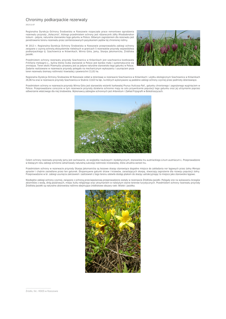 Chronimy podkarpackie rezerwaty 2013-11-07 Regionalna Dyrekcja Ochrony Środowiska w Rzeszowie rozpoczęła prace remontowe ogrodzenia rezerwatu przyrody „Kołacznia", którego przedmiotem ochrony jest różanecznik żółty Rhododendron luteum - jedyne, naturalne stanowisko tego gatunku w Polsce. Głównym zagrożeniem dla rezerwatu jest penetrowanie terenu rezerwatu przez zainteresowanych pozyskaniem pędów tej chronionej rośliny. W 2013 r. Regionalna Dyrekcja Ochrony Środowiska w Rzeszowie przeprowadziła zabiegi ochrony związane z czynną ochroną ekosystemów nieleśnych w granicach 5 rezerwatów przyrody województwa podkarpackiego tj: Szachownica w Krównikach, Winna Góra, Jamy, Skarpa Jaksmanicka, Źródliska Jasiołki. Przedmiotem ochrony rezerwatu przyrody Szachownica w Krównikach jest szachownica kostkowata Fritillaria meleagris L., bylina której liczba stanowisk w Polsce jest bardzo mała i systematycznie się zmniejsza. Teren okolic Przemyśla uznawany jest za jedyne naturalne stanowisko tego gatunku w Polsce. Zadanie realizowane w rezerwacie przyrody polegało na mechanicznym wykoszeniu i usunięciem poza teren rezerwatu biomasy roślinności trawiastej z powierzchni 11,01 ha. Regionalna Dyrekcja Ochrony Środowiska W Rzeszowie oddał w dzierżawę w rezerwacie Szachownica w Krównikach i użytku ekologicznym Szachownica w Krównikach 26,06 ha oraz w rezerwacie przyrody Szachownica w Stubnie 13,63 ha łąk, na których wykonywane są podobne zabiegi ochrony czynnej przez podmioty dzierżawiące. Przedmiotem ochrony w rezerwacie przyrody Winna Góra jest stanowisko wisienki karłowatej Prunus fruticosa Pall., gatunku chronionego i zagrożonego wyginięciem w Polsce. Przeprowadzane corocznie w tym rezerwacie przyrody działania ochronne mają na celu przywrócenie populacji tego gatunku oraz jej utrzymanie poprzez odtworzenie właściwego dla niej środowiska. Wykonawcą zabiegów ochronnych jest Arboretum i Zakład Fizjografii w Bolestraszycach. Celem ochrony rezerwatu przyrody Jamy jest zachowanie, ze względów naukowych i dydaktycznych, stanowiska lnu austriackiego Linum austriacum L. Przeprowadzone w bieżącym roku zabiegi ochronne zahamowały naturalną sukcesję roślinności krzewiastej, która utrudnia wzrost lnu. Przedmiotem ochrony w rezerwacie przyrody Skarpa Jaksmanicka są lessowe skarpy stanowiące dogodne miejsce do zakładania nor lęgowych przez żołny Merops apiaster i chętnie zasiedlane przez ten gatunek. Ekspansywne gatunki drzew i krzewów, zarastających skarpę, stwarzają zagrożenie dla rozwoju populacji żołny. Przeprowadzone w br. zabiegi usunięcia zakrzewień i zadrzewień z tego terenu ułatwiło dostęp ptakom do skarpy uatrakcyjniając to miejsce jako stanowisko lęgowe. Niezbędne zabiegi ochrony czynnej, związane z ochroną przeciwpożarową przeprowadzone zostały w rezerwacie Źródliska Jasiołki. Polegały one na wykaszaniu brzegów zbiorników z wodą, dróg pożarowych, miejsc kultu religijnego oraz utrzymaniem w należytym stanie terenów turystycznych. Przedmiotem ochrony rezerwatu przyrody Źródliska Jasiołki są naturalne zbiorowiska roślinne obejmujące źródliskowe obszary rzek: Wisłok i Jasiołka. ---------------------------------Źródło, fot.: RDOŚ w Rzeszowie