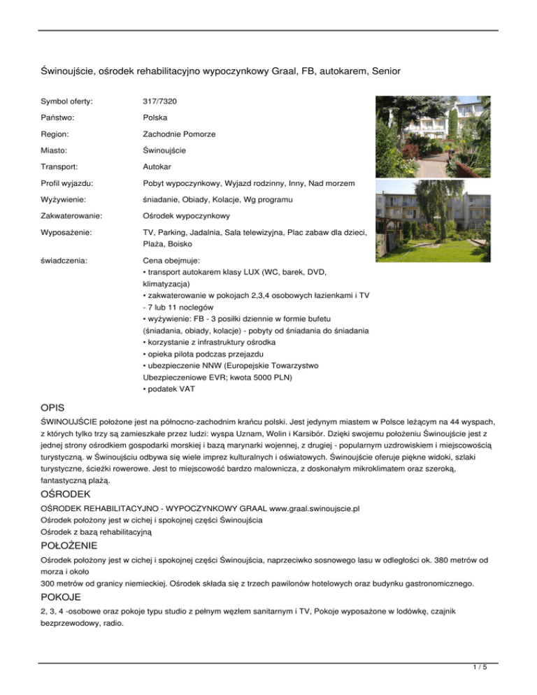 Świnoujście, ośrodek rehabilitacyjno wypoczynkowy Graal, FB, autokarem, Senior Symbol oferty: 317/7320 Państwo: Polska Region: Zachodnie Pomorze Miasto: Świnoujście Transport: Autokar Profil wyjazdu: Pobyt wypoczynkowy, Wyjazd rodzinny, Inny, Nad morzem Wyżywienie: śniadanie, Obiady, Kolacje, Wg programu Zakwaterowanie: Ośrodek wypoczynkowy Wyposażenie: TV, Parking, Jadalnia, Sala telewizyjna, Plac zabaw dla dzieci, świadczenia: Cena obejmuje: Plaża, Boisko • transport autokarem klasy LUX (WC, barek, DVD, klimatyzacja) • zakwaterowanie w pokojach 2,3,4 osobowych łazienkami i TV - 7 lub 11 noclegów • wyżywienie: FB - 3 posiłki dziennie w formie bufetu (śniadania, obiady, kolacje) - pobyty od śniadania do śniadania • korzystanie z infrastruktury ośrodka • opieka pilota podczas przejazdu • ubezpieczenie NNW (Europejskie Towarzystwo Ubezpieczeniowe EVR; kwota 5000 PLN) • podatek VAT OPIS ŚWINOUJŚCIE położone jest na północno-zachodnim krańcu polski. Jest jedynym miastem w Polsce leżącym na 44 wyspach, z których tylko trzy są zamieszkałe przez ludzi: wyspa Uznam, Wolin i Karsibór. Dzięki swojemu położeniu Świnoujście jest z jednej strony ośrodkiem gospodarki morskiej i bazą marynarki wojennej, z drugiej - popularnym uzdrowiskiem i miejscowością turystyczną. w Świnoujściu odbywa się wiele imprez kulturalnych i oświatowych. Świnoujście oferuje piękne widoki, szlaki turystyczne, ścieżki rowerowe. Jest to miejscowość bardzo malownicza, z doskonałym mikroklimatem oraz szeroką, fantastyczną plażą. OŚRODEK OŚRODEK REHABILITACYJNO - WYPOCZYNKOWY GRAAL www.graal.swinoujscie.pl Ośrodek położony jest w cichej i spokojnej części Świnoujścia Ośrodek z bazą rehabilitacyjną POŁOŻENIE Ośrodek położony jest w cichej i spokojnej części Świnoujścia, naprzeciwko sosnowego lasu w odległości ok. 380 metrów od morza i około 300 metrów od granicy niemieckiej. Ośrodek składa się z trzech pawilonów hotelowych oraz budynku gastronomicznego. POKOJE 2, 3, 4 -osobowe oraz pokoje typu studio z pełnym węzłem sanitarnym i TV, Pokoje wyposażone w lodówkę, czajnik bezprzewodowy, radio. 1/5 Pokoje 2 osobowe posiadają balkon zaś pokoje 3 osobowe są na parterze posiadają tras. WYŻYWIENIE smaczne i urozmaicone, 3 posiłki dziennie (śniadanie, obiad i kolacja) w formie bogatego bufetu. Posiłki podawane są w 2 godzinnym przedziale czasowym. DO DYSPOZYCJI GOŚCI jadalnia, plac zabaw dla dzieci z piaskownicą oraz huśtawkami, boisko do siatkówki, altana z grillem, miejsce na ognisko, dozorowany płatny parking, bezpłatny Internet poprzez wi-fi DODATKOWO PŁATNE zabiegi rehabilitacyjne, opłata uzdrowiskowa 4 PLN/os za dobę, opłata za parking (w przypadku dojazdu własnego -pakiet 7 dni to kwota:70.00 PLN) UWAGI możliwe jest łączenie turnusów. Doba hotelowa od godz. 16.00, kończy się o godz. 11.00 w dniu wyjazdu. Turnus zaczyna się śniadaniem w dniu przyjazdu, pokoje od ok. godz. 16.00. Turnus kończy się śniadaniem w dniu wyjazdu, wykwaterowanie po śniadaniu. Dodatkowo płatne w ośrodku: opłata klimatyczna. W ośrodku nie przyjmujemy zwierząt domowych. Pobyty turnusów od śniadania w dniu przyjazdu do ośrodka do śniadania w dniu wyjazdu DOPŁATY/ZNIŻKI Dopłata do pokoju 1-os. 350,- PLN Dojazd własny zniżka 100,- PLN/os. Zniżki dla dzieci przy dwóch osobach dorosłych: - dziecko do 3 lat (bez świadczeń, wspólne spanie z rodzicem) cena 300,- PLN - dziecko od 3 do 6 lat cena 980,- PLN - dziecko od 6 do 12 lat cena1180,-PLN - dziecko od 12 do 16 lat cena1290,-PLN INFORMACJE DLA PODRÓŻUJĄCYCH AUTOKAREM 1. Prosimy Klientów o zapoznanie sie z ramowym programem imprezy. 2. Miejsca w autokarze docelowym (głównym) są numerowane i przydzielane przez pilota. 3. Dopłata za miejsca dojazdowe (antenki) zawiera opłatę za przejazd w dwie strony. 4. Zbiórka na 15 min. przed planowaną godzina odjazdu. Dojazdy antenowe są ze sobą skomunikowane, co może powodować dłuższe oczekiwanie w miejscach przesiadkowych. 5. Organizator nie ponosi odpowiedzialności za opóźnienia w wyjazdach, powrotach powstałe z przyczyn: warunków na drodze (wypadek, nieprzewidziane korki, roboty drogowe, trudnych warunków atmosferycznych, przy powrotach wydłużonych odpraw granicznych. 6. Godziny powrotów są orientacyjne. Godziny wyjazdów mogą ulec zmianie - klient otrzymuje odrębny komunikat z aktualną godziną wyjazdu nie później niż 48 godzin przed wyjazdem. 7. Główne miejsca wyjazdu autokaru docelowego to Katowice. W miarę możliwości staramy się uwzględniać prośby dot. miejsc - wpisane w umowie - zgłoszeniu. Organizator zastrzega sobie realizację dojazdów antenowych do głównego miejsca wyjazdu - minibusem, samochodem osobowym, regularnymi połączeniami - liniami autobusowymi, pociągiem bez opieki pilota. Istnieje możliwość ustalenia innego miejsca wyjazdu - po uzgodnieniu z Organizatorem. 8. Postoje w trakcie podróży są organizowane co ok. 3,5,-4,5 godz - zgodnie z czasem pracy kierowców a także w miejscach odpowiednich. 9. Organizator zastrzega sobie prawo odwołania dojazdów antenowych z poszczególnych miast najpóźniej na 48 godz przed rozpoczęciem imprezy (wymagana ilość osób - min 5 na każdej trasie). 2/5 10. Uczestnik zobowiązany jest do posiadania aktualnego dokumentu tożsamości. 11. Uczestnikowi przysługuje w ramach wykupionego 1 miejsca - 1 bagaż podręczny - o max wadze 5 kg 1 bagaż główny o max wadze 20 kg. TERMINY: od: 2017-07-07 do: 2017-07-15 (9 dni), miejsca: sprawdź miejsca cena od: 1450 PLN1380 PLN od: 2017-07-14 do: 2017-07-22 (9 dni), miejsca: sprawdź miejsca cena od: 1450 PLN1380 PLN od: 2017-07-21 do: 2017-07-29 (9 dni), miejsca: sprawdź miejsca cena od: 1450 PLN1380 PLN od: 2017-08-23 do: 2017-09-03 (12 dni), miejsca: sprawdź miejsca cena od: 1490 PLN CENNIK: Długość pobytu: 9 dni 9 dni 9 dni 12 dni Grupa cenowa: A3 A1 A2 A4 -100 -1