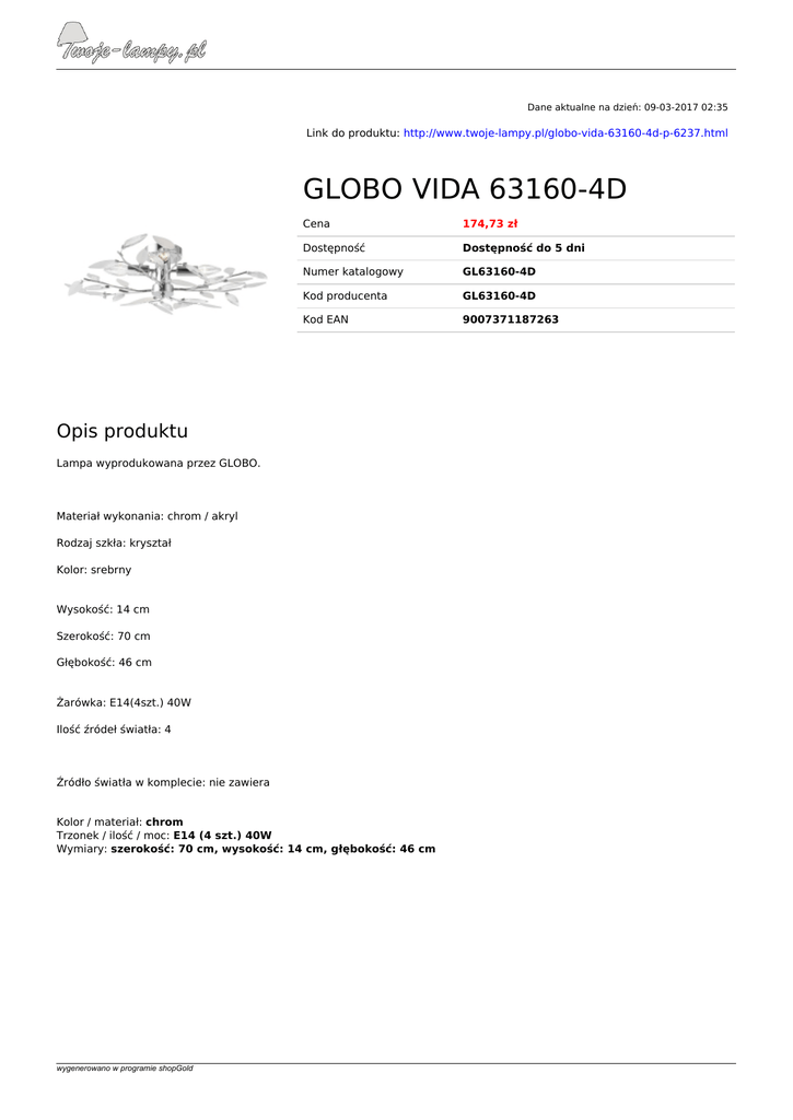 Dane aktualne na dzień: 09-03-2017 02:35 Link do produktu: http://www.twoje-lampy.pl/globo-vida-63160-4d-p-6237.html GLOBO VIDA 63160-4D Cena 174,73 zł Dostępność Dostępność do 5 dni Numer katalogowy GL63160-4D Kod producenta GL63160-4D Kod EAN 9007371187263 Opis produktu Lampa wyprodukowana przez GLOBO. Materiał wykonania: chrom / akryl Rodzaj szkła: kryształ Kolor: srebrny Wysokość: 14 cm Szerokość: 70 cm Głębokość: 46 cm Żarówka: E14(4szt.) 40W Ilość źródeł światła: 4 Źródło światła w komplecie: nie zawiera Kolor / materiał: chrom Trzonek / ilość / moc: E14 (4 szt.) 40W Wymiary: szerokość: 70 cm, wysokość: 14 cm, głębokość: 46 cm wygenerowano w programie shopGold Powered by TCPDF (www.tcpdf.org)