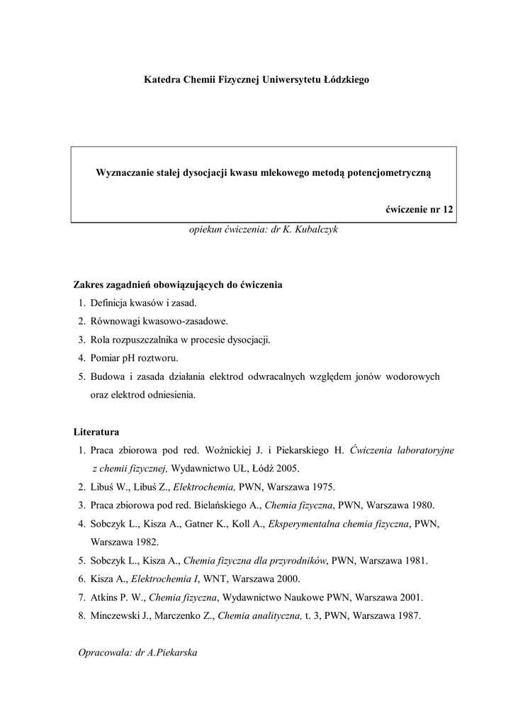 Katedra Chemii Fizycznej Uniwersytetu Łódzkiego Wyznaczanie