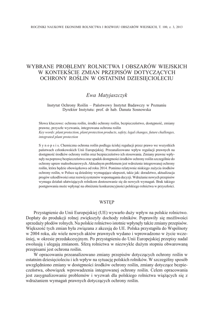 82 Ewa Matyjaszczyk ROCZNIKI naukowe ekonomii ROLNICtwa i rozwoju obszarów wiejskich, T. 100, z. 3, 2013 Wybrane problemy rolnictwa i obszarów wiejskich w kontekście zmian przepisów dotyczących ochrony roślin w ostatnim dziesięcioleciu Ewa Matyjaszczyk Instytut Ochrony Roślin – Państwowy Instytut Badawczy w Poznaniu Dyrektor Instytutu: prof. dr hab. Danuta Sosnowska Słowa kluczowe: ochrona roślin, środki ochrony roślin, bezpieczeństwo, dostępność, zmiany prawne, przyszłe wyzwania, integrowana ochrona roślin Key words: plant protection, plant protection products, safety, legal changes, future challenges, integrated plant protection S y n o p s i s. Chemiczna ochrona roślin podlega ścisłej regulacji przez prawo we wszystkich państwach członkowskich Unii Europejskiej. Przeanalizowano wpływ regulacji prawnych na dostępność środków ochrony roślin oraz bezpieczeństwo ich stosowania. Zmiany prawne wpłynęły na poprawę bezpieczeństwa oraz spadek dostępności środków ochrony roślin szczególnie do ochrony upraw małoobszarowych. Aktualnym problemem jest wdrożenie integrowanej ochrony roślin, która będzie obowiązkowa od roku 2014. Pomimo relatywnie niskiego zużycia środków ochrony roślin, w Polsce są dziedziny wymagające ulepszeń, takie jak: doradztwo, aktualizacja progów szkodliwości oraz rozwój systemów wspomagania decyzji. Wdrażanie nowych przepisów wymaga działań ułatwiających rolnikom dostosowanie się do nowych wymagań. Brak takiego postępowania może wpłynąć na obniżenie konkurencyjności polskiego rolnictwa w przyszłości. Wstęp Przystąpienie do Unii Europejskiej (UE) wywarło duży wpływ na polskie rolnictwo. Dopłaty do produkcji rolnej zwiększyły dochody rolników. Poprawiły się możliwości sprzedaży płodów rolnych. Na polskie rolnictwo istotnie wpłynęły także zmiany przepisów. Większość tych zmian była związana z akcesją do UE. Polska przystąpiła do Wspólnoty w 2004 roku, ale wiele nowych aktów prawnych wydano i wprowadzono w życie wcześniej, w okresie przedakcesyjnym. Po przystąpieniu do Unii Europejskiej przepisy nadal ewoluują i ulegają zmianom. Sferą rolnictwa w niezwykle dużym stopniu obwarowaną przepisami jest ochrona roślin. W opracowaniu przeanalizowano zmiany przepisów dotyczących ochrony roślin w ostatnim dziesięcioleciu i ich wpływ na sytuację polskich rolników. W szczególny sposób uwzględniono zmiany w dostępności środków ochrony roślin, zmiany dotyczące bezpieczeństwa, obowiązek wprowadzenia integrowanej ochrony roślin. Celem opracowania jest zasygnalizowanie problemów i wyzwań dla polskiego rolnictwa wiążących się z wdrażaniem wymagań prawnych dotyczących ochrony roślin. Wybrane problemy rolnictwa i obszarów wiejskich w kontekście zmian przepisów... 83 Metodyka Badania dotyczą ostatnich dziesięciu lat, czyli okresu od grudnia 2003 roku (uchwalenie ustawy o ochronie roślin dostosowującej polskie prawo do wymogów Unii Europejskiej przed akcesją) do roku 2013. Uwzględniono wymagania aktów prawnych dotyczące chemicznej ochrony roślin oraz dostępną literaturę przedmiotu. Ponadto, przeanalizowano dane na temat dostępności środków ochrony roślin pochodzące z Ministerstwa Rolnictwa i Rozwoju Wsi, Głównego Urzędu Statystycznego oraz Komisji Europejskiej. Przy opracowywaniu zmian dotyczących bezpieczeństwa wykorzystano dane Państwowego Zakładu Higieny – Narodowego Instytutu Zdrowia Publicznego (PZH) i Kasy Rolniczego Ubezpieczenia Społecznego (KRUS) dotyczące zatruć środkami ochrony roślin w Polsce oraz wewnętrzne sprawozdania o działalności Inspekcji Ochrony Roślin i Nasiennictwa. Informacje dotyczące problematyki wprowadzenia integrowanej ochrony roślin są prognozą, podaną na podstawie obowiązujących aktów prawnych, stanu aktualnego oraz zjawisk obserwowanych w polskiej gospodarce. Prawodawstwo dotyczące ochrony roślin w Polsce Jako pierwszy akt prawny dotyczący ochrony roślin o charakterze organizacyjnym wydany w niepodległej Polsce można traktować Rozporządzenie Prezydenta z 19 listopada Okres Liczba aktów 1927 roku o zwalczaniu chorób roślin oraz prawnych o tępieniu chwastów i szkodników roślin. W dotyczących okresie międzywojennym wydano łącznie 21 ochrony roślin aktów prawnych dotyczących ochrony roślin Dwudziestolecie 21 [Matyjaszczyk 2011]. W późniejszych latach, międzywojenne wraz ze wprowadzaniem ochrony chemicznej i 1945-1960 32 wzrostem intensywności produkcji rolnej liczba 1961-1995 84 przepisów dotyczących ochrony roślin stopnio1996 do 30.04.2004 97 wo zwiększała się. W okresie przedakcesyjnym 01.05.2004 do 2010 187 oraz po akcesji liczba aktów prawnych była Źródło: opracowanie własne na podstawie wyjątkowo duża, ponieważ istniała konieczność [Matyjaszczyk 2011, s. 100-130]. dostosowania prawodawstwa krajowego do zasad obowiązujących w UE (tab. 1.). Od przystąpienia Polski do Unii Europejskiej krajowe przepisy dotyczące ochrony roślin determinowane są głównie prawodawstwem unijnym. Niektóre obowiązujące w naszym kraju akty prawne (m.in. rozporządzenie 1107/2009 dotyczące wprowadzania do obrotu środków ochrony roślin) to wyłącznie przepisy unijne, uchwalane przez Parlament Europejski i obowiązujące w państwach członkowskich na mocy tekstu uchwalonego, bez konieczności implementacji do prawodawstwa krajowego. Szczególnie silnie regulowana jest sfera rejestracji środków ochrony roślin. Dzieje się tak ze względu na przesłanki merytoryczne: większość tych środków to substancje chemiczne przeznaczone do niszczenia organizmów żywych, wprowadzane celowo do środowiska, a także z uwagi na duże zainteresowanie opinii publicznej. Zatem przepisy, a także odpowiednie procedury rejestracyjne wpływają na paletę środków dostępnych Tabela 1. Liczba wydanych w Polsce aktów prawnych dotyczących ochrony roślin 84 E