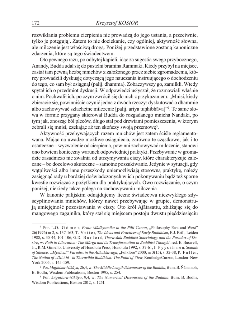 172 Krzysztof KOSIOR rozwikłania problemu cierpienia nie prowadzą do jego ustania, a przeciwnie, tylko je potęgują1. Zatem to nie dociekanie, czy ogólniej, aktywność słowna, ale milczenie jest właściwą drogą. Poniżej przedstawione zostaną kanoniczne zdarzenia, które są tego świadectwem. Oto pewnego razu, po odbytej kąpieli, idąc za sugestią swego przybocznego, Anandy, Budda udał się do pustelni bramina Rammaki. Kiedy przybył na miejsce, zastał tam pewną liczbę mnichów z założonego przez siebie zgromadzenia, którzy prowadzili dyskusję dotyczącą jego nauczania instruującego o dochodzeniu do tego, co sam był osiągnął (palij. dhamma). Zobaczywszy go, zamilkli. Wtedy spytał ich o przedmiot dyskusji. W odpowiedzi usłyszał, że rozmawiali właśnie o nim. Pochwalił ich, po czym zwrócił się do nich z przykazaniem: „Mnisi, kiedy zbieracie się, powinniście czynić jedną z dwóch rzeczy: dyskutować o dhammie albo zachowywać szlachetne milczenie [palij. ariya tun.hibhāva]”2. Te same słowa w formie przygany skierował Budda do rozgadanego mnicha Nandaki, po tym jak, znosząc ból pleców, długo stał pod drzwiami pomieszczenia, w którym zebrali się mnisi, czekając aż ten skończy swoją przemowę3. Aktywność przebywających razem mnichów jest zatem ściśle reglamentowana. Mając na uwadze możliwe osiągnięcia, zarówno te cząstkowe, jak i to ostateczne – wyzwolenie od cierpienia, powinni zachowywać milczenie, stanowi ono bowiem konieczny warunek odpowiedniej praktyki. Przebywanie w gromadzie zasadniczo nie zwalnia od utrzymywania ciszy, które charakteryzuje zalecane – bo docelowo skuteczne – samotne poszukiwanie. Jedynie w sytuacji, gdy wątpliwości albo inne przeszkody uniemożliwiają stosowną praktykę, należy zasięgnąć rady u bardziej doświadczonych w ich pokonywaniu bądź też sporne kwestie rozwiązać z pożytkiem dla praktykujących. Owo rozwiązanie, o czym poniżej, niekiedy także polega na zachowywaniu milczenia. W kanonie palijskim odnajdujemy liczne świadectwa niezwykłego zdyscyplinowania mnichów, którzy nawet przebywając w grupie, demonstrują umiejętność pozostawania w ciszy. Oto król Ajātasattu, zbliżając się do mangowego zagajnika, który stał się miejscem postoju dwustu pięćdziesięciu 1 Por. L.O. G ó m e z, Proto-Mādhyamika in the Pāli Canon, „Philosophy East and West” 26(1976) nr 2, s. 137-163; T. V e t t e r, The Ideas and Practices of Early Buddhism, E.J. Brill, Leiden 1988, s. 35-44, 101-106; G.D. B u r f o r d, Theravāda Buddhist Soteriology and the Paradox of Desire, w: Path to Liberation: The Mārga and its Transformation in Buddhist Thought, red. E. Buswell, Jr., R.M. Gimello, University of Honolulu Press, Honolulu 1992, s. 37-61; I. P y y s i ä i n e n, Sounds of Silence: „Mystical” Paradox in the Atthakkavaga, „Folklore” 2000, nr 3(15), s. 32-38; P. F u l l e r, The Notion of „Dit.t.hi” in Theravāda Buddhism: The Point of View, RoutledgeCurzon, London–New York 2005, s. 145-159. 2 Por. Majjhima-Nikāya, 26,4, w: The Middle Length Discourses of the Buddha, tłum. B. Ñānamoli, B. Bodhi, Wisdom Publications, Boston 1995, s. 254. . 3 Por. Anguttara-Nikāya, 9,4, w: The Numerical Discourses of the Buddha, tłum. B. Bodhi, Wisdom Publications, Boston 2012, s. 1251. „Szlachetne milczenie” we wczesnym buddyzmie 173 uczniów Buddy, niepokoi się, a nawet podejrzewa jakiś podstęp, gdyż nie dobiegają go żadne odgłosy kichania, kaszlu, czy pokrzykiwania. Kiedy dociera do siedzącego naprzeciw gromady mnichów nauczyciela, wciąż nie może wyjść z podziwu, gdyż mnisi pozostają nieporuszeni i zdają się nie reagować na jego obecność. Wówczas, przywołując w myśli swego nieznośnego syna, głośno wzdycha: „Gdyby tylko książę Udāyabhadda mógł być tak opanowany, jak ta wspólnota mnichów!”4. Także wędrowiec Kandaraka, zbudowany tym, że uczniowie Buddy siedzą w kompletnej ciszy, z zachwytem zwraca się do niego: „Mistrzu Gotamo, to wspaniałe, to cudowne, jak ta wspólnota mnichów została poprowadzona właściwą drogą przez mistrza Gotamę”5. Upodobanie mnichów do zachowywania milczenia zostaje potwierdzone nie wprost, kiedy to wędrowiec Sandaka, przebywający w gronie hałasujących, rozgadanych i kłótliwych kompanów, dostrzegłszy zbliżającego się Anandę i przypomniawszy sobie, iż należy on do grona uczniów Buddy, apeluje do nich: „Czcigodni cenią ciszę, są zdyscyplinowani w jej zachowywaniu, zalecają ciszę. Jeśli on zobaczy, że jesteśmy spokojni, być może do nas dołączy”6. Przykazane przez Buddę i spełniane przez jego uczniów kultywowanie ciszy wzbudza u niektórych stykających się z nimi podejrzenie, iż w zachowywaniu tej postawy chodzi o oszukańczy wybieg, ukrywający faktyczną niewiedzę w odniesieniu do rzeczy ostatecznych, ale zarazem stwarzający swoistą ochronę przed niechybną kompromitacją. Dodatkową okolicznością wzmacniającą nieufność wobec mnichów jest to, że oddając się ćwiczeniu, stronią oni od towarzystwa innych, w szczególności zaś od towarzystwa ludzi spoza wspólnoty. Świeckim uczniom Buddy takie właśnie zachowanie wydaje się czymś należytym i potwierdzającym właściwość obranej drogi. Jeden z nich, gospodarz Sandhāna, oczekując na wizytę swego nauczyciela, w rozmowie z przybyłym w większym gronie wędrowcem Nigrodhą wychwala wspólnotę jako szanującą ciszę, nauczoną pozostawania ciszy i sławiącą ciszę, przeciwstawiając ją ascetom innych orientacji, którzy – w jego ocenie – gromadzą się w celu rozpętania wrzawy i pobłażania sobie w mało budującej rozmowie. Charakteryzując sposób postępowania Buddy, oznajmia, że szuka on miejsca zamieszkania w lesie, wolnego od hałasu, z dala od tłumu, nieniepokojonego przez ludzi, dobrze przygotowanego, by zapewnić mu odosobnienie. Wówczas nieprzychylny Buddzie Nig