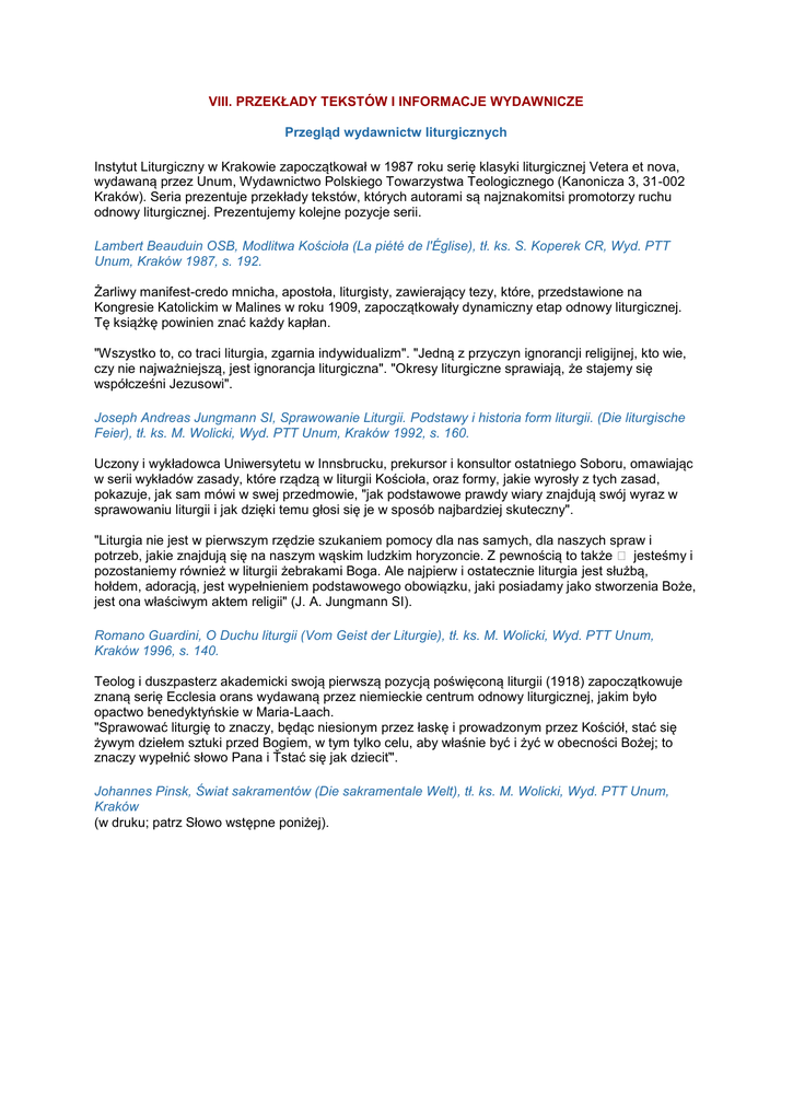 VIII. PRZEKŁADY TEKSTÓW I INFORMACJE WYDAWNICZE Przegląd wydawnictw liturgicznych Instytut Liturgiczny w Krakowie zapoczątkował w 1987 roku serię klasyki liturgicznej Vetera et nova, wydawaną przez Unum, Wydawnictwo Polskiego Towarzystwa Teologicznego (Kanonicza 3, 31-002 Kraków). Seria prezentuje przekłady tekstów, których autorami są najznakomitsi promotorzy ruchu odnowy liturgicznej. Prezentujemy kolejne pozycje serii. Lambert Beauduin OSB, Modlitwa Kościoła (La piété de l'Église), tł. ks. S. Koperek CR, Wyd. PTT Unum, Kraków 1987, s. 192. Żarliwy manifest-credo mnicha, apostoła, liturgisty, zawierający tezy, które, przedstawione na Kongresie Katolickim w Malines w roku 1909, zapoczątkowały dynamiczny etap odnowy liturgicznej. Tę książkę powinien znać każdy kapłan. "Wszystko to, co traci liturgia, zgarnia indywidualizm". "Jedną z przyczyn ignorancji religijnej, kto wie, czy nie najważniejszą, jest ignorancja liturgiczna". "Okresy liturgiczne sprawiają, że stajemy się współcześni Jezusowi". Joseph Andreas Jungmann SI, Sprawowanie Liturgii. Podstawy i historia form liturgii. (Die liturgische Feier), tł. ks. M. Wolicki, Wyd. PTT Unum, Kraków 1992, s. 160. Uczony i wykładowca Uniwersytetu w Innsbrucku, prekursor i konsultor ostatniego Soboru, omawiając w serii wykładów zasady, które rządzą w liturgii Kościoła, oraz formy, jakie wyrosły z tych zasad, pokazuje, jak sam mówi w swej przedmowie, "jak podstawowe prawdy wiary znajdują swój wyraz w sprawowaniu liturgii i jak dzięki temu głosi się je w sposób najbardziej skuteczny". "Liturgia nie jest w pierwszym rzędzie szukaniem pomocy dla nas samych, dla naszych spraw i potrzeb, jakie znajdują się na naszym wąskim ludzkim horyzoncie. Z pewnością to także jesteśmy i pozostaniemy również w liturgii żebrakami Boga. Ale najpierw i ostatecznie liturgia jest służbą, hołdem, adoracją, jest wypełnieniem podstawowego obowiązku, jaki posiadamy jako stworzenia Boże, jest ona właściwym aktem religii" (J. A. Jungmann SI). Romano Guardini, O Duchu liturgii (Vom Geist der Liturgie), tł. ks. M. Wolicki, Wyd. PTT Unum, Kraków 1996, s. 140. Teolog i duszpasterz akademicki swoją pierwszą pozycją poświęconą liturgii (1918) zapoczątkowuje znaną serię Ecclesia orans wydawaną przez niemieckie centrum odnowy liturgicznej, jakim było opactwo benedyktyńskie w Maria-Laach. "Sprawować liturgię to znaczy, będąc niesionym przez łaskę i prowadzonym przez Kościół, stać się żywym dziełem sztuki przed Bogiem, w tym tylko celu, aby właśnie być i żyć w obecności Bożej; to znaczy wypełnić słowo Pana i Ťstać się jak dzieciť". Johannes Pinsk, Świat sakramentów (Die sakramentale Welt), tł. ks. M. Wolicki, Wyd. PTT Unum, Kraków (w druku; patrz Słowo wstępne poniżej).