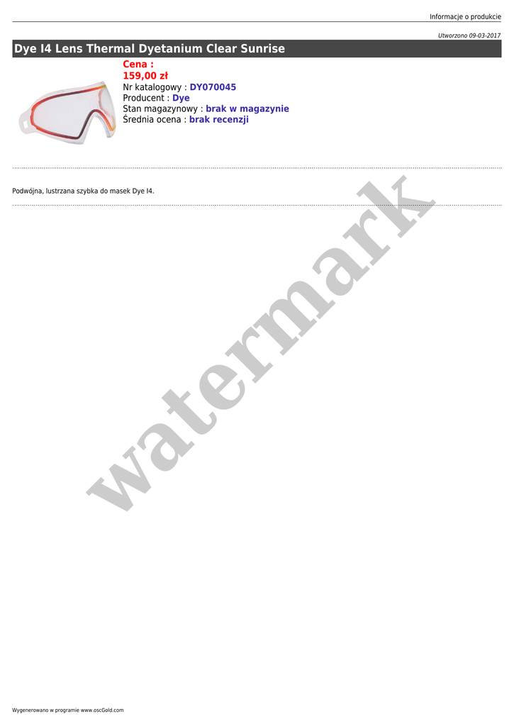 Informacje o produkcie Utworzono 09-03-2017 Dye I4 Lens Thermal Dyetanium Clear Sunrise Cena : 159,00 zł Nr katalogowy : DY070045 Producent : Dye Stan magazynowy : brak w magazynie Średnia ocena : brak recenzji w at er m ar k Podwójna, lustrzana szybka do masek Dye I4. Wygenerowano w programie www.oscGold.com