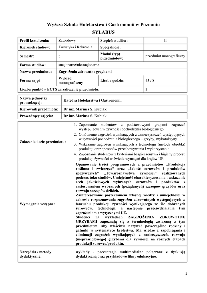 Wyższa Szkoła Hotelarstwa i Gastronomii w Poznaniu SYLABUS Profil kształcenia: Zawodowy Stopień studiów: Kierunek studiów: Turystyka i Rekreacja Specjalność: Semestr: 3 Moduł (typ) przedmiotów: Forma studiów: stacjonarne/niestacjonarne Nazwa przedmiotu: Zagrożenia zdrowotne grzybami Forma zajęć Wykład monograficzny Liczba godzin: Liczba punktów ECTS za zaliczenie przedmiotu: Nazwa jednostki prowadzącej: Katedra Hotelarstwa i Gastronomii Kierownik przedmiotu: Dr inż. Mariusz S. Kubiak Prowadzący zajęcia: Dr inż. Mariusz S. Kubiak Założenia i cele przedmiotu: Wymagania wstępne: Narzędzia / metody dydaktyczne: II przedmiot monograficzny 45 / 8 3 1. Zapoznanie studentów z podstawowymi grupami zagrożeń występujących w żywności pochodzenia biologicznego. 2. Omówienie zagrożeń wynikających z zanieczyszczeń występujących w żywności pochodzenia biologicznego – grzyby, mykotoksyny. 3. Wskazanie zagrożeń wynikających z technologii (metody obróbki) produkcji oraz sposobów przechowywania i wykorzystania. 4. Zapoznanie studentów z kryteriami bezpieczeństwa i higieny procesu produkcji żywności w świetle wymagań dla krajów UE. Opanowanie treści programowych z przedmiotów „Produkcja roślinna i zwierzęca” oraz „Jakość surowców i produktów spożywczych” „Towaroznawstwa żywności” realizowanych podczas toku studiów. Umiejętność charakteryzowania i wskazanie cech jakościowych wybranych surowców i produktów z zastosowaniem wybranych (pożądanych) szczepów grzybów oraz rozwoju szczepów dzikich. Zainteresowanie poszerzaniem własnej wiedzy i umiejętności w zakresie rozpoznawania zagrożeń zdrowotnych występujących w łańcuchu produkcji żywności wynikającego ze źle dobranych surowców, technologii, a następnie przeciwdziałania tym zagrożeniom z wytycznymi UE. Studenci na wykładach ZAGROŻENIA ZDROWOTNE GRZYBAMI zapoznają się z terminologią związaną z tym przedmiotem, aby właściwie nazywać poszczególne rodziny i gatunki w systematyce królestwa. Ma wiedzę z zapobiegania i eliminacji zagrożeń wynikających z zanieczyszczeń, rozwoju (nieprawidłowego) grzybami dla żywności na różnych etapach produkcji surowca/produktu. wykłady - prezentacje multimedialne połączone z dyskusją dydaktyczną oraz przykładowe filmy edukacyjne. 1 WYKAZ TEMATÓW I ZAGADNIEŃ – HARMONOGRAM ZAJĘĆ Liczba godzin Lp. Tematy i zagadnienia Razem 1 2 PODSTAWOWE GRUPY ZAGROŻEŃ WYSTĘPUJĄCE W ŻYWNOŚCI. Podział surowców i produktów narażonych na zanieczyszczenia z rodziny grzybów. Charakterystyka występowania, definicje i poziomy zanieczyszczeń dla wybranych grup żywności. Temat 2 SYSTEMATYKA GRZYBÓW I ICH WŁAŚCIWOŚCI. Systematyka organizmów grzybopodobnych i grzybów, charakterystyka królestwa. Charakterystyka podstawowych gatunków grzybów jadalnych w żywności i zagrożenia zdrowotne – grzyby trujące. Temat 3 ZANIECZYSZCZENIA GRZYBAMI W ŻYWNOŚCI POCHODZENIA ROŚLINNEGO I ZWIERZĘCEGO. Charakterystyka źródeł zagrożeń. Rodzaje i klasyfikacja grzybów o działaniu toksycznym. Temat 1 2 3 4 5 6 7 1 Formy ograniczania zanieczyszczeń mykotoksynami. Temat 4 METODY UTRWALANIA I PRZECHOWYWANIA GRZYBÓW. Charakterystyka metod utrwalania i możliwość wprowadzania zagrożeń oraz ich eliminowanie w zakresie regulacji parametrów. Klasyfikacja metod utrwalania. Zasady prawidłowej praktyki produkcyjnej oraz HACCP w eliminowaniu zagrożeń w żywności pochodzenia biologicznego – grzyby, pleśnie. Temat 5 KONTROLA I MONITORING ŻYWNOŚCI. Urzędowe jednostki monitorujące i kontrolujące żywność w świetle przepisów UE. Normy i przepisy regulujące jakość surowców i produktów żywnościowych. Wymagania w zakresie bezpieczeństwa i higieny produkcji, dystrybucji i przechowywania żywności. Temat 6 ŻYWNOŚĆ - ZANIECZYSZCZENIA GRZYBAMI I MATABOLITAMI GRZYBÓW A ZDROWIE CZŁOWIEKA. Metabolity grzybów i ich właściwości. Towaroznawcza jakość produktów żywnościowych. Toksyczne oddziaływanie na organizm człowieka. Zatrucia pokarmowe, stany chorobowe. Temat 7 ROZPORZĄDZENIA, KONCEPCJE, INNOWACJE I ROZWIĄZANIA TECHNOLOGICZNE W ELIMINOWANIU ZAGROŻEŃ. Przepisy prawne a innowacyjność produkcji. Technologie z wykorzystaniem szlachetnych szczepów 3 10 Formy zajęć Wykład Inne 4 5 8/2 8 7/1 8 7/1 7 6/1 7 6/1 7 6/1 6 4/2 2 grzybów dla polepszenia sensoryczności produktów. Przepisy, normy i rozporządzenia dla żywności. Systemy higieny produkcji żywności. Razem Symbol efektów kształcenia 53 45/8 Odniesienie do efektów kształcenia dla kierunku Opis zamierzonych efektów kształcenia Po zaliczeniu zajęć student: W zakresie wiedzy W01 Posiada ogólną wiedzę w zakresie terminologii związanej z zagrożeniami zdrowotnymi żywności. K_W02 W02 Ma zaawansowana wiedzę przyrodniczą z zakresu zagrożeń środowiska naturalnego, żywności i procesów technologicznych. W03 Posiada wiedzę na temat ochrony środowisk naturalnego i wpływu na niego środowiska K_W13 K_W01 W zakresie umiejętności U01 Potrafi zidentyfikować problemy z zakresu jakości zdrowotnej żywności w obszarze turystyki i rekreacji. K3_U03 U02 Potrafi zidentyfikować zagrożenia zdrowotne żywności i podjąć próbę eliminacji tych zagrożeń w praktyce. K3_U08 W zakresie kompetencji personalnych i społecznych K01 Rozumie potrzebę podnoszenia kompetencji zawodowych i osobistych w stosunku do siebie i innych. K1_K01 K02 Potrafi komunikować się z jednostką i grupą społeczną w zakresie istotnych problemów związanych z zagrożeniem zdrowotnym żywności. K1_K03 K03 Potrafi dbać o bezpieczeństwo własne i otoczenia w każdym aspekcie podjętych działań. K1_K05 Forma zajęć: - Wykłady: Zamierzone efekty kształcenia Metody / formy oceny W01÷W03 U01÷U02 Egzamin pisemny / słowny - Inne: Sposób sprawdzenia osiągnięć efektów kształcenia Elementy składowe oceny końcowej Obecność na dydakt