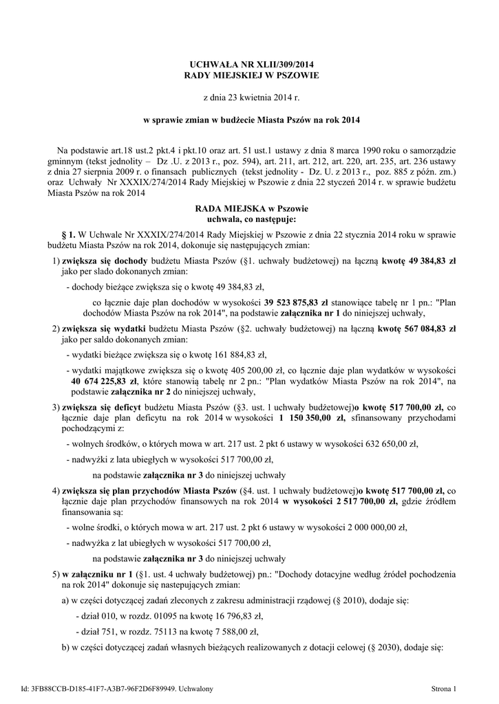 UCHWAŁA NR XLII/309/2014 RADY MIEJSKIEJ W PSZOWIE z dnia 23 kwietnia 2014 r. w sprawie zmian w budżecie Miasta Pszów na rok 2014 Na podstawie art.18 ust.2 pkt.4 i pkt.10 oraz art. 51 ust.1 ustawy z dnia 8 marca 1990 roku o samorządzie gminnym (tekst jednolity – Dz .U. z 2013 r., poz. 594), art. 211, art. 212, art. 220, art. 235, art. 236 ustawy z dnia 27 sierpnia 2009 r. o finansach publicznych (tekst jednolity - Dz. U. z 2013 r., poz. 885 z późn. zm.) oraz Uchwały Nr XXXIX/274/2014 Rady Miejskiej w Pszowie z dnia 22 styczeń 2014 r. w sprawie budżetu Miasta Pszów na rok 2014 RADA MIEJSKA w Pszowie uchwala, co następuje: § 1. W Uchwale Nr XXXIX/274/2014 Rady Miejskiej w Pszowie z dnia 22 stycznia 2014 roku w sprawie budżetu Miasta Pszów na rok 2014, dokonuje się następujących zmian: 1) zwiększa się dochody budżetu Miasta Pszów (§1. uchwały budżetowej) na łączną kwotę 49 384,83 zł jako per slado dokonanych zmian: - dochody bieżące zwiększa się o kwotę 49 384,83 zł, co łącznie daje plan dochodów w wysokości 39 523 875,83 zł stanowiące tabelę nr 1 pn.: "Plan dochodów Miasta Pszów na rok 2014", na podstawie załącznika nr 1 do niniejszej uchwały, 2) zwiększa się wydatki budżetu Miasta Pszów (§2. uchwały budżetowej) na łączną kwotę 567 084,83 zł jako per saldo dokonanych zmian: - wydatki bieżące zwiększa się o kwotę 161 884,83 zł, - wydatki majątkowe zwiększa się o kwotę 405 200,00 zł, co łącznie daje plan wydatków w wysokości 40 674 225,83 zł, które stanowią tabelę nr 2 pn.: "Plan wydatków Miasta Pszów na rok 2014", na podstawie załącznika nr 2 do niniejszej uchwały, 3) zwiększa się deficyt budżetu Miasta Pszów (§3. ust. 1 uchwały budżetowej)o kwotę 517 700,00 zł, co łącznie daje plan deficytu na rok 2014 w wysokości 1 150 350,00 zł, sfinansowany przychodami pochodzącymi z: - wolnych środków, o których mowa w art. 217 ust. 2 pkt 6 ustawy w wysokości 632 650,00 zł, - nadwyżki z lata ubiegłych w wysokości 517 700,00 zł, na podstawie załącznika nr 3 do niniejszej uchwały 4) zwiększa się plan przychodów Miasta Pszów (§4. ust. 1 uchwały budżetowej)o kwotę 517 700,00 zł, co łącznie daje plan przychodów finansowych na rok 2014 w wysokości 2 517 700,00 zł, gdzie źródłem finansowania są: - wolne środki, o których mowa w art. 217 ust. 2 pkt 6 ustawy w wysokości 2 000 000,00 zł, - nadwyżka z lat ubiegłych w wysokości 517 700,00 zł, na podstawie załącznika nr 3 do niniejszej uchwały 5) w załączniku nr 1 (§1. ust. 4 uchwały budżetowej) pn.: "Dochody dotacyjne według źródeł pochodzenia na rok 2014" dokonuje się nastepujących zmian: a) w części dotyczącej zadań zleconych z zakresu administracji rządowej (§ 2010), dodaje się: - dział 010, w rozdz. 01095 na kwotę 16 796,83 zł, - dział 751, w rozdz. 75113 na kwotę 7 588,00 zł, b) w części dotyczącej zadań własnych bieżących realizowanych z dotacji celowej (§ 2030), dodaje się: Id: 3FB88CCB-D185-41F7-A3B7-96F2D6F89949. Uchwalony Strona 1 - dział 854, rozdz. 85415 na kwotę 25 000,00 zł, 6) w załączniku nr 3 (§8. ust. 1 i 2 uchwały budżetowej) pn.: "Zestawienie planowanych kwot dotacji do wydatkowania z budżetu Miasta Pszów w roku 2014", dokonuje się następujących zmian: a) w części dotyczącej jednostek sektora finansów publicznych (w zakresie dotacji celowej) dokonuje się zmian: - dodaje się dział 851, rozdz. 85195 na kwotę 10 000,00 zł, w tym dla PPZOZ Oddziału Neurologicznego w Wodzisławiu Śl. na kwotę 7 000,00 zł oraz Wojewódzkiego Szpitala Chorób Płuc w Wodzisławiu Śl. na kwotę 3 000,00 zł, - dodaje się dział 900, rozdz. 90001 na kwotę 54 000,00 zł. 7) w załączniku nr 5 (§10. uchwały budżetowej) pn.: "Zakres rzeczowo finansowy planowanych remontów o inwestycji do wydatkowania w 2014 roku", na podstawie załącznika nr 5 do niniejszej uchwały, dokonuje się następujących zmian : a) w dziale 600, rozdz. 60016 - zwiększa się zadanie nr 4 pn.: "Remont ulicy Niepodległości w Pszowie" o kwotę 60 000,00 zł, - dodaje się zadanie nr 5 pn.: "Wykonanie dokumentacji projektowej dróg gminnych" na kwotę 58 000,00 zł, - dodaje się zadanie nr 6 pn.: "Modernizacja ul. Obrońców Pokoju - odwodnienie" na kwotę 70 000,00 zł, - dodaje się zadanie nr 7 pn.: "Remont drogi dojazdowej do przepompowni zlokalizowanej przy ul. Pszowskiej (bocznej)" na kwotę 40 000,00 zł, b) w dziale 700, rozdz. 70005 - dodaje się zadanie nr 6 pn.: "Modernizacja OSP Pszów" na kwotę 80 000,00 zł, - dodaje się zadanie nr 7 pn.: "Wykup terenu pod budowę chodnika na ul. Konopnickiej" na kwotę 7 000,00 zł, c) w dziale 801, rozdz. 80110 - dodaje się zadanie nr 3 pn.: "Budowa ogrodzenia przy Gimnazjum w Pszowie" na kwotę 15 000,00 zł, d) w dziale 900 - rozdz. 90001 zwiększa się zadanie nr 2 pn.: "Budowa kanalizacji sanitarnej na terenie Pszowa"o kwotę 120 000,00 zł, - rozdz. 90015 zwiększa się zadanie nr 1 pn.: "Projekt budowy sieci oświetleniowej w ciągu ul. Rejtana" o kwotę 1 200,00 zł. § 2. Zmianie ulega załącznik nr 2 (§6. uchwały budżetowej) pn.: "PLAN PRZYCHODÓW I KOSZTÓW na rok 2014 Zakładu Gospodarki Komunalnej i Mieszkaniowej w Pszowie", Uchwały Nr XXXIX/274/2014 Rady Miejskiej w Pszowie z dnia 22 styczeń 2014 r. w sprawie budżetu Miasta Pszów na rok 2014, stanowiącym załącznik nr 4 do niniejszej uchwały. § 3. Wprowadzone zmiany w § 1. niniejszej uchwały skutkują zmianami w załączniku nr 6 (§11. ust. 7 uchwały budżetowej) pn.: "Budżet 2014 w ujęciu zadaniowym", do uchwały budżetowej. § 4. Wykonanie uchwały powierza się Burmistrzowi Miasta Pszów. Id: 3FB88CCB-D185-41F7-A3B7-96F2D6F89949. Uchwalony Strona 2 § 5. Uchwała wchodzi w życie z dniem podjęcia i podlega publigacji w Dzienniku Urzędowym Województwa Śląskiego. Przewodniczący Rady Miejskiej Paweł Kowol Id: 3FB88CCB-D185-41F7-A3B7-96F2D6F89949. Uchwalon