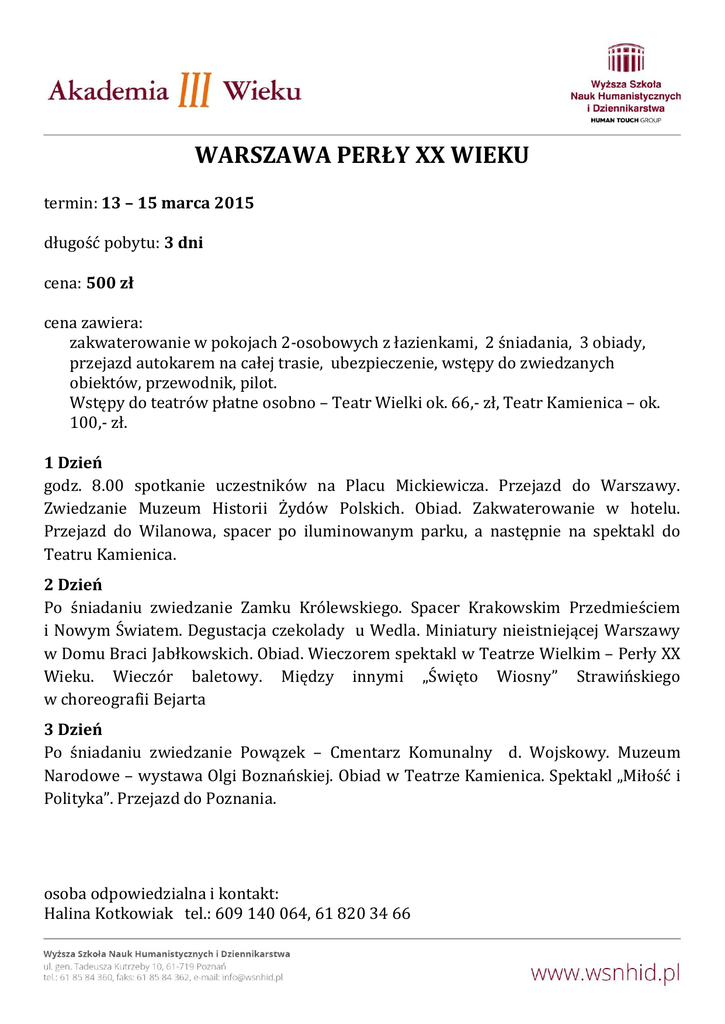 WARSZAWA PERŁY XX WIEKU termin: 13 – 15 marca 2015 długość pobytu: 3 dni cena: 500 zł cena zawiera: zakwaterowanie w pokojach 2-osobowych z łazienkami, 2 śniadania, 3 obiady, przejazd autokarem na całej trasie, ubezpieczenie, wstępy do zwiedzanych obiektów, przewodnik, pilot. Wstępy do teatrów płatne osobno – Teatr Wielki ok. 66,- zł, Teatr Kamienica – ok. 100,- zł. 1 Dzień godz. 8.00 spotkanie uczestników na Placu Mickiewicza. Przejazd do Warszawy. Zwiedzanie Muzeum Historii Żydów Polskich. Obiad. Zakwaterowanie w hotelu. Przejazd do Wilanowa, spacer po iluminowanym parku, a następnie na spektakl do Teatru Kamienica. 2 Dzień Po śniadaniu zwiedzanie Zamku Królewskiego. Spacer Krakowskim Przedmieściem i Nowym Światem. Degustacja czekolady u Wedla. Miniatury nieistniejącej Warszawy w Domu Braci Jabłkowskich. Obiad. Wieczorem spektakl w Teatrze Wielkim – Perły XX Wieku. Wieczór baletowy. Między innymi „Święto Wiosny” Strawińskiego w choreografii Bejarta 3 Dzień Po śniadaniu zwiedzanie Powązek – Cmentarz Komunalny d. Wojskowy. Muzeum Narodowe – wystawa Olgi Boznańskiej. Obiad w Teatrze Kamienica. Spektakl „Miłość i Polityka”. Przejazd do Poznania. osoba odpowiedzialna i kontakt: Halina Kotkowiak tel.: 609 140 064, 61 820 34 66