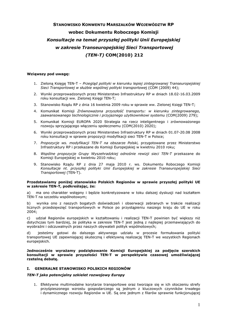 STANOWISKO KONWENTU MARSZAŁKÓW WOJEWÓDZTW RP wobec Dokumentu Roboczego Komisji Konsultacje na temat przyszłej polityki Unii Europejskiej w zakresie Transeuropejskiej Sieci Transportowej (TEN-T) COM(2010) 212 Wziąwszy pod uwagę: 1. Zieloną Księgę TEN-T – Przegląd polityki w kierunku lepiej zintegrowanej Transeuropejskiej Sieci Transportowej w służbie wspólnej polityki transportowej (COM (2009) 44); 2. Wyniki przeprowadzonych przez Ministerstwo Infrastruktury RP w dniach 18.02-16.03.2009 roku konsultacji ww. Zielonej Księgi TEN-T; 3. Stanowisko Rządu RP z dnia 16 kwietnia 2009 roku w sprawie ww. Zielonej Księgi TEN-T; 4. Komunikat Komisji Zrównoważona przyszłość transportu: w kierunku zintegrowanego, zaawansowanego technologicznie i przyjaznego użytkownikowi systemu (COM(2009) 279); 5. Komunikat Komisji EUROPA 2020 Strategia na rzecz inteligentnego i zrównoważonego rozwoju sprzyjającego włączeniu społecznemu (COM(2010) 2020); 6. Wyniki przeprowadzonych przez Ministerstwo Infrastruktury RP w dniach 01.07-20.08 2008 roku konsultacji w sprawie propozycji modyfikacji sieci TEN-T w Polsce; 7. Propozycje ws. modyfikacji TEN-T na obszarze Polski, przygotowane przez Ministerstwo Infrastruktury RP i przekazane do Komisji Europejskiej w kwietniu 2010 roku; 8. Wspólne propozycje Grupy Wyszehradzkiej odnośnie rewizji sieci TEN-T przekazane do Komisji Europejskiej w kwietniu 2010 roku; 9. Stanowisko Rządu RP z dnia 27 maja 2010 r. ws. Dokumentu Roboczego Komisji Konsultacje nt. przyszłej polityki Unii Europejskiej w zakresie Transeuropejskiej Sieci Transportowej (TEN-T). Przedstawiamy poniżej stanowisko Polskich Regionów w sprawie przyszłej polityki UE w zakresie TEN-T, podkreślając, że: a) ma ono charakter wstępny i będzie konkretyzowane w toku dalszej dyskusji nad kształtem TEN-T na szczeblu wspólnotowym; b) wynika ono z naszych bogatych doświadczeń i obserwacji zebranych w trakcie realizacji licznych przedsięwzięć transportowych w Polsce po przystąpieniu naszego kraju do UE w roku 2004; c) udział Regionów europejskich w kształtowaniu i realizacji TEN-T powinien być większy niż dotychczas tym bardziej, że polityka w zakresie TEN-T jest jedną z najlepiej przemawiających do wyobraźni i odczuwalnych przez naszych obywateli polityk wspólnotowych; d) jesteśmy gotowi do dalszego aktywnego udziału w procesie formułowania polityki transportowej UE zapewniającej skuteczną i efektywną realizację TEN-T we wszystkich Regionach europejskich. Jednocześnie wyrażamy podziękowanie Komisji Europejskiej za podjęcie szerokich konsultacji w sprawie przyszłości TEN-T w perspektywie czasowej umożliwiającej rzetelną debatę. I. GENERALNE STANOWISKO POLSKICH REGIONÓW TEN-T jako potencjalny szkielet rozwojowy Europy 1. Efektywne multimodalne korytarze transportowe oraz tworzące się w ich otoczeniu strefy przyśpieszonego wzrostu gospodarczego są jednym z kluczowych czynników trwałego i dynamicznego rozwoju Regionów w UE. Są one jednym z filarów sprawnie funkcjonującej 1 gospodarki rynkowej, stwarzając warunki dla uczciwej konkurencji w skali całej UE. Warunkiem efektywnego funkcjonowania tych korytarzy i stref przyśpieszonego wzrostu jest ich wyposażenie w wysokiej jakości infrastrukturę transportową. 2. TEN-T to jedna z najważniejszych sieci infrastrukturalnych w UE. Powinna być ona realizowana zgodnie z zasadami: integralności, spójności, innowacyjności i kompatybilności, tworząc warunki dla dynamicznego rozwoju zintegrowanych łańcuchów transportowych i pełniąc rolę integratora przestrzeni w skali całej Wspólnoty. TEN-T powinna realizować zarówno kluczowe funkcje dostępowe w odniesieniu do regionów, jak też konkretne funkcje gospodarcze w odniesieniu do państw członkowskich. 3. System transportowy UE nie jest w pełni zintegrowany. Mamy do czynienia z dużymi dysproporcjami w rozwoju infrastruktury transportowej między krajami UE, a sama TEN-T jest rozłożona nierównomiernie. Biorąc pod uwagę wskaźniki gęstości dróg samochodowych, linii kolejowych oraz portów lotniczych i wodnych w stosunku do liczby ludności lub powierzchni kraju, Polska plasuje się na ostatnich pozycjach w UE. Problem ten jest jeszcze bardziej wyrazisty na poziomie regionalnym. TEN-T jako narzędzie osiągania spójności i konkurencyjności Europy 4. Rozwój TEN-T umożliwia realizację podstawowych swobód UE w zakresie przepływu osób i towarów. Racjonalnie i kompleksowo realizowana TEN-T powinna przyczyniać się do wzrostu powiązań gospodarczych i społecznych Wspólnoty, z korzyścią dla wszystkich Regionów UE. 5. TEN-T wymaga modyfikacji ze względu na nowe wyzwania stojące przed UE. Zapisy Traktatu Lizbońskiego niezmiennie podkreślają kluczowe cele Wspólnoty, którym powinna służyć polityka w zakresie TEN-T. Są to: jednolity rynek, innowacyjność, konkurencyjność, spójność, jakość środowiska przyrodniczego. TEN-T powinna być więc kształtowana tak, aby w jak największym stopniu przybliżać UE do osiągnięcia tych celów. 6. Strategia EUROPA 2020 podkreśla konieczność podjęcia zdecydowanych działań mających na celu usuwanie istniejących barier rozwoju infrastruktury transportowej, które mogą być jednym z czynników hamujących wzrost gospodarczy zarówno na poziomie Wspólnoty, jak i na poziomie poszczególnych krajów UE. Sprawność TEN-T jest jednym z kluczowych warunków realizacji takich celów, jak: sprawne działanie jednolitego rynku UE, konkurencyjność UE w skali globalnej, a także spójność gospodarcza, społeczna i terytorialna UE. Tych najważniejszych celów wspólnotowych nie można jednak osiągnąć bez zakończenia realizacji wszystkich istotnych elementów sieci TEN-T. Cele te powinny więc być najważniejszymi przesłankami w planowaniu docelowego układu TEN-T. 7. Realizacja polityki w zakresie TEN-T wywołuje istotne efekty terytorialne. Duże zróżnicowa