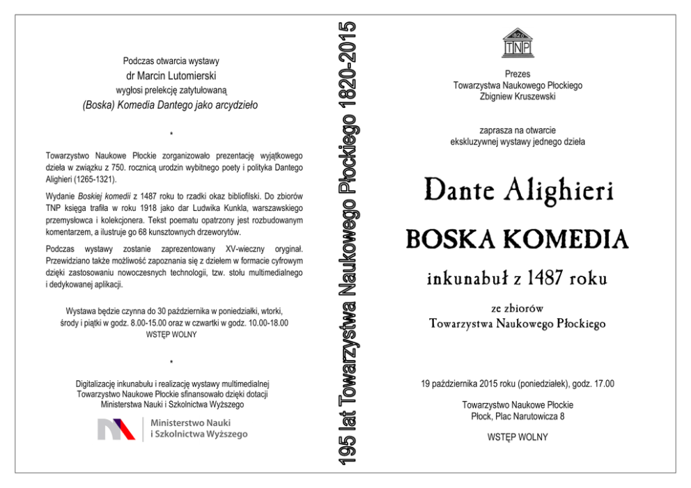 Podczas otwarcia wystawy dr Marcin Lutomierski wygłosi prelekcję zatytułowaną (Boska) Komedia Dantego jako arcydzieło * Towarzystwo Naukowe Płockie zorganizowało prezentację wyjątkowego dzieła w związku z 750. rocznicą urodzin wybitnego poety i polityka Dantego Alighieri (1265-1321). Wydanie Boskiej komedii z 1487 roku to rzadki okaz bibliofilski. Do zbiorów TNP księga trafiła w roku 1918 jako dar Ludwika Kunkla, warszawskiego przemysłowca i kolekcjonera. Tekst poematu opatrzony jest rozbudowanym komentarzem, a ilustruje go 68 kunsztownych drzeworytów. Podczas wystawy zostanie zaprezentowany XV-wieczny oryginał. Przewidziano także możliwość zapoznania się z dziełem w formacie cyfrowym dzięki zastosowaniu nowoczesnych technologii, tzw. stołu multimedialnego i dedykowanej aplikacji. Wystawa będzie czynna do 30 października w poniedziałki, wtorki, środy i piątki w godz. 8.00-15.00 oraz w czwartki w godz. 10.00-18.00 WSTĘP WOLNY Prezes Towarzystwa Naukowego Płockiego Zbigniew Kruszewski zaprasza na otwarcie ekskluzywnej wystawy jednego dzieła Dante Alighieri BOSKA KOMEDIA inkunabuł z 1487 roku ze zbiorów Towarzystwa Naukowego Płockiego * Digitalizację inkunabułu i realizację wystawy multimedialnej Towarzystwo Naukowe Płockie sfinansowało dzięki dotacji Ministerstwa Nauki i Szkolnictwa Wyższego 19 października 2015 roku (poniedziałek), godz. 17.00 Towarzystwo Naukowe Płockie Płock, Plac Narutowicza 8 WSTĘP WOLNY