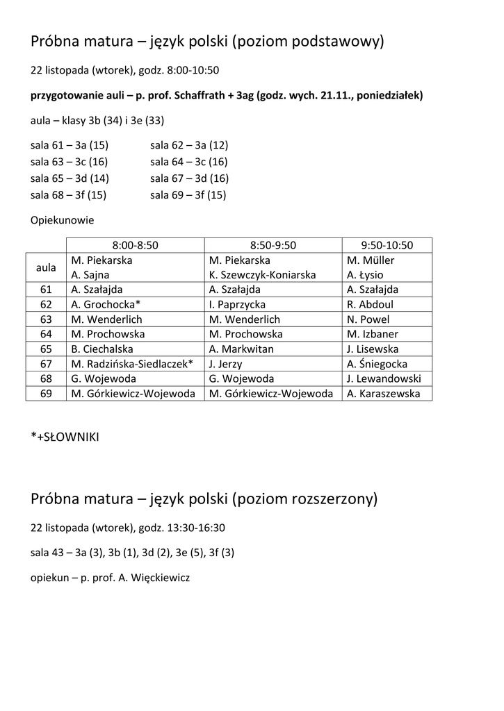 Próbna matura – język polski (poziom podstawowy) 22 listopada (wtorek), godz. 8:00-10:50 przygotowanie auli – p. prof. Schaffrath + 3ag (godz. wych. 21.11., poniedziałek) aula – klasy 3b (34) i 3e (33) sala 61 – 3a (15) sala 63 – 3c (16) sala 65 – 3d (14) sala 68 – 3f (15) sala 62 – 3a (12) sala 64 – 3c (16) sala 67 – 3d (16) sala 69 – 3f (15) Opiekunowie aula 61 62 63 64 65 67 68 69 8:00-8:50 M. Piekarska A. Sajna A. Szałajda A. Grochocka* M. Wenderlich M. Prochowska B. Ciechalska M. Radzioska-Siedlaczek* G. Wojewoda M. Górkiewicz-Wojewoda 8:50-9:50 M. Piekarska K. Szewczyk-Koniarska A. Szałajda I. Paprzycka M. Wenderlich M. Prochowska A. Markwitan J. Jerzy G. Wojewoda M. Górkiewicz-Wojewoda 9:50-10:50 M. Müller A. Łysio A. Szałajda R. Abdoul N. Powel M. Izbaner J. Lisewska A. Śniegocka J. Lewandowski A. Karaszewska *+SŁOWNIKI Próbna matura – język polski (poziom rozszerzony) 22 listopada (wtorek), godz. 13:30-16:30 sala 43 – 3a (3), 3b (1), 3d (2), 3e (5), 3f (3) opiekun – p. prof. A. Więckiewicz