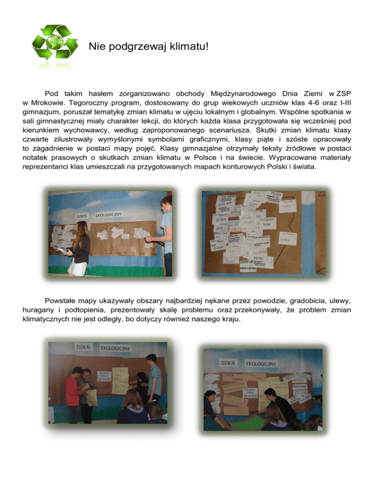 Nie podgrzewaj klimatu! Pod takim hasłem zorganizowano obchody Międzynarodowego Dnia Ziemi w ZSP w Mrokowie. Tegoroczny program, dostosowany do grup wiekowych uczniów klas 4-6 oraz I-III gimnazjum, poruszał tematykę zmian klimatu w ujęciu lokalnym i globalnym. Wspólne spotkania w sali gimnastycznej miały charakter lekcji, do których każda klasa przygotowała się wcześniej pod kierunkiem wychowawcy, według zaproponowanego scenariusza. Skutki zmian klimatu klasy czwarte zilustrowały wymyślonymi symbolami graficznymi, klasy piąte i szóste opracowały to zagadnienie w postaci mapy pojęć. Klasy gimnazjalne otrzymały teksty źródłowe w postaci notatek prasowych o skutkach zmian klimatu w Polsce i na świecie. Wypracowane materiały reprezentanci klas umieszczali na przygotowanych mapach konturowych Polski i świata. Powstałe mapy ukazywały obszary najbardziej nękane przez powodzie, gradobicia, ulewy, huragany i podtopienia, prezentowały skalę problemu oraz przekonywały, że problem zmian klimatycznych nie jest odległy, bo dotyczy również naszego kraju. Dodatkowym elementem spotkania gimnazjalistów były krótkie filmy ukazujące problem strat w rolnictwie na skutek powodzi w Bangladeszu, wojen o wodę w Etiopii, podnoszenia się poziomu wody w Nepalu i następstw huraganów w Brazylii. Dla uczniów szkoły podstawowej atrakcją był niewątpliwie występ taneczny ucznia klasy czwartej oraz pokaz Eko-mody przygotowany przez uczennice z koła Młodzi Ekolodzy. Spotkanie było dobrą okazją na podsumowanie akcji zbiórek makulatury oraz konkursu „Tajemnice przyrody” dla klas 4-6 szkoły podstawowej. Laureaci oraz finaliści konkursu otrzymali pamiątkowe dyplomy i upominki oraz cząstkowe oceny bardzo dobre bądź celujące z przyrody. Uczniowie z zainteresowaniem śledzili przebieg spotkania, którego celem było nie tylko zwrócenie uwagi na globalne zmiany klimatu, ale również uświadomienie sobie, że każdy z nas ma wpływ na obecne zmiany środowiska przyrodniczego i na stan naszej planety. W czasie spotkań uczniowie mieli możliwość podania swoich propozycji działań - co mogą zrobić by „nie podgrzewać klimatu”, a dwójka uczniów gimnazjum prowadzących podsumowała wypowiedzi. Liczne propozycje uczestników spotkania pozwalają mieć nadzieję, że edukacja ekologiczna w szkołach przełoży się na wykształcenie nawyków działań na rzecz planety w życiu codziennym. Aneta Michalczyk, Jolanta Januszewicz- organizatorzy spotkania