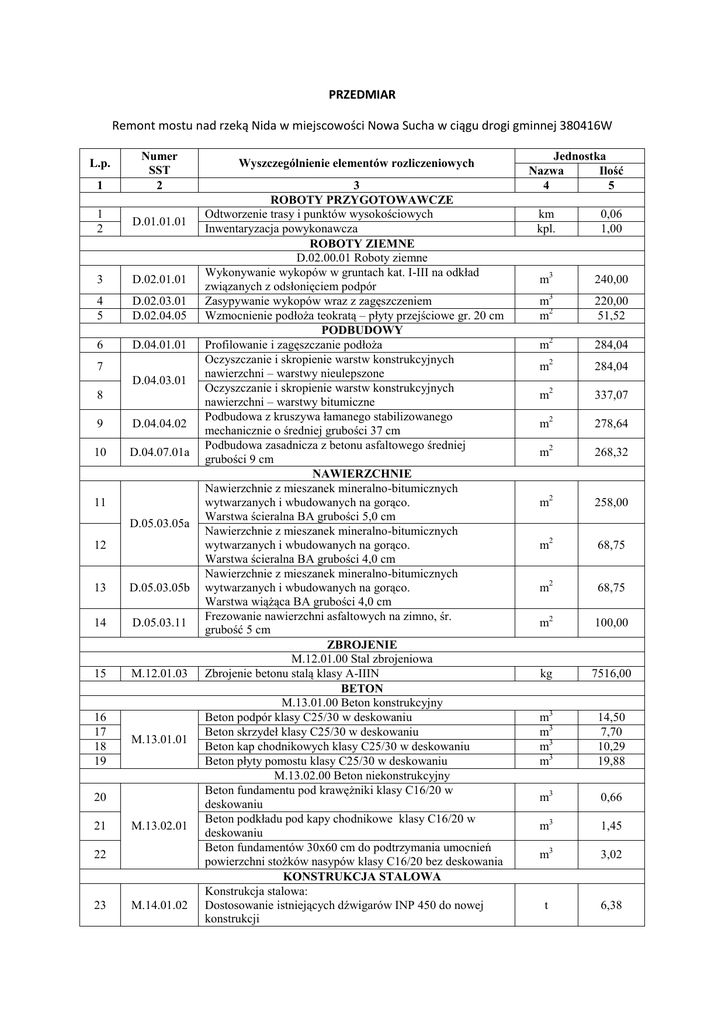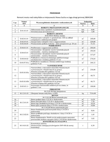 PRZEDMIAR Remont mostu nad rzeką Nida w miejscowości Nowa Sucha w ciągu drogi gminnej 380416W L.p. 1 Numer SST 2 1 2 D.01.01.01 3 D.02.01.01 4 5 D.02.03.01 D.02.04.05 6 D.04.01.01 7 D.04.03.01 8 9 D.04.04.02 10 D.04.07.01a 11 D.05.03.05a 12 13 D.05.03.05b 14 D.05.03.11 15 M.12.01.03 16 17 18 19 M.13.01.01 20 21 M.13.02.01 22 23 M.14.01.02 Wyszczególnienie elementów rozliczeniowych 3 ROBOTY PRZYGOTOWAWCZE Odtworzenie trasy i punktów wysokościowych Inwentaryzacja powykonawcza ROBOTY ZIEMNE D.02.00.01 Roboty ziemne Wykonywanie wykopów w gruntach kat. I-III na odkład związanych z odsłonięciem podpór Zasypywanie wykopów wraz z zagęszczeniem Wzmocnienie podłoża teokratą – płyty przejściowe gr. 20 cm PODBUDOWY Profilowanie i zagęszczanie podłoża Oczyszczanie i skropienie warstw konstrukcyjnych nawierzchni – warstwy nieulepszone Oczyszczanie i skropienie warstw konstrukcyjnych nawierzchni – warstwy bitumiczne Podbudowa z kruszywa łamanego stabilizowanego mechanicznie o średniej grubości 37 cm Podbudowa zasadnicza z betonu asfaltowego średniej grubości 9 cm NAWIERZCHNIE Nawierzchnie z mieszanek mineralno-bitumicznych wytwarzanych i wbudowanych na gorąco. Warstwa ścieralna BA grubości 5,0 cm Nawierzchnie z mieszanek mineralno-bitumicznych wytwarzanych i wbudowanych na gorąco. Warstwa ścieralna BA grubości 4,0 cm Nawierzchnie z mieszanek mineralno-bitumicznych wytwarzanych i wbudowanych na gorąco. Warstwa wiążąca BA grubości 4,0 cm Frezowanie nawierzchni asfaltowych na zimno, śr. grubość 5 cm ZBROJENIE M.12.01.00 Stal zbrojeniowa Zbrojenie betonu stalą klasy A-IIIN BETON M.13.01.00 Beton konstrukcyjny Beton podpór klasy C25/30 w deskowaniu Beton skrzydeł klasy C25/30 w deskowaniu Beton kap chodnikowych klasy C25/30 w deskowaniu Beton płyty pomostu klasy C25/30 w deskowaniu M.13.02.00 Beton niekonstrukcyjny Beton fundamentu pod krawężniki klasy C16/20 w deskowaniu Beton podkładu pod kapy chodnikowe klasy C16/20 w deskowaniu Beton fundamentów 30x60 cm do podtrzymania umocnień powierzchni stożków nasypów klasy C16/20 bez deskowania KONSTRUKCJA STALOWA Konstrukcja stalowa: Dostosowanie istniejących dźwigarów INP 450 do nowej konstrukcji Jednostka Nazwa Ilość 4 5 km kpl. 0,06 1,00 m3 240,00 3 m m2 220,00 51,52 m2 284,04 2 m 284,04 m2 337,07 m2 278,64 m2 268,32 m2 258,00 m2 68,75 m2 68,75 m2 100,00 kg 7516,00 m3 m3 m3 m3 14,50 7,70 10,29 19,88 m3 0,66 m3 1,45 m3 3,02 t 6,38 1 24 25 2 M.14.01.02 26 M.14.02.01 27 M.15.01.02 28 M.15.02.03 29 M.15.03.04 30 M.16.01.03 31 32 M.19.01.01 M.19.01.04 33 M.20.01.02 34 M.20.01.05 35 M.20.01.08 36 M.20.01.09 37 M.20.01.11 38 M.20.01.12 39 M.20.02.02 40 41 M.20.04.01 42 M.20.20.01b 3 Konstrukcja stalowa: - wykonanie nowych poprzecznic Konstrukcja stalowa: - wykonanie kołków zespalających Antykorozyjne zabezpieczenie konstrukcji stalowej - Grunt epoksydowy wysokocynowy o gr. 80µm - Powłoka międzywarstwowa epoksydowa z wypełnieniem typu MIO o gr. 180µm - Powłoka nawierzchniowa poliuretanowa o gr. 80 µm IZOLACJA M.15.01.00 Izolacja cienka Izolacja z roztworów asfaltowych na zimno – R + 2P M.15.02.00 Izolacja gruba Izolacja z papy zgrzewalnej grubości ≥ 0,5 cm Nawierzchnioizolacja żywiczna na kapach chodnikowych gr. 5 mm ODWODNIENIE Odwodnienie izolacji płyty pomostu – drenaż poziomy ELEMENTY ZABEZPIECZAJĄCE Krawężnik mostowy kamienny 20x20 cm Balustrada na obiektach mostowych , typ szczeblinkowy ROBOTY MOSTOWE M.20.01.00 Roboty różne Warstwa filtracyjna za przyczółkiem wraz z zabezpieczeniem (folia kubełkowa + żwir + uszczelnienie gliną) Umocnienie stożków nasypu prefabrykowanymi elementami betonowymi drobnowymiarowymi Zabezpieczenie antykorozyjne powierzchni betonowych powłokami Schody skarpowe prefabrykowane szer. 80 cm Umocnienie skarpy nasypu koszami gabionowymi 100x100x400 cm na geowłókninie Umocnienie dna i skarp rzeki narzutem kamiennym gr. 20 cm na geowłókninie w kiszce faszynowej Ø 20 cm z wykonaniem palisady z kołków Ø 10 cm i długości 100 cm Wiercenie otworów o głębokości do 20 cm w konstrukcjach żelbetowych z osadzeniem stalowych bolców zespalających Ø 16 mm na zaprawach kotwiących Wiercenie otworów o głębokości do 20 cm w konstrukcjach żelbetowych z osadzeniem stalowych bolców zespalających Ø 25 mm na zaprawach kotwiących Wyburzenie obiektów budowlanych i inżynierskich: - konstrukcja stalowa - częściowe rozebranie betonu podpór Iniekcja epoksydowa wzdłuż rys na podporach 4 t szt. 5 1,07 304,00 m2 113,92 m2 65,00 m2 100,00 2 m 33,11 m 25,70 m m 40,30 33,20 m2 60,00 m2 28,00 m2 144,00 m 12,00 2 m 4,00 m2 276,00 szt. 114,00 szt. 166,00 x t m3 mb x 6,38 24,96 40,00