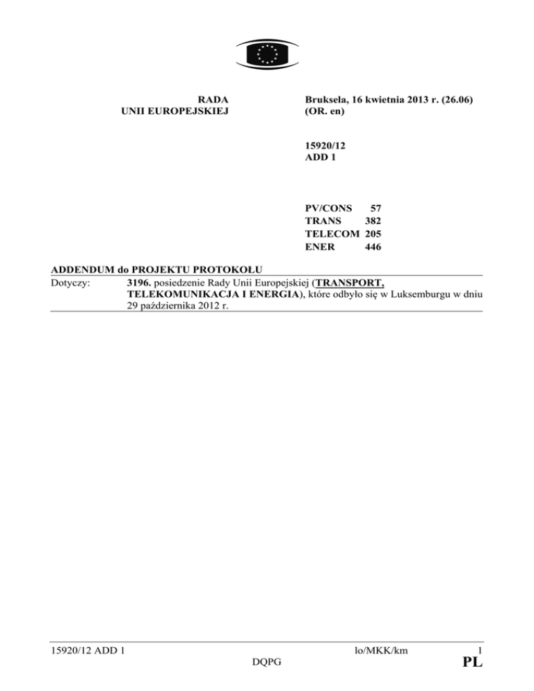 RADA UNII EUROPEJSKIEJ Bruksela, 16 kwietnia 2013 r. (26.06) (OR. en) 15920/12 ADD 1 PV/CONS TRANS TELECOM ENER 57 382 205 446 ADDENDUM do PROJEKTU PROTOKOŁU Dotyczy: 3196. posiedzenie Rady Unii Europejskiej (TRANSPORT, TELEKOMUNIKACJA I ENERGIA), które odbyło się w Luksemburgu w dniu 29 października 2012 r. 15920/12 ADD 1 DQPG lo/MKK/km 1 PL PUNKTY PORZĄDKU OBRAD OTWARTYCH DLA PUBLICZNOŚCI 1 Strona Wykaz PUNKTÓW A (dok. 15279/12 PTS A 87) Punkt 1. Dyrektywa Parlamentu Europejskiego i Rady zmieniająca dyrektywę 1999/32/WE w zakresie zawartości siarki w paliwach żeglugowych [pierwsze czytanie] (AU + O) ........ 3 Punkt 2. Dyrektywa Parlamentu Europejskiego i Rady w sprawie utworzenia jednolitego europejskiego obszaru kolejowego (wersja przekształcona) [drugie czytanie] (AU + O) ........ 8 PUNKTY PORZĄDKU OBRAD (dok. 15126/12 OJ CONS 56 TRANS 342 TELECOM 187 ENER 414) Punkt 4. Pakiet dotyczący wykonania Konwencji o pracy na morzu................................................ 11 Punkt 5. Wniosek dotyczący rozporządzenia Parlamentu Europejskiego i Rady w sprawie wspólnych zasad przydzielania czasu na start lub lądowanie w portach lotniczych Unii Europejskiej (wersja przekształcona) [pierwsze czytanie] ......................................... 14 Punkt 7. Wniosek dotyczący rozporządzenia Parlamentu Europejskiego i Rady zmieniającego rozporządzenie Rady (EWG) nr 3821/85 w sprawie urządzeń rejestrujących stosowanych w transporcie drogowym oraz rozporządzenie (WE) nr 561/2006 Parlamentu Europejskiego i Rady („Tachograf”) (pierwsze czytanie)........... 14 Punkt 8. Wniosek dotyczący rozporządzenia Parlamentu Europejskiego i Rady w sprawie okresowych badań przydatności do ruchu drogowego pojazdów silnikowych i ich przyczep i uchylającego dyrektywę 2009/40/WE [pierwsze czytanie]............................... 15 * 1 * * Obrady nad aktami ustawodawczymi Unii (art. 16 ust. 8 Traktatu o Unii Europejskiej), inne obrady Rady otwarte dla publiczności oraz debaty jawne (art. 8 regulaminu wewnętrznego Rady). 15920/12 ADD 1 DQPG lo/MKK/km 2 PL OBRADY USTAWODAWCZE (obrady otwarte dla publiczności zgodnie z art. 16 ust. 8 Traktatu o Unii Europejskiej) PUNKTY A 1. Dyrektywa Parlamentu Europejskiego i Rady zmieniająca dyrektywę 1999/32/WE w zakresie zawartości siarki w paliwach żeglugowych [pierwsze czytanie] (AU + O) PE-CONS 31/12 ENV 445 MAR 77 MI 393 CODEC 1493 OC 271 + COR 1 (ro) Rada zatwierdziła poprawkę przedstawioną w stanowisku Parlamentu Europejskiego w pierwszym czytaniu i przyjęła odpowiednio zmieniony proponowany akt na mocy art. 294 ust. 4 Traktatu o funkcjonowaniu Unii Europejskiej; delegacja Niemiec głosowała przeciwko, a delegacje Estonii i Finlandii wstrzymały się od głosu. (Podstawa prawna: art. 192 ust. 1 TFUE). Oświadczenia Komisji Europejskiej 1. Motyw 27. Oświadczenie Komisji dotyczące zmiany dyrektywy 2000/59/WE w sprawie portowych urządzeń do odbioru odpadów wytwarzanych przez statki i pozostałości ładunku „Komisja przypomina, że objęcie kwestii zbierania pozostałości z oczyszczania spalin przyszłą zmianą dyrektywy 2000/59/WE całkowicie podlega jej wyłącznemu prawu do inicjatywy. Chociaż Komisja faktycznie zamierza to rozważyć, nie przesądza to w żaden sposób wyniku jej rozważań ani treści przyszłego wniosku, w szczególności tego, czy w odniesieniu do odpadów należy stosować politykę nienakładania opłat specjalnych”. 2. Oświadczenie Komisji w sprawie procedury przyjmowania aktów wykonawczych „Komisja uważa, że w przypadku braku opinii zastosowanie ma art. 5 ust. 4 akapit 2 lit. a) rozporządzenia 182/2011 (Dz.U. L 55 z 28.2.2011 s. 13), ponieważ celem dyrektywy jest ochrona zdrowia ludzkiego i środowiska. Dlatego nie ma potrzeby wstawiania odesłania do faktu, że projekt aktu wykonawczego nie może zostać przyjęty przez Komisję, o ile nie wydano żadnej opinii”. 3. Oświadczenie Komisji w sprawie stosowania dynamicznego odniesienia do umów międzynarodowych „Komisja uważa, że dynamiczne odniesienie do decyzji IMO dotyczące ustanowienia nowych stref kontroli emisji tlenku siarki (SECA) za pośrednictwem art. 2 ust. 3e przedmiotowej dyrektywy jest niewłaściwe z prawnego punktu widzenia, ponieważ powoduje automatyczne zatwierdzenie decyzji IMO poza zakresem stosowania zwykłej procedury ustawodawczej”. 15920/12 ADD 1 DQPG lo/MKK/km 3 PL 4. Oświadczenie Komisji w sprawie stosowania aktów wykonawczych „Komisja uważa, że środki dotyczące częstotliwości pobierania próbek, definicji próbki reprezentatywnej (art. 6 ust. 1b lit a) i c)) oraz informacji, które mają być włączone do sprawozdania (art. 7 ust 1a), nie mają charakteru wykonawczego i tym samym nie podlegają art. 291 TFUE. Komisja jest zdania, że właściwą procedurą w odniesieniu do tych kwestii jest ta, o której mowa w art. 290, gdyż środki te pociągają za sobą działania o zasięgu ogólnym, które zmodyfikują lub uzupełnią inne niż istotne elementy dyrektywy. Komisja zastrzega wszystkie swoje prawa w tym względzie”. 5. Oświadczenie Komisji dotyczące skierowanego do Komisji postulatu, by do końca 2012 r. opracowała ona nowe środki wspierające realizację przedmiotowej dyrektywy „Komisja przypomina, że we wrześniu 2011 r. został opublikowany dokument roboczy Komisji dotyczący niezbędnika zrównoważonego transportu wodnego, że niezbędnik ten zawierał zestaw środków, które można stosować w perspektywie krótko-, średnioi długoterminowej, i że Komisja aktywnie kontynuuje dalsze działania oraz osiągnęła już postępy w odniesieniu do kilku działań, w tym działań krótkoterminowych, np. przez zapewnienie zwiększenia środków na obowiązujące programy, takie jak Marco Polo i TEN-T. Zdaniem Komisji nierealne, niewiarygodne i niemożliwe jest opracowanie oraz zaproponowanie rozsądnych nowych inicjatyw w trakcie nielicznych miesięcy, które pozostały 
