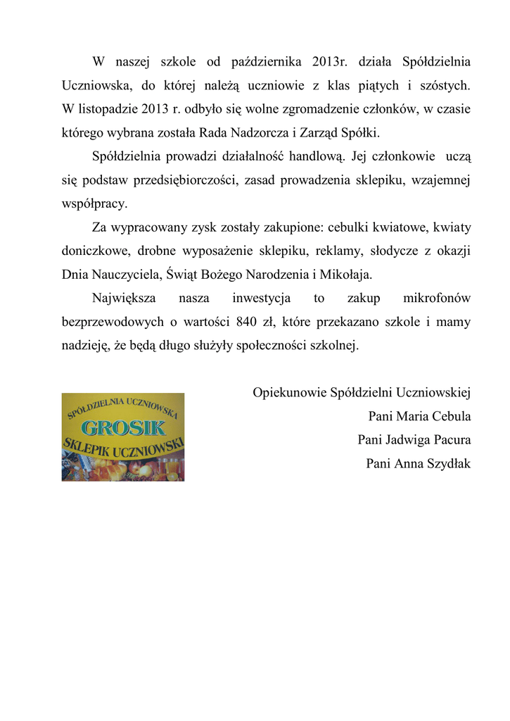 W naszej szkole od października 2013r. działa Spółdzielnia Uczniowska, do której należą uczniowie z klas piątych i szóstych. W listopadzie 2013 r. odbyło się wolne zgromadzenie członków, w czasie którego wybrana została Rada Nadzorcza i Zarząd Spółki. Spółdzielnia prowadzi działalność handlową. Jej członkowie uczą się podstaw przedsiębiorczości, zasad prowadzenia sklepiku, wzajemnej współpracy. Za wypracowany zysk zostały zakupione: cebulki kwiatowe, kwiaty doniczkowe, drobne wyposażenie sklepiku, reklamy, słodycze z okazji Dnia Nauczyciela, Świąt Bożego Narodzenia i Mikołaja. Największa nasza inwestycja to zakup mikrofonów bezprzewodowych o wartości 840 zł, które przekazano szkole i mamy nadzieję, że będą długo służyły społeczności szkolnej. Opiekunowie Spółdzielni Uczniowskiej Pani Maria Cebula Pani Jadwiga Pacura Pani Anna Szydłak