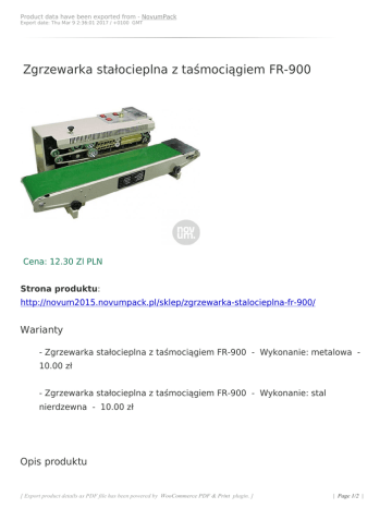 Product data have been exported from - NovumPack Export date: Thu Mar 9 2:36:01 2017 / +0100 GMT Zgrzewarka stałocieplna z taśmociągiem FR-900 Cena: 12.30 Zl PLN Strona produktu: http://novum2015.novumpack.pl/sklep/zgrzewarka-stalocieplna-fr-900/ Warianty - Zgrzewarka stałocieplna z taśmociągiem FR-900 - Wykonanie: metalowa 10.00 zł - Zgrzewarka stałocieplna z taśmociągiem FR-900 - Wykonanie: stal nierdzewna - 10.00 zł Opis produktu [ Export product details as PDF file has been powered by WooCommerce PDF & Print plugin. ] | Page 1/2 | Product data have been exported from - NovumPack Export date: Thu Mar 9 2:36:01 2017 / +0100 GMT Zgrzewarka stałocieplna FR-900 może zgrzewać woreczki w pozycji poziomej lub pionowej. Może być również postawiona na nóżkach. Urządzenie to w odróżnieniu od zwykłych zgrzewarek, może obsługiwać kilka woreczków jednocześnie co znacznie zwiększa ilość zgrzanych opakowań. Zgrzewarka stałocieplna FR-900 umożliwia maksymalne przyspieszenie procesu pakowania oraz znakowania Państwa produktów. Maszyna wykonuje zgrzew o szerokości 10 mm za pomocą dwóch listew stałocieplnych, o fakturze kwadratów o wymiarach 0,5 mm x 0,5 mm. Dodatkowym atutem urządzenia jest praktycznie nieograniczona szerokość woreczka. - Max ilość czcionki w numeratorze termicznym do 39 znaków - Max ciężar worka: 3 kg - Prędkość taśmy: 0-12 m/min - Długość i szerokość taśmy : 74 cm x 13 cm - Max. Wysokość worka 20 cm - Drukowanie Czcionka na kole Do 39 znaków - Temperatura zgrzewu Max. 300°C - Długość zgrzewu: dowolna Szerokość zgrzewu: 10 mm - Posiada dodatkowy system chłodzenia - Odcinanie zgrzewu: nie - Wymiary: 800 x 400 x 430 mm Specyfikacja - Długość zgrzewu: ∞ - Szerokość wykonywanego zgrzewu: 10 mm - Zasilanie: 230V 50Hz - Metoda zgrzewania: stałocieplna - Gwarancja: 24 m-ce - Wykonanie: metalowa, stal nierdzewna [ Export product details as PDF file has been powered by WooCommerce PDF & Print plugin. ] | Page 2/2 |