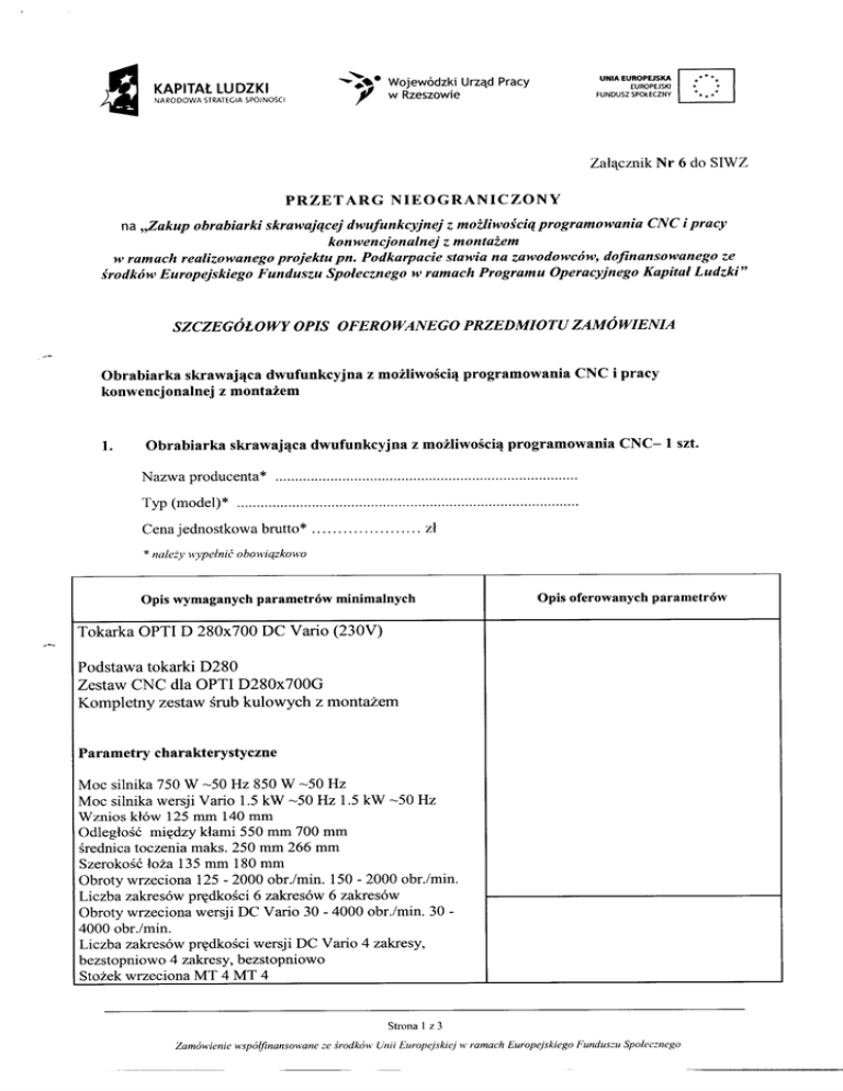 KAPITAŁ .._"':• • Wojewódzki Urząd Pracy w Rzeszowie UNIA EUROPEJSKA Jl LUDZKI NARODOWA STRATEGIA SPÓJNOŚCI EUROPEJSKI FUNDUSZ SPOŁECZNY Załącznik ...... * * * ** Nr 6 do SIWZ PRZETARG NIEOGRANICZONY na ,,Zakup obrabiarki skrawającej dwufunkcyjnej z możliwością programowania CNC i pracy konwencjonalnej z montażem w ramach realizowanego projektu pn. Podkarpacie stawia na zawodowców, dofinansowanego ze środków Europejskiego Funduszu Społecznego w ramach Programu Operacyjnego Kapitał Ludzki" SZCZEGÓŁOWY OPIS OFEROWANEGO PRZEDMIOTU ZAMÓWIENIA Obrabiarka skrawająca dwufunkcyjna z konwencjonalnej z montażem 1. Obrabiarka skrawająca możliwością programowania CNC i pracy dwufunkcyjna z możliwością programowania CNC-1 szt. Nazwa producenta* ............................................................................ . Typ (model)* ...................................................................................... . Cena jednostkowa brutto* ..................... zł *należy wypełnić obowiązkowo Opis wymaganych parametrów minimalnych Opis oferowanych parametrów Tokarka OPTI D 280x700 DC Vario (230V) Podstawa tokarki D280 Zestaw CNC dla OPTI D280x700G Kompletny zestaw śrub kulowych z montażem Parametry charakterystyczne Moc silnika 750 W ~50 Hz 850 W ~50 Hz Moc silnika wersji Vario 1.5 kW ~50 Hz 1.5 kW ~50 Hz Wznios kłów 125 mm 140 mm Odległość między kłami 550 mm 700 mm średnica toczenia maks. 250 mm 266 mm Szerokość łoża 135 mm 180 mm Obroty wrzeciona 125 - 2000 obr.Imin. 150 - 2000 obr.Imin. Liczba zakresów prędkości 6 zakresów 6 zakresów Obroty wrzeciona wersji DC Vario 30 - 4000 obr.Imin. 30 4000 obr.Imin. Liczba zakresów prędkości wersji DC Vario 4 zakresy, bezstopniowo 4 zakresy, bezstopniowo Stożek wrzeciona MT 4 MT 4 Strona I z 3 Zamówienie współfinansowane ze środków Unii Europejskiej w ramach Europejskiego Funduszu Społecznego wrzeciona 26 mm 26 mm Przesuw suportu górnego 70 mm 60 mm Przesuw suportu poprzecznego 11 O mm 160 mm Stożek konika MT 2 MT 2 Wysuw tulei konika 65 mm 85 mm Posuw wzdłużny 0.07 /0.2 mm/obr. 0.0710.2 mm/obr. Podział gwintu metryczny 0.2/3.5 mm/obr. 0.2/3.5 mm/obr. Podział gwintu calowy 56 - 8 ustawień gwintu/I" 56 - 8 ustawień gwintu/I" Wysokość gniazda nożowego (maks.) 13 mm (maks.) 13.5 mm Wymiary gabarytowe Długość x szerokość x wysokość 1250 x 585 x 475 mm 1370 x 640 X 535 mm Długość x szerokość x wysokość DC Varia 1250 x 650 x 420 mm 1370 x 660 x 440 mm Masa netto 125 kg 180 kg Wyposażenie standardowe Uchwyt trójszczękowy 0 125 mm, kieł stały MT2, kieł stały MT4, osłona przed rozbryzgami chłodziwa, zbiornik na wióry, osłona uchwytu tokarskiego, nóż tokarski HSS, zabierak, czterogniazdowy imak nożowy zestaw kół zmianowych, narzędzia serwisowe, protokół odbioru technicznego Prześwit 1. Sterowanie CNC Oś X Skład zestawu: · 1 x sterownik CNC VI · 2 x karty sterujące 40 V · 1 x czujnik referencyjny · 1 x zestaw CNC MK D24DP Skład zestawu MK D24DP · Silnik krokowy bipolarny Oś X 2,2 Nm · Silnik krokowy bipolarny Oś Z 4,2 Nm · 2 x korpus z osłoną · 2 x pasek napędowy · 4 x koła napędowe · Wałek przedłużający ·Uszczelnienie · Kabel ekranowany 5 m · Zestaw śrub montażowych ·Instrukcja montażu Oś Z Skład ·1x ·2x ·1x · 1x zestawu: sterownik CNC VI karty sterujące 40 V czujnik referencyjny zestaw CNC MK D21DP Strona 2 z 3 Zamówienie współfinansowane ze środków Unii Europejskiej w ramach Europejskiego Funduszu Społecznego zestawu MK D21DP · Silnik krokowy bipolarny Oś X 2,2 Nm · Silnik krokowy bipolarny Oś Z 4,2 Nm · 2 x korpus z osłoną · 2 x pasek napędowy · 4 x koła napędowe · Wałek przedłużający · Uszczelnienie · Kabel ekranowany 5 m · Zestaw śrub montażowych ·Instruk cja montażu Skład W powyższej tabeli obowiązkowo należy wypełnić wszystkie białe pola. UWAGA: W tabelach powyżej Wykona wca wymagane w nagłówkach tabel. obowiązkowo musi ........................... , dn ............... r. wypełnić wszystkie białe pola, podając podpis i pieczątka imienna upełnomocnionego przedstawiciela (przedstawicieli) ft'.vkonawcy miejscowość Strona 3 z 3 Zamówienie współfinansowane dane ze środków Unii Europejskiej w ramach Europejskiego Funduszu Społecznego